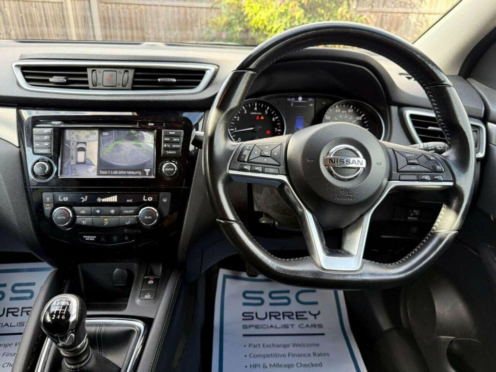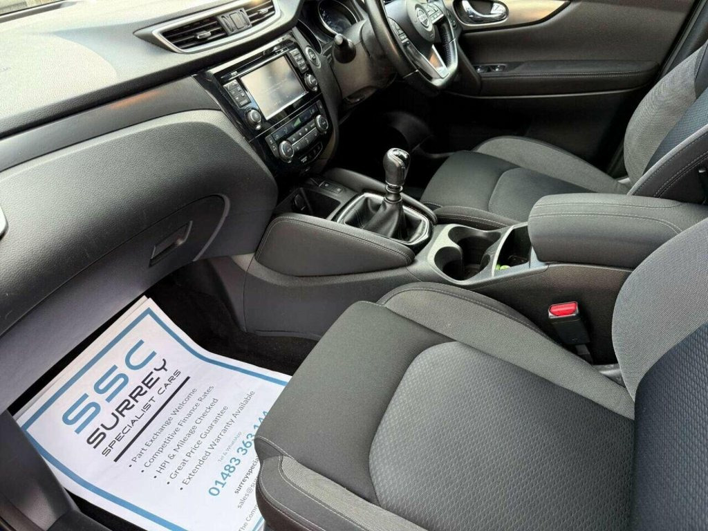 Surrey Specialist Cars are proud to present our lovely Nissan Qashqai N-Connecta DIG-T. This amazing car comes with Full Service History from the Main Dealer, finished in stunning metallic blue with grey contrast interior. The car will come with Long MOT so it will be ready to go. The 1.2L Petrol engine offers superb economy at over 50 MPG on combined cycle. Features Include Multifunction Steering Wheel, Trip Computer, Satellite Navigation, Parking Camera, Parking Sensors, Cruise Control, Speed Limiter, Stereo/Phone Control, FM/DAB Radio, Bluetooth Audio, USB Input, AUX Input, CD Player, Dual Zone Climate Control, 12V Charging Socket, Electronic Hand Brake, Auto Hold System, 6 Speed Manual Gearbox, Electric Windows, 18 Inch Alloy Wheels and two Remote Control Keys to name a few. We are open 7 days a week, and prepare all of our cars to the highest standards. We have a Click & Collect option available, and can also arrange delivery on request. All cars are HPI clear and a full history report is provided with every car. We welcome any inspection and viewing is highly recommended. All cars are available with our AA warranty starting from just ?150 for 3 months. Debit and credit card facilities are available and we offer competitive finance packages. If you have any questions or would like to view any of our cars give us a call or drop us a message on whatsapp 01483 363 144 to arrange an appointment with one of our team. We also offer full bespoke walkaround videos on request. W 18in Alloy Wheels - Bi-Colour, 3 Height Adjustable Rear Headrests, 6 Speakers, 60-40 Split Rear Folding Seats, AM-FM Radio and CD Player, AUX Socket, Advanced Drive Assist Display - 5in TFT , Ambient Lighting Centre Console, Anti Dazzle Rear View Mirror, Auto Wipers, AutoHold Function - Stand Still Assist, Bluetooth, Body Coloured Door Mirrors, Body Coloured Handles, Boot Light, Chrome Glass Surround, Chrome Interior Door Handles, Cruise Control with Speed Limiter, DAB Digital Radio, Daytime Running Lights Dip Function When, Driver Seat Height Adjustment, Driver-Passenger-Side and Curtain Airbag, Drivers Seat with Manual Lumbar Support, Dual Zone Climate Control Air Conditioni, ESP ABS EBD a