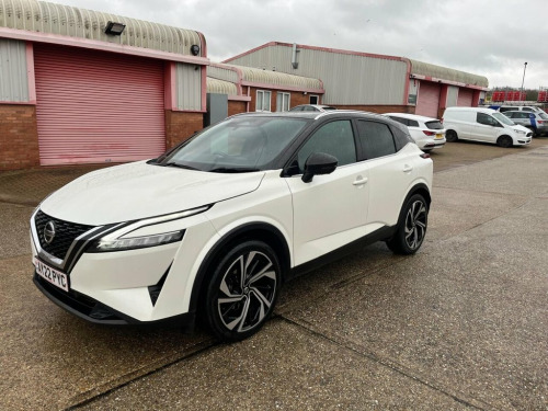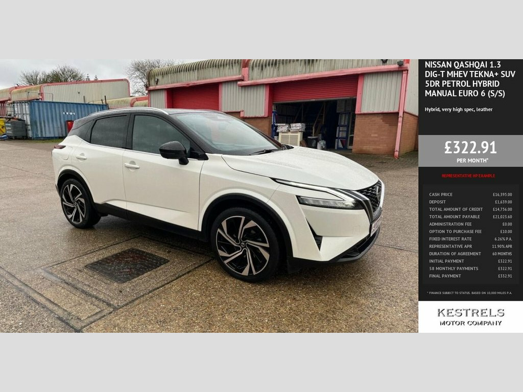This 2022 Nissan Qashqai DIG-T Tekna+ is a superb example, dealer service history and has been cherished by just one owner since new. New service and MOT included in the price.This Euro 6 compliant model boasts a 1.3 litre petrol hybrid engine, offering an efficient and responsive driving experience. The Tekna+ trim level ensures a premium feel with leather interior packed with notable features designed for comfort and convenience. The Qashqai is renowned for its practicality and style, and this particular DIG-T Tekna+ variant stands out. Its advanced 1.3 litre petrol hybrid engine, combined with its Euro 6 emissions rating, signifies a commitment to modern, cleaner motoring. The single owner provenance suggests meticulous care and attention, making this 2022 model a compelling choice for those seeking a well maintained and feature rich family car. Part exchange welcome, finance arranged. 12v Power Sockets in Dash and Luggage Sp, 20in Alloy Wheels - Diamond Cut, 3 Rear Headrests, 3 x 3-Point Rear Seatbelts, 60-40 Split Rear Folding Seats, ABS with EBD and Brake Assist, Active Brake Limited Slip, Advanced Intelligent Key with Driver Mem, Advanced Windscreen Head Up Display, AM-FM Audio System with DAB, Arctic White, Auto Dimming Rear View Mirror, Auto Hold Function, Auto Rear Wiper When Reversing, Automatic Dual Zone Climate Control with, Blind Spot Warning, Bluetooth with Audio Streaming, Body Coloured Handles, Body Coloured Mirror Caps, Body Side Moulding, Bose Pack, Chrome Interior Door Handles, Chrome Side Window Finisher, Curtain Airbags, Dark Headlining, Door Mirror - El