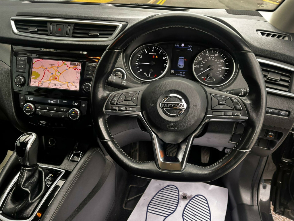 SAT NAV, CRUISE CONTROL, 360 CAMERAS, PARKING SENSORS, REVERSING CAMERA, AUTO WIPERS, FULL ELECTRIC WINDOWS & FOLDING MIRRORS, AUTO LIGHTS, LANE ASSIST, ECO MODE, COLLISION MODE, BLIND SPOT ASSIST, 18'' ALLOYS, ISOFIX SEATS, KEYLESS ENTRY & GO, PRIVACY GLASS, 2 KEYS & MUCH MORE, DRIVES FAULTLESS, LONG MOT, HPI CLEAR, READY TO GO, BARGAIN, PARTS AND LABOUR NATIONWIDE WARRANTY, 5 DAYS DRIVE AWAY INSURANCE, CALL US TO ARRANGE DELIVERY, ANY INSPECTIONS ARE WELCOME, PART EX WELCOME. 18in Alloy Wheels, 3 Height Adjustable Rear Headrests, 6 Speakers, 60-40 Split Rear Folding Seats, AM-FM-CD Audio System with DAB, AUX Socket for MP3 Player, Advanced Drive Assist Display - 5in TFT Coloured Screen, Ambient Lighting Centre Console, Auto Wipers, Bluetooth with Audio Streaming, Body Coloured Door Mirrors, Body Coloured Handles, Boot Light, Centre Console Storage and Armrest, Chrome Glass Surround, Chrome Interior Door Handles, Cruise Control with Speed Limiter, Daytime Running Lights Dip Function When Turn Signal Applied, Driver Seat Height Adjustment, Driver-Passenger-Side and Curtain Airbags, Drivers Seat with Manual Lumbar Support, Dual Zone Climate Control Air Conditioning, ESP ABS EBD and Brake Assist, Electric Heated Auto-Folding Door Mirrors, Electric Parking Brake, Electric Speed-Sensitive Power Steering, Front 12v Power Sockets x2, Front Fog Lights, Front and Rear Door Pockets with Drink Holders, Front and Rear Electric Windows, Front and Rear Seat Belts with Load Limiter and Pretensioners, Front and Rear Seatbelt Warning, Glossy Black Dash Trim, Halogen Headlamps, Height Adjustable Front Head Restraints, Height Adjustable Front Seatbelts, Hill Start Assist, ISOFIX Child Seat Anchoring Points - Rear x2, Intelligent Around View Monitor, Intelligent Auto Headlight, Intelligent Park Assist, Interior Ambient Lighting, LED Daytime Running Lights, Leather D Shaped Steering Wheel, Leather Gear Lever, Leather Knee Pad, Luggage Board System, Matt Silver Roof Rails, Nissan Anti Theft System Immobiliser, Nissan Chassis Controls, Nissan Connect 7in Touchscreen Navigation and Entertainment System, Nissan Intelligent Key, One Touch 4 x Auto Windows with Illuminated Switches, Outside Temperature Sensor, Parcel Shelf - Stow Function Under Luggage Board, Passenger Airbag Deactivation System, Passengers Seat with Manual Lumbar Support, Pollen Filter, Puncture Repair Kit, Rear Door Child Locks, Rear Roof Spoiler, Rear USB Port, Rear View Camera, Rear Wiper with Reverse Link, Remote Audio Control, Remote Central Locking with Superlocking, Safety Shield Plus, Seats - Passengers Height Adjustment, Selectable Steering - Normal or Sport, Smart Vision Pack, Smartphone App Integration, Start Push Button, Steering Wheel Mounted Audio Controls, Synthetic Leather Wrapped Door Handle with Contrasting Stitching, TPMS - Tyre Pressure Monitoring System, Tech Pack, Thatcham Category 1 Alarm, Tilt and Telescopic Adjustable Steering Wheel, Trip Computer, USB Port, Underbody Vortex Generators. Full service history