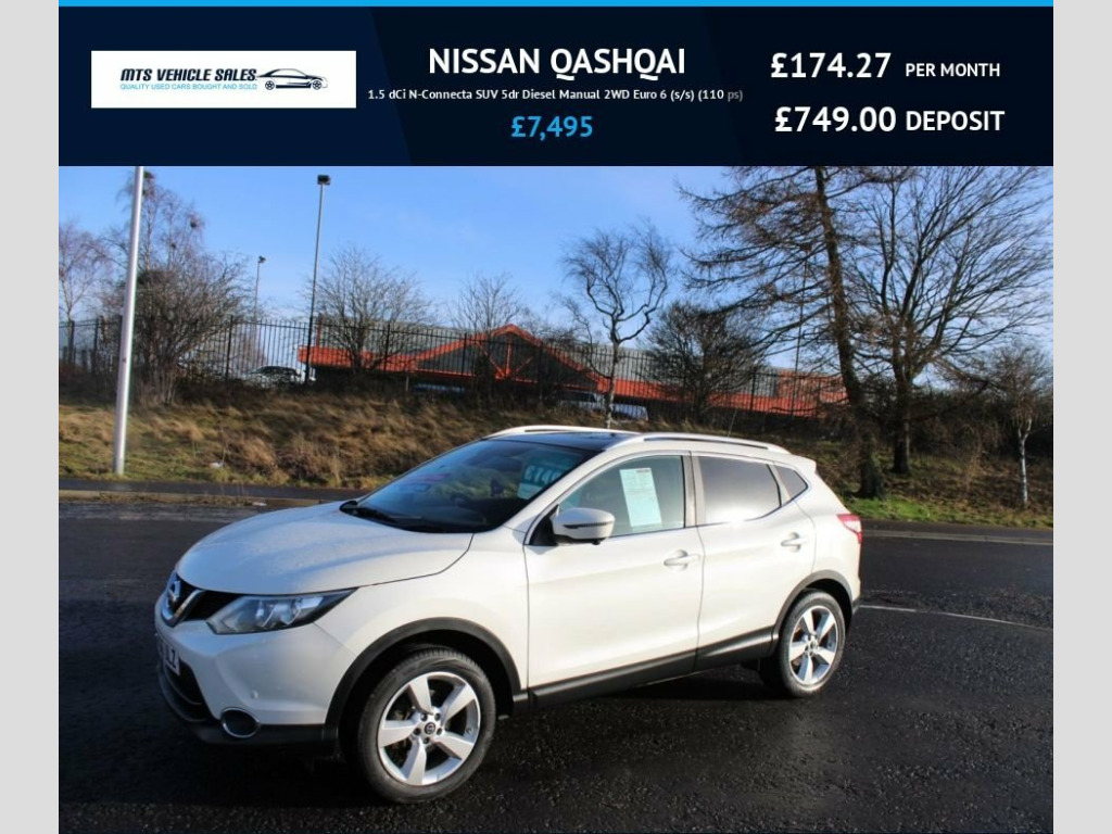Very Tidy Example of This Popular Qashqai,This N-CONNECTA Model Comes With Great Spec Including 18* Alloy Wheels,Glass Roof,,Electric Windows,Remote Central Locking(2 keys) Air Con,Cruise Control,Privacy Glass,DAB,Front&Rear Parking Sensors,Sat Nav,Cruise Control,Bluetooth,Reverse Camera&360 Cameras,,Very Economical 1.5DCi 6 Speed Returns an average of 74mpg ,Looks Superb in Pearlescent Whiter,Excellent Looking and Driving Vehicle,Ulez Compliant, 18in Alloy Wheels - Diamond Cut, 3 x 3-Point Rear Seatbelts with ELR, 5in High Definition Full Colour TFT Scre, 6 Speakers, 60-40 Split Rear Folding Seats, Alarm, Automatic Folding Door Mirrors, Automatic Lights and Wipers, AUX Socket for MP3 Player, Black Honeycomb Front Grille, Bluetooth, Body-coloured Bumpers - Handles and Mirr, CD Radio, Chrome Glass Surround, Cruise Control with Speed Limiter, Drive Computer, Driver Seat Height Adjustment, Driver-Passenger-Side and Curtain Airbag, Drivers Side One-touch and Anti-trap Win, Dual Zone Climate Control Air Conditioni, e-PKB - Electric Parking Brake, Electric Speed-Sensitive Power Steering, ESP ABS EBD and Brake Assist, Front and Rear Electri