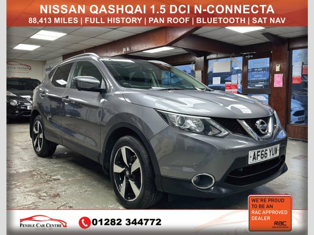 88,413 miles | Full Service History | Pan Roof, 360 Camera, ULEZ This Nissan Qashqai N-Connecta has covered 88,413 miles and comes with service history at 13,579, 26,536, 40,075, 46,563, 53,947, 53,917, 61,222, 68,619, 76,607, and 86,346 miles. Supplied with two keys and MOT valid until 26/10/2026. Finished in white and sitting on 18" alloy wheels, this Euro 6, ULEZ-compliant model offers excellent practicality and specification. Features include sat nav, 360° camera, reverse camera, front and rear parking sensors, cruise control with speed limiter, and Bluetooth connectivity. Further highlights include a panoramic glass roof (non-opening), rear privacy glass, keyless start, power-folding mirrors, auto headlights, rain-sensing wipers, front fog lights, air conditioning, stop/start system, USB/AUX/12V ports, and a multifunction steering wheel. A well-equipped and economical SUV ready for family or motorway use. Comes complete with a full inspection and is HPI clear. Includes 3 months RAC Warranty, 82-point RAC Approved Inspection, and 12 months RAC Breakdown Cover. Part exchange welcome, finance options available, and nationwide delivery can be arranged. Any inspection or test drive welcome. Contact us today to reserve this high-spec Qashqai. 18in Alloy Wheels - Diamond Cut, 3 x 3-Point Rear Seatbelts with ELR, 5in High Definition Full Colour TFT Scre, 6 Speakers, 60-40 Split Rear Folding Seats, Alarm, Automatic Folding Door Mirrors, Automatic Lights and Wipers, AUX Socket for MP3 Player, Black Honeycomb Front Grille, Bluetooth, Body-coloured Bumpers - Handles and Mirr, CD Radio, Chrome Glass Surround, Cruise Control with Speed Limiter, Drive Computer, Driver Seat Height Adjustment, Driver-Passenger-Side and Curtain Airbag, Drivers Side One-touch and Anti-trap Win, Dual Zone Climate Control Air Conditioni, e-PKB - Electric Parking Brake, Electric Speed-Sensitive Power Steering, ESP ABS EBD and Brake Assist, Front and Rear Electri