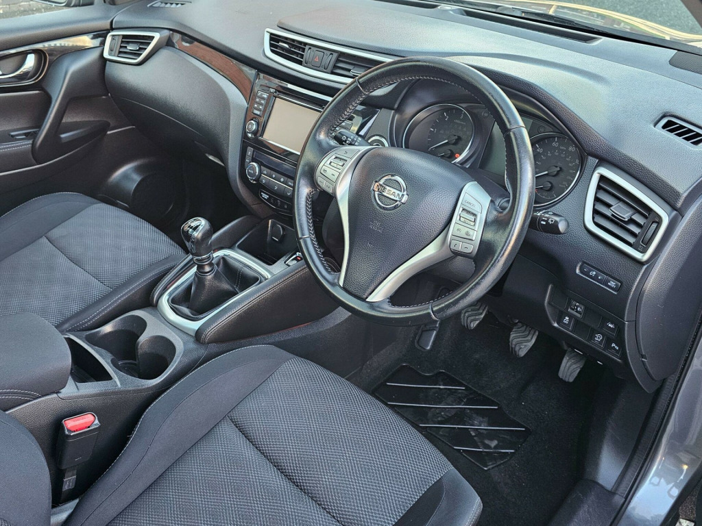 THIS GREAT EXAMPLE OF THE QASHQAI HAS IT'S CAMBELT DONE AT 62K MILES AND IS PRESENTED IN METALLIC GREY WITH CHROME HIGHLIGHTS, COMPLEMENTED BY 18'' DIAMOND CUT ALLOY WHEELS. THE RELIABLE AND ECONOMICAL 1.5 DCI ENGINE IS CONNECTED TO AN EASY-CHANGING MANUAL GEARBOX MAKING THIS CAR A PLEASURABLE DRIVE WHETHER AROUND TOWN OR ON THE MOTORWAY. INSIDE, THE COMFORTABLE SEATS ARE TRIMMED IN CHARCOAL GREY AND LIGHT GREY CLOTH WITH GLOSS BLACK ACCENTS TO THE DOORS AND DASHBOARD WITH THE INTERIOR MADE LIGHTER BY THE INCLUSION OF A PANORAMIC GLASS ROOF. INFOTAINMENT IS VIA THE 7'' NISSAN CONNECT TOUCHSCREEN WITH SATELLITE NAVIGATION, DAB RADIO, BLUETOOTH STREAMING AND TELEPHONE, 360 BIRD VIEW CAMERA, REVERSING CAMERA AND MORE. THERE IS ALSO A 5'' HIGH DEFINITION SCREEN IN THE INSTRUMENT CLUSTER, AUTOMATIC LIGHTS AND WIPERS, CRUISE CONTROL , FACTORY-FITTED REAR PRIVACY GLASS AND MANY MORE FEATURES YET TO BE DISCOVERED.WE HAVE FULLY INSPECTED AND SERVICED THIS CAR, SO THE ONLY ISSUE FOR ITS NEW OWNER WILL BE WHERE THE NEXT TRIP SHOULD BE. PLEASE CALL 0161 761 3452 (OPTION 2) TO ARRANGE A VIEWING, TO RESERVE THE CAR OR FOR MORE INFORMATION. WHILST EVERY EFFORT HAS BEEN MADE TO ENSURE THAT THE STATED SPECIFICATION IS ACCURATE, PLEASE CHECK WITH A MEMBER OF THE SALES TEAM IF A PARTICULAR SPECIFICATION/FEATURE IS IMPORTANT TO YOU.. 18in Alloy Wheels - Diamond Cut, 6 Speakers, 60-40 Split Rear Folding Seats, ABS - Anti Lock Brakes, AUX-In Socket, Airbag - Driver, Airbag - Passenger, Airbags - Curtain, Airbags - Side, Alarm, Armrest - Rear, Around View Monitor - 360 Bird-View, Auto Dimming Rear View Mirror, Auto Rain Sensing Wipers, Black Honeycomb Front Grille, Body Coloured Handles, Brake Assist, Bumpers - Body Coloured, Chrome Glass Surround, Climate Control - Dual Zone, Colour Side Camera, Cruise Control with Speed Limiter, DAB Radio, Door Mirrors - Body Coloured, Door Mirrors - Power Fold and Heated, Driver Seat Height Adjustment, EBD - Electronic Brakeforce Distribution, ESP - Electronic Stability Programme, Electric Speed-Sensitive Power Steering, Front Armrest, Front Collision Avoidance, Front Fog Lights, Front and Rear Electric Windows, Head Restraints - Active Front, Head Restraints - Rear, Headlights - Auto, Headlights - Auto High-Low Beam, Hill Start Assist, ISOFIX Childseat Anchorage Points - Middle Row Outer Seats, Immobiliser, Intelligent Key, Interior Ambient Lighting, LED Daytime Running Lights, Lane Departure Warning, Leather Gear Knob, Leather Steering Wheel, Luggage Board System, Lumbar Support, Panoramic Glass Roof, Parking Sensor - Front, Pollen Filter, Puncture Repair Kit, Push Start-Stop Button, Radio-CD, Rear Cupholder, Rear Door Child Locks, Rear Parking Sensor, Rear Privacy Glass, Roof Rails - Satin, Satellite Navigation - Nissan Connect, Seats - Passengers Height Adjustment, Smart Vision Pack, Speed-Sensitive Autolock Function, Steering Wheel Mounted Audio Controls, TPMS - Tyre Pressure Monitoring System, Telephone - Bluetooth Integration, Tilt and Telescopic Adjustable Steering Wheel, Touch Screen 7in, Traction Control, Traffic Sign Recognition, Trip Computer, USB Port, e-PKB - Electric Parking Brake, Cloth - Graphite.