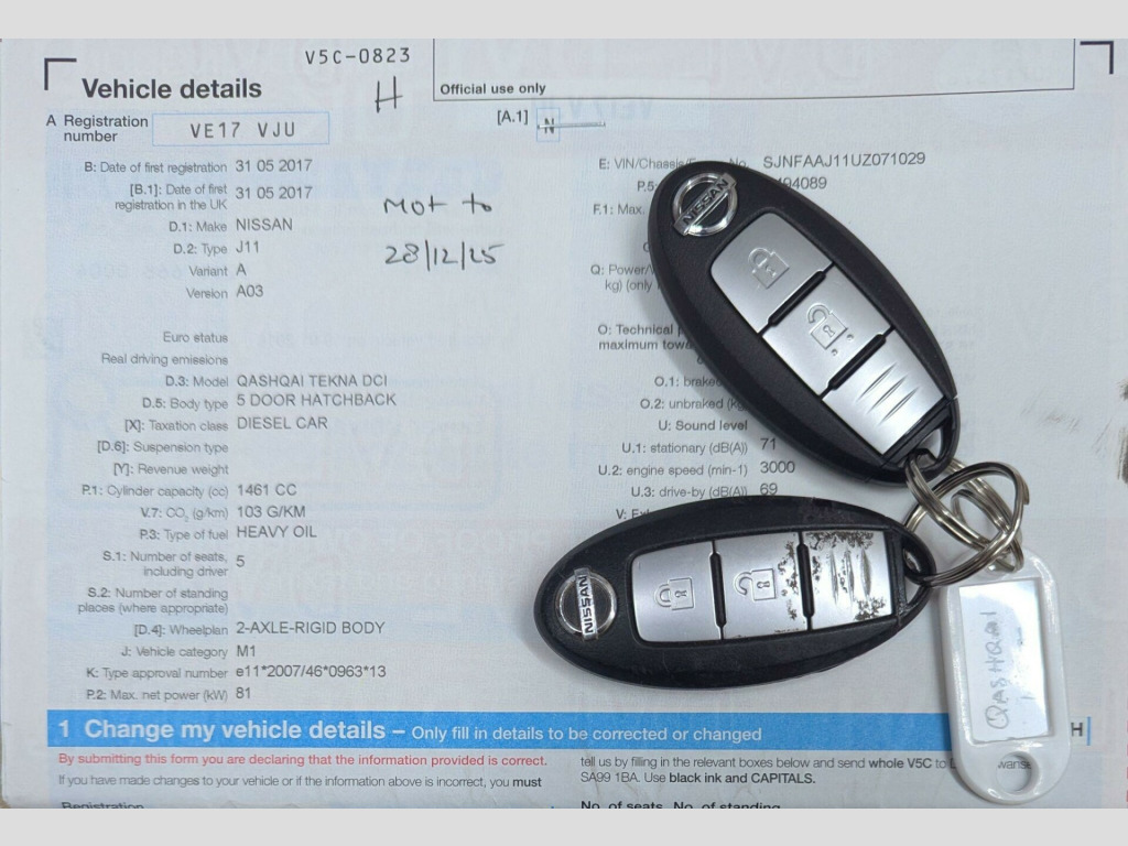 This 2017 Nissan Qashqai dCi Tekna is a well maintained example, offering a blend of practicality and comfort. Powered by an efficient 1.5L Diesel engine, this Euro 6 compliant model is designed for economical driving. The Tekna trim level ensures a generous specification, including Bi-LED headlights for excellent visibility, Bluetooth connectivity for seamless audio and calls, and an Intelligent Key system for keyless entry. Comfort is further enhanced by the Heat Pack and Executive Pack, which include heated seats, making every journey more pleasant.This Qashqai stands out with its impressive fuel economy, achieving a highlight of 71 mpg, which indicates it is more economical than many similar vehicles. Furthermore, its low insurance group rating suggests that running costs will be kept to a minimum. The vehicle also boasts low CO2 emissions, demonstrating its environmental consideration compared to other cars in its class.This above average car is in wonderful condition, having obviously been cherished by the last owner. It has the benefit of a full service history to give the maximum reliability. View All Our Stock At; www.eurocarscastleford.com DELIVERY IS AVAILABLE WITH A 14 DAY COOLING OFF PERIOD, EMAIL YOUR POST CODE FOR A PERSONALISED QUOTATION AND TERMS. LOW RATE FINANCE IS AVAILABLE ON THIS CAR, PLEASE ASK. All figures quoted are the manufacturers figures. Errors and omissions are expected, this description and specification are AI generated and may be wrong, customers should ensure the actual car specification meets their requirements before purchase as mistakes cannot be rectified after purchase.. 19in Alloy Wheels - 5-Spoke, 3 x 3-Point Rear Seatbelts with ELR, 5in High Definition Full Colour TFT Screen Combimeter, 6 Speakers, 60-40 Split Rear Folding Seats, AUX Socket for MP3 Player, Alarm, Automatic Folding Door Mirrors, Automatic Lights and Wipers, Black Honeycomb Front Grille, Bluetooth, Body-coloured Bumpers - Handles and Mirrors, CD Radio, Chrome Glass Surround, Cruise Control with Speed Limiter, Drive Computer, Driver Seat Height Adjustment, Driver-Passenger-Side and Curtain Airbags, Drivers Side One-touch and Anti-trap Window, Dual Zone Climate Control Air Conditioning, ESP ABS EBD and Brake Assist, Electric Speed-Sensitive Power Steering, Executive Pack, Front Centre Console and Armrest, Front Fog Lamps with Chrome Ring, Front Seat Belt Height Adjustment, Front Seat Belts with Load Limiter and Pretensioners, Front and Rear Electric Windows, Head Restraints - 3 Rear, Headlights - Automatic Levelling, Headlights - Bi-LED, Heat Pack, Height Adjustable Front Head Restraints, Hill Start Assist, ISOFIX Child Seat Anchoring Points, Immobiliser, Intelligent Key, Intelligent Park Assist, Interior Ambient Lighting, LED Signature Daytime Running Lights, Leather Gear Knob, Leather Steering Wheel, Luggage Board System, Nissan Chassis Controls, Puncture Repair Kit, Push Start-Stop Button, Rear Door Child Locks, Rear Privacy Glass, Rear Seat Armrest with 2 Cupholders, Remote Audio Control, Roof Rails - Satin Silver, Safety Shield, Seats - Drivers Lumbar Support, Seats - Passengers Height Adjustment, Selectable Steering - Normal or Sport, Smart Vision Pack, TPMS - Tyre Pressure Monitoring System, Tech Pack, Tilt and Telescopic Adjustable Steering Wheel, e-PKB - Electric Parking Brake, Leather - Graphite. Full service history