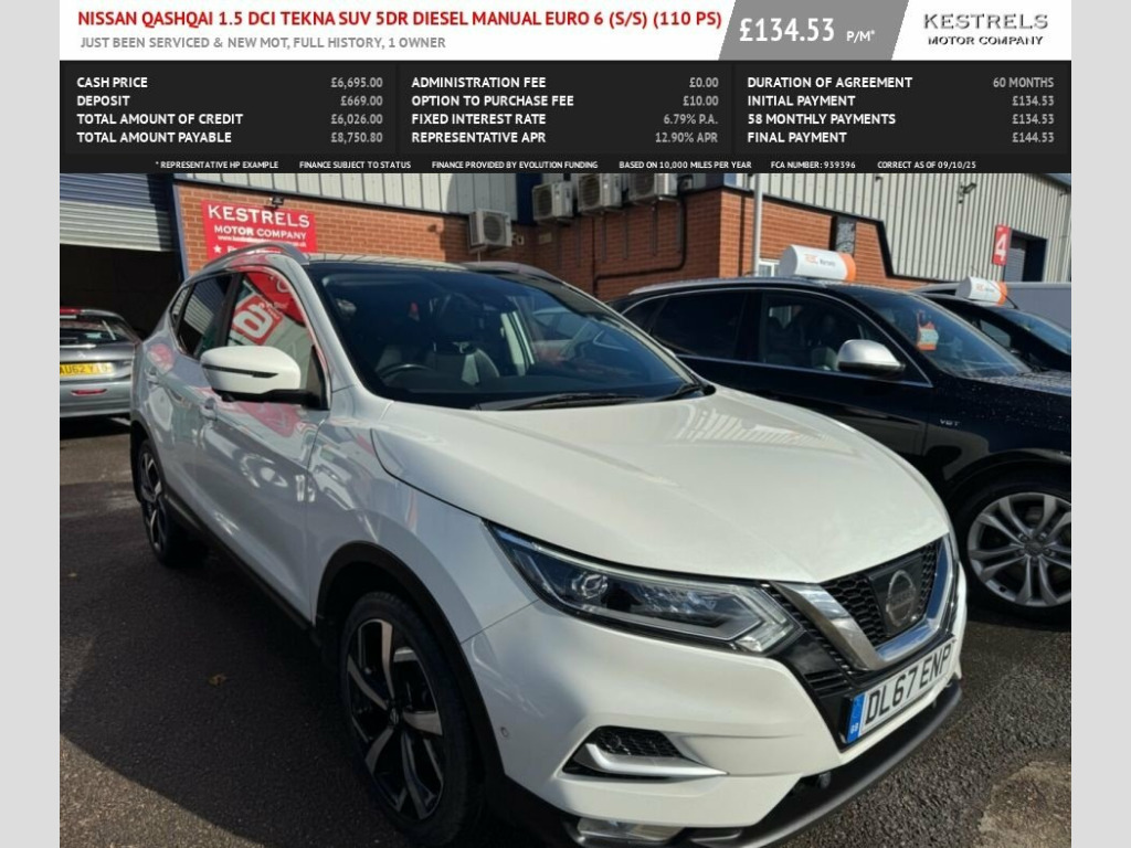 With service history and an MOT valid until August 2026, this 2017 Nissan Qashqai dCi Tekna offers excellent peace of mind. This popular family SUV is powered by an efficient 1.5L Diesel engine, meeting Euro 6 emissions standards. It boasts a clear vehicle history check and comes with a 3 month warranty for added confidence. This Qashqai Tekna is designed to be economical to run, achieving an impressive 74 mpg, which is a significant advantage over many other vehicles. Its low insurance group rating further contributes to its affordability, making it an attractive choice for many drivers. Additionally, its low CO2 emissions highlight its environmental consideration, setting it apart from less efficient alternatives. Comes with full panoramic roof, leather heated seats, great media system with satnav and 360 reversing camera etc Part exchange welcome, finance arranged. 18in Alloy Wheels, 19in Alloy Wheels, 3 Height Adjustable Rear Headrests, 60-40 Split Rear Folding Seats, Adaptive Front Lighting System, Advanced Drive Assist Display - 5in TFT , AM-FM Radio and CD Player, Ambient Lighting Centre Console, Anti Dazzle Rear View Mirror, Auto Wipers, AutoHold Function - Stand Still Assist, AUX Socket, Bluetooth, Body Coloured Door Mirrors, Body Coloured Handles, Boot Light, Bose 8 Speaker Premium Audio System, Carbon Graphite Dash Trim, Chrome Glass Surround, Chrome Interior Door Handles, Cruise Control with Speed Limiter, DAB Digital Radio, Daytime Running Lights Dip Function When, Driver Seat Height Adjustment, Driver-Passenger-Side and Curtain Airbag, Drive