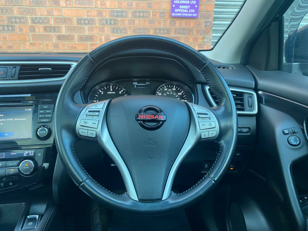LONG MOT+SERVICE HISTORYSERVICE INTERVALS AT 11K, 23K, 36K, 44K, 88K, 98K, 107KThis 2015 Nissan Qashqai dCi n-tec+ is a well maintained example offering excellent value. It features a 1.6 litre diesel engine and is a Euro 6 emission class vehicle. The n-tec+ trim level includes a host of useful features designed to enhance your driving experience. These include front and rear parking sensors for easier manoeuvring, and an Around View Monitor which provides a 360 degree bird's eye view of your surroundings, making parking simpler. You'll also appreciate the convenience of Intelligent Key with keyless entry, and the spacious feel created by the panoramic glass roof.This Qashqai stands out with its impressive fuel economy, achieving up to 55 miles per gallon, which indicates it is more economical than many similar vehicles. Furthermore, its low CO2 emissions and low insurance group highlight its cost effectiveness for everyday use. These factors combined make this Nissan Qashqai a sensible and appealing choice for those seeking a practical and efficient vehicle. in alloy wheels - diamond cut, 6 speakers, 60-40 split rear folding seats, abs - anti lock brakes, aux-in socket, airbag - driver, airbag - passenger, airbags - curtain, airbags - side, alarm, armrest - rear, around view monitor - 360 bird-view, auto dimming rear view mirror, auto rain sensing wipers, black honeycomb front grille, body coloured handles, brake assist, bumpers - body coloured, chrome glass surround, climate control - dual zone, colour side camera, cruise control with speed limiter, dab radio, door mirrors - body coloured, door mirrors - power fold and heated, driver seat height adjustment, ebd - electronic brakeforce distribution, esp - electronic stability programme, electric speed-sensitive power steering, front armrest, front collision avoidance, front fog lights, front and rear electric windows, head restraints - active front, head restraints - rear, headlights - auto, headlights - auto high-low beam, hill start assist, isofix childseat anchorage points - middle row outer seats, immobiliser, intelligent key, interior ambient lighting, led daytime running lights, lane departure warning, leather steering wheel, luggage board system, lumbar support, panoramic glass roof, parking sensor - front, pollen filter, puncture repair kit, push start-stop button, radio-cd, rear cupholder, rear door child locks, rear parking sensor, rear privacy glass, roof rails - satin, satellite navigation - nissan connect, seats - passengers height adjustment, smart vision pack, speed-sensitive autolock function, steering wheel mounted audio controls, tpms - tyre pressure monitoring system, telephone - bluetooth integration, tilt and telescopic adjustable steering wheel, touch screen 7in, traction control, traffic sign recognition, trip computer, usb port, e-pkb - electric parking brake