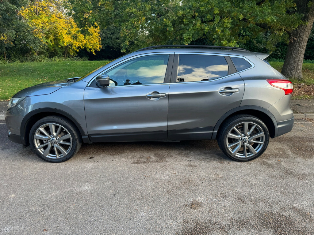 This 2014 Nissan Qashqai is a reliable and efficient SUV, with only 55469 miles on the clock and a powerful Diesel 1.6 dCi engine producing 130 BHP. With MOT valid until 04/12/2025, this 5-door vehicle comfortably seats 5 passengers and comes with a range of high-tech features including Around View Monitor, Blind spot monitoring, Bluetooth phone integration system, and Cruise Control. Its metallic paint and luxurious Tekna trim make it stand out from the crowd, while its 1 previous registered keeper ensures it has been well-maintained. For a stylish and practical SUV that is perfect for families or daily commuting, this Nissan Qashqai is the ideal choice., ound view monitor, blind spot monitoring, bluetooth phone integration system, cruise control, fatigue detection system, forward collision warning, front and rear parking sensors, intelligent parking assist, lane departure warning system, nissan connect sat nav system, pas, push button starter, service interval indicator, speed limiter, traffic sign recognition, trip computer, diesel particulate filter, 6 speakers, audio remote control, dab radio/cd player, usb/aux input socket, 2 speed wipers+variable intermittent wipe, automatic headlamp activation, bi led headlights with auto levelling, black honeycomb front grille, body colour bumpers, body colour door mirrors and handles, chrome window surround, electric folding and heated door mirrors, electric front/rear windows, front fog lights with chrome surrounds, heated windscreen, high beam assist, interior mirror with auto anti dazzle, led daytime running lights, panoramic sunroof with one touch shade, privacy glass, rain sensor windscreen wipers, rear privacy glass, rear wiper, satin silver roof rails, 12v socket, 60/40 split folding rear seat, ambient interior lighting, driver, driver/passenger front seatback pockets, dual zone climate control, electric driver, footwell ambient lighting, front armrest, front cupholders x 2, front headrests, front seat belt pre-tensioners with load limiters, heated front seats, height adjustable driver, illuminated glovebox, isofix child seat preparation, leather gearknob, leather steering wheel, leather upholstery, luggage area divider, map reading lamp, pollen filter, rake/reach adjustable steering wheel, rear armrest with 2 cupholders, rear headrests, abs, brake assist and ebd, child locks on rear doors, curtain airbags, driver/front passenger airbag, electronic parking brake, esp + traction control, height adjustable front seatbelts, hill start assist, side airbags, three 3 point rear seatbelts, tyre pressure monitoring system, alarm, immobiliser, intelligent key, remote central locking, 19'' alloy wheels, tyre puncture repair kit, 6 months rac warranty, free delivery service up to 100 miles., hand books, never been smoked in, no admin fees, part exchange a pleasure., tinted windows, two keys, 19'' Alloys