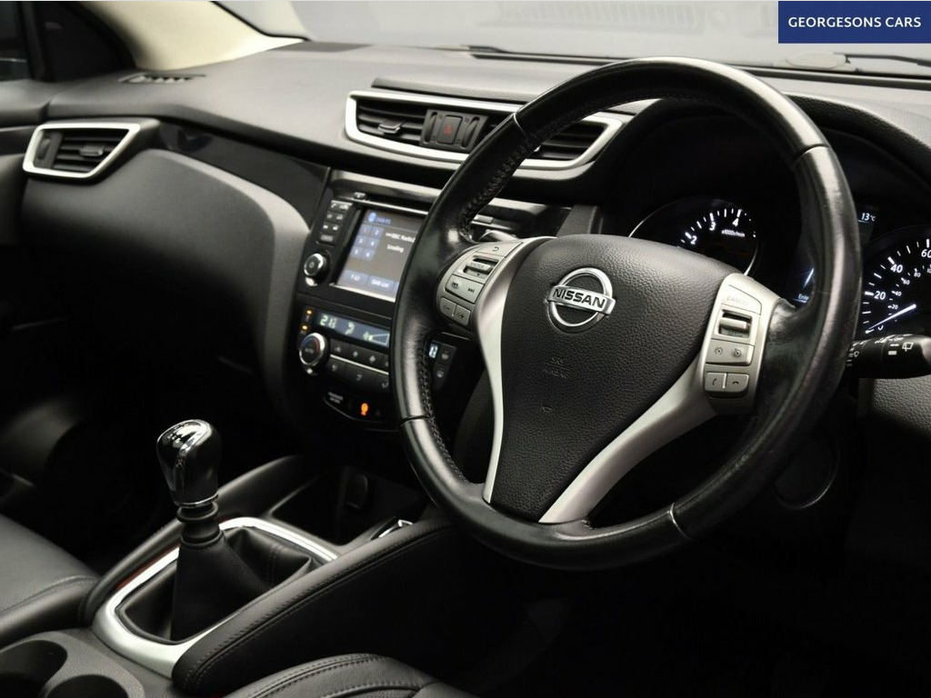 This Nissan Qashqai 1.6 DIG-T Tekna combines a punchy 1.6-litre turbo petrol engine with 163hp, delivering 0-62mph in 9.1 seconds and up to 45.6mpg in this front-wheel-drive setup with a precise 6-speed manual gearbox. The flagship Tekna trim brings full luxury with 19-inch alloys and premium leather interior. With five services, this Qashqai is in excellent condition. Enjoy the airy cabin with the panoramic glass roof, while integrated satellite navigation, Bluetooth and DAB radio keep you connected. Parking is effortless with reverse camera and front & rear parking sensors. Stay comfortable with dual-zone climate control, heated windscreen and electric heated front seats. Cruise control with speed limiter, lane assist and push-button start deliver relaxed, safe driving every day. The spacious five-door SUV includes a 504-litre boot. 3 x 3-Point Rear Seatbelts with ELR, 5in High Definition Full Colour TFT Scre, 6 Speakers, 60-40 Split Rear Folding Seats, Alarm, Automatic Folding Door Mirrors, Automatic Lights and Wipers, AUX Socket for MP3 Player, Black Honeycomb Front Grille, Bluetooth, Body-coloured Bumpers - Handles and Mirr, CD Radio, Chrome Glass Surround, Cruise Control with Speed Limiter, Drive Computer, Driver Seat Height Adjustment, Driver-Passenger-Side and Curtain Airbag, Drivers Side One-touch and Anti-trap Win, Dual Zone Climate Control Air Conditioni, e-PKB - Electric Parking Brake, Electric Speed-Sensitive Power Steering, ESP ABS EBD and Brake Assist, Executive Pack, Front and Rear Electric Windows, Front
