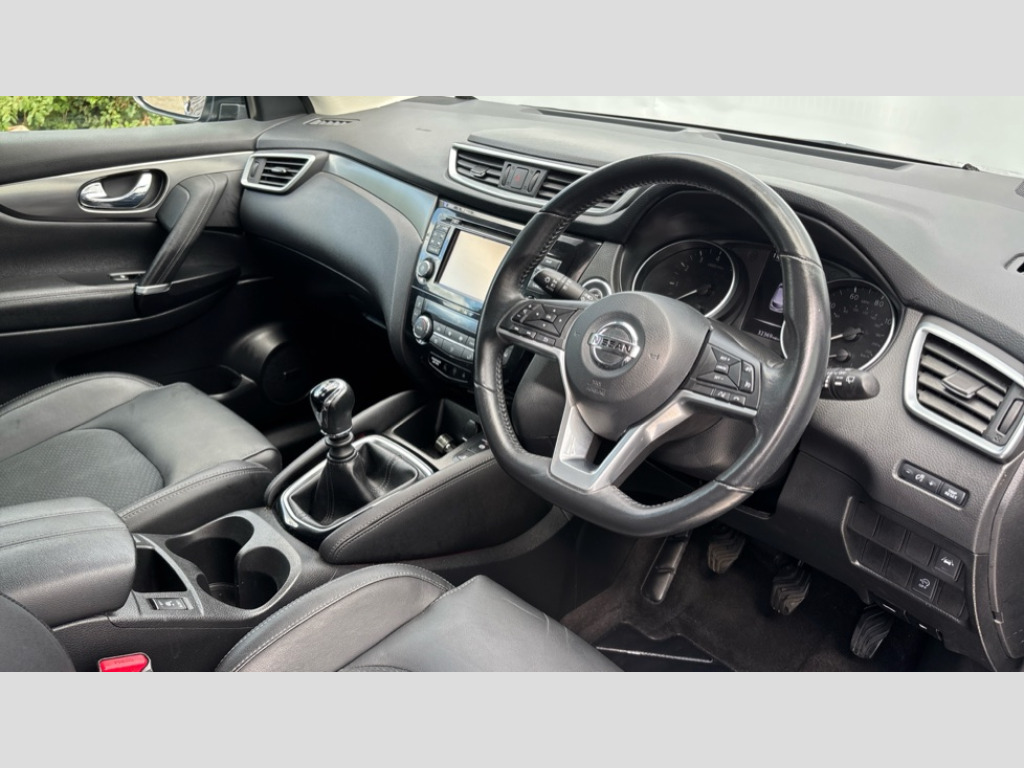 Nissan Qashqai 1.2 DiG-T Tekna 5dr 5" TFT driver information centre, Around View Monitor, Blind spot monitoring, Bluetooth phone integration system, Cruise control, Electric speed sensitive power steering, Front and rear parking sensors, Intelligent parking assist, Lane departure warning system, Nissan connect sat nav system, Outside temperature display, Push button starter, Rear view camera, Service interval indicator, Speed limiter, Traffic sign recognition, Trip computer, 'Shark fin' mobile antenna, Bose premium 8 speaker system, DAB Digital radio, Radio/CD, Smartphone apps, Steering wheel mounted audio controls, USB/aux input socket, Automatic headlamp activation, Body colour bumpers, Body colour door handles, Body colour door mirrors, Chrome window surround, Electric folding and heated door mirrors, Front fog lights, High beam assist, Interior mirror with auto anti dazzle, LED indicators in door mirrors, Matt silver roof rails, One touch electric front/rear windows, Privacy glass, Rain sensor windscreen wipers, Rear roof spoiler, Rear wiper, 2 X front 12v power sockets, 60/40 split folding rear seat, Ambient interior lighting, Centre console with armrest, Chrome interior door handles, Configurable luggage board system, Driver + front passenger lumbar support, Dual zone climate control, Electric adjust driver's seat, Front and rear door pockets with bottle holders, Front headrests, Front seat belt pre-tensioners with load limiters, Height adjustable driver's seat, Height adjustable passenger seat, Illuminated electric window switch, Isofix child seat preparation, Leather gearknob, Leather interior door handles, Leather knee rest, Leather steering wheel, Luggage compartment lighting, Parcel shelf, Part leather upholstery, Pollen filter, Rake/reach adjustable steering wheel, Rear armrest with 2 cupholders, Rear headrests, Heat package - Qashqai, LED pack - Qashqai, ABS, brake assist and EBD, Child locks on rear doors, Curtain airbags, Driver/front passenger airbag, Electronic parking brake, ESP + traction control, Forward emergency braking, Front passenger airbag deactivation, Height adjustable front seatbelts, Hill start assist, Seatbelt warning, Side airbags, Three 3 point rear seatbelts, Tyre pressure monitoring system, Alarm, Immobiliser, Intelligent Key, Remote central locking, Graphite interior trim, Tyre puncture repair kit