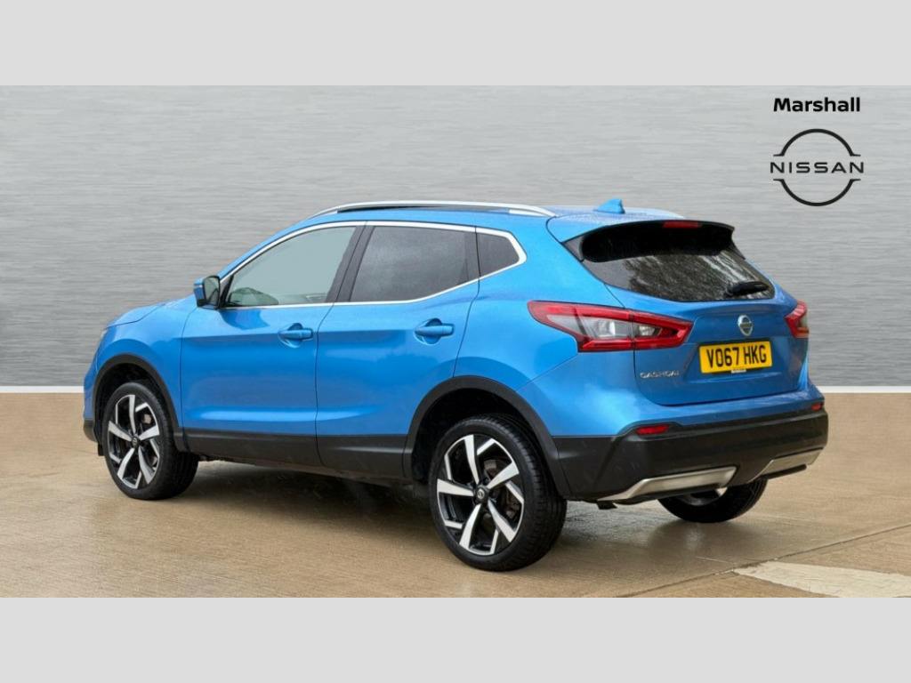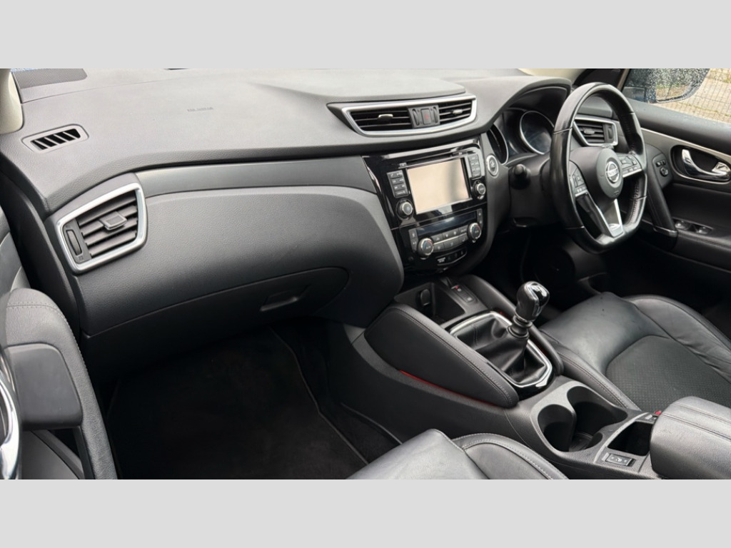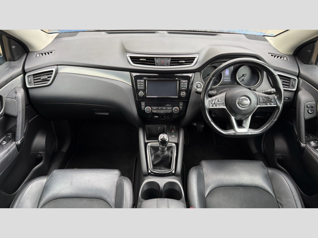 Nissan Qashqai 1.6 DiG-T Tekna 5dr 5" TFT driver information centre, Around View Monitor, Blind spot monitoring, Bluetooth phone integration system, Cruise control, Electric speed sensitive power steering, Front and rear parking sensors, Intelligent parking assist, Lane departure warning system, Nissan connect sat nav system, Outside temperature display, Push button starter, Rear view camera, Service interval indicator, Speed limiter, Traffic sign recognition, Trip computer, 'Shark fin' mobile antenna, Bose premium 8 speaker system, DAB Digital radio, Radio/CD, Smartphone apps, Steering wheel mounted audio controls, USB/aux input socket, Automatic headlamp activation, Body colour bumpers, Body colour door handles, Body colour door mirrors, Chrome window surround, Electric folding and heated door mirrors, High beam assist, Interior mirror with auto anti dazzle, LED indicators in door mirrors, Matt silver roof rails, One touch electric front/rear windows, Privacy glass, Rain sensor windscreen wipers, Rear roof spoiler, Rear wiper, 2 X front 12v power sockets, 60/40 split folding rear seat, Ambient interior lighting, Centre console with armrest, Chrome interior door handles, Configurable luggage board system, Driver + front passenger lumbar support, Dual zone climate control, Electric adjust driver's seat, Front and rear door pockets with bottle holders, Front headrests, Front seat belt pre-tensioners with load limiters, Height adjustable driver's seat, Height adjustable passenger seat, Illuminated electric window switch, Isofix child seat preparation, Leather gearknob, Leather interior door handles, Leather knee rest, Leather steering wheel, Luggage compartment lighting, Parcel shelf, Part leather upholstery, Pollen filter, Rake/reach adjustable steering wheel, Rear headrests, Heat package - Qashqai, LED pack - Qashqai, ABS, brake assist and EBD, Child locks on rear doors, Curtain airbags, Driver/front passenger airbag, Electronic parking brake, ESP + traction control, Forward emergency braking, Front passenger airbag deactivation, Height adjustable front seatbelts, Hill start assist, Seatbelt warning, Side airbags, Three 3 point rear seatbelts, Tyre pressure monitoring system, Alarm, Immobiliser, Intelligent Key, Remote central locking, Graphite interior trim, Tyre puncture repair kit