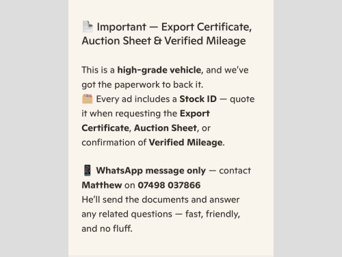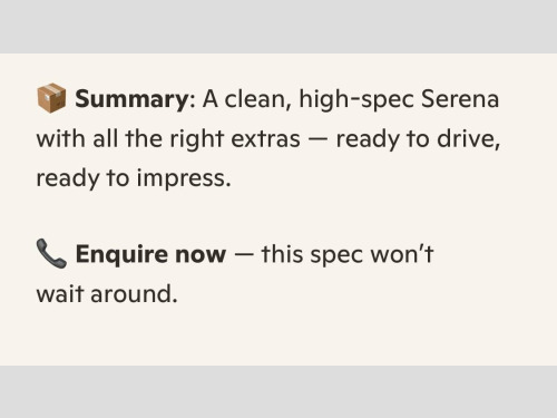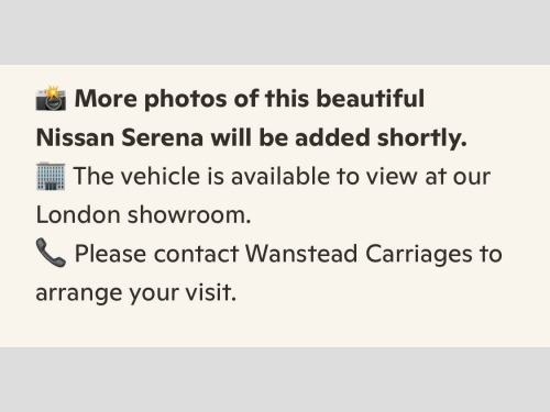 JAPANESE SERVICE HISTORY PRESENT**PLEASE MENTION STOCK ID IM 388 WHEN CALLING**EIGHT SEATER**ULEZ COMPLIANT**27/05/2015 REGISTERED DATE** GRADE 4 ( AVERY CLEAN EXAMPLE)**EIGHT SEATER**AIR BAGS**FRONT FOG LIGHTS**WINKER MIRRORS**PRIVACY GLASS**DEALER OPTION:REAR SOILER**REMOTE POWER SLIDE DOORS WITH PULL UP BLINDS**ALL AROUND PARKING SENSORS**ALL ROUND VIEW CAMERAS**LANE DEPARTURE WARNING**BRAKING ASSIST**DASH AND FLIP-DOWN MONITORS WITH REMOTE**FACTORY 16'' ALLOYS WHEELS**BLUETOOTH**IDEL STOP FUNCTION**TRACTION CONTROL**CLIMATE CONTROL**ABS**AIRBAGS**CRUISE CONTROL**LEATHER STEERING WHEEL**ORIGINAL FLOOR MATS**ALL NISSAN RECALLS COMPLETED**WE ARE DELIGHTED TO BE SELLING THIS STUNNING WELL LOOKED AFTER LOW MILEAGE NISSAN SERENA ( HFC26) THAT WE HAVE JUST IMPORTED ..PRESENTED IN METALLIC MAROON RED ( CAS - COLOUR CODE) WITH EXCELLENT CONDITION CLOTH UPHOLSTERYJUST BEEN MOT AND A ENGINE SERVICE AND TRANSMISSION SERVICE HAS BEEN COMPLETED WITH NO ADVISORY...This vehicle comes with a verified VX report, equivalent to the UK HPI report, confirming no mileage discrepancies or hidden accidents. A certificate will be providedThis example drives as it should with no warning light's on the dashboard after extended test drive.The car drives beautifully,The automatic gearbox is excellent with seamless gear changes,The price includes 12 months Nationwide comprehensive PREMIER warranty from a uk leading warranty company,Covering over 8000 electrical and mechanical parts, The policy covers parts and labour cost's,Nationwide cover.Have complete peace of mind, with the Wanstead Carriages promise All our vehicles are HPI Checked,a copy of the certificate is given with each vehicle, every vehicle is subject to a rigorous multi point pre-delivery inspection,AA/RAC Inspection are Welcome/12 Months AA Breakdown cover also includedWE ARE VERY PROUD TO BE A PART OF THE AA CARS STANDARDS WHICH IS APPROVED BY THE CHARTERED TRADING STANDARDS INSTITUTE,SO YOU CAN PURCHASE YOUR NEXT VEHICLE FROM WANSTEAD CARRIAGES IN CONFIDENCE** 3 point rear seat belts, airbags, air conditioning, alarm, alloy wheels, cd player, central locking, child locks & isofix system, electric door mirrors, electric windows, folding rear seats, height adjustable drivers seat, immobiliser, radio, parking aid, power steering, traction control, remote central locking