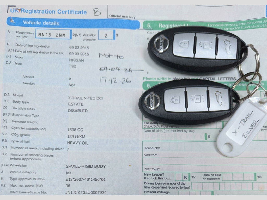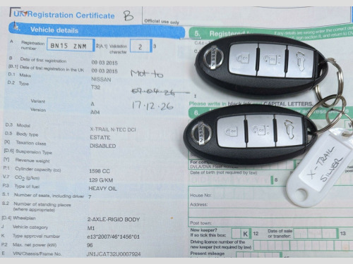 This Nissan X-Trail dCi n-tec from 2015 presents an exceptional ownership proposition, having been cherished by just one owner from new and boasting a remarkably low mileage of 55,050 miles. This 1.6 litre diesel model, in its n-tec trim, offers a versatile 7 seat upgrade, making it ideal for families or those needing extra passenger capacity. Inside, you'll find a comfortable leather gear knob and the convenience of a rear view camera with parking assistance. The automatic headlights, activated by a dusk sensor, provide added ease, while Bluetooth audio streaming compatibility allows for seamless connection of your devices.This X-Trail stands out with its impressive fuel economy, achieving a remarkable 58 miles per gallon, which indicates it is more economical than many similar vehicles. Furthermore, its low CO2 emissions and low insurance group highlight its cost effectiveness for everyday use. The generous boot space ensures you have ample room for luggage or shopping, further enhancing its practicality.This above average car is in wonderful condition, having obviously been cherished by the last owner. It has the benefit of a full service history to give the maximum reliability. View All Our Stock At; www.eurocarscastleford.com DELIVERY IS AVAILABLE WITH A 14 DAY COOLING OFF PERIOD, EMAIL YOUR POST CODE FOR A PERSONALISED QUOTATION AND TERMS. LOW RATE FINANCE IS AVAILABLE ON THIS CAR, PLEASE ASK. All figures quoted are the manufacturers figures. Errors and omissions are expected, this description and specification are AI generated and may be wrong, customers should ensure the actual car specification meets their requirements before purchase as mistakes cannot be rectified after purchase.. 12V Socket, 19in Alloy Wheels - Machine Cut, 6 Speakers, 60-40 Split Rear Folding Seats, ABS - Anti Lock Brakes, Active Engine Brake, Active Ride Control, Active Trace Control, Airbag - Driver, Airbag - Front Passenger, Airbags - Curtain, Airbags - Side, Alarm, Armrest - Rear, Around View Monitor - 360 Bird-View, Auto Dimming Rear View Mirror, Auto Rain Sensing Wipers, Automatic Headlights - Dusk Sensor, Black Honeycomb Front Grille, Bluetooth Audio Streaming Compatibility, Bluetooth with Microphone, Body Coloured Door Mirrors, Brake Assist, Bumpers - Body Coloured, Chrome Fog Light Finishers, Chrome Window Surrounds, Climate Control - Dual Zone, Cruise Control with Speed Limiter, DAB Radio, Display Screen - Colour TFT 5in, Door Handles - Chrome, Door Mirrors - Integrated Side Turning Lights, Driver Seat Height Adjustment, EBD - Electronic Brakeforce Distribution, ESP - Electronic Stability Programme, Electric Folding and Heated Door Mirrors, Electric Tilt and Slide Panoramic Sunroof, Engine Start Button, First Aid Kit, Forward Emergency Braking, Front Armrest, Front Dual Cupholders, Front Fog Lights, Front and Rear Electric Windows, Head Restraints - 3 Rear, Head Restraints - Front, High Visibility Jackets, Hill Start Assist, ISOFIX Child Seat Anchoring Points for 2nd Row, Immobiliser, Intelligent Key, LED Daytime Running Lights, Lane Departure Warning, Leather Gear Knob, Leather Steering Wheel, Luggage Board System, Metallic Grain Interior Inserts, Nissan Chassis Controls, One Touch Automatic Opening Power Tailgate, Parking Sensor - Front, Pollen Filter, Power Assisted Steering, Radio - CD Player, Rear Door Child Locks, Rear Parking Sensor, Rear Privacy Glass, Rear View Camera, Remote Central Locking, Roof Rails - Satin, Safety Kit, Safety Shield, Satellite Navigation - Nissan Connect, Smart Vision Pack, Space Saver Spare Wheel, Steering Wheel Mounted Audio Controls, Superlocking, TPMS - Tyre Pressure Monitoring System, Tilt and Telescopic Adjustable Steering Wheel, Touch Screen 7in, Traction Control, Traffic Sign Recognition, Trip Computer, USB - iPod Connectivity, USB-AUX Socket Input, Warning Triangle, e-PKB - Electric Parking Brake, Seats - 7-Seat Upgrade. Full service history