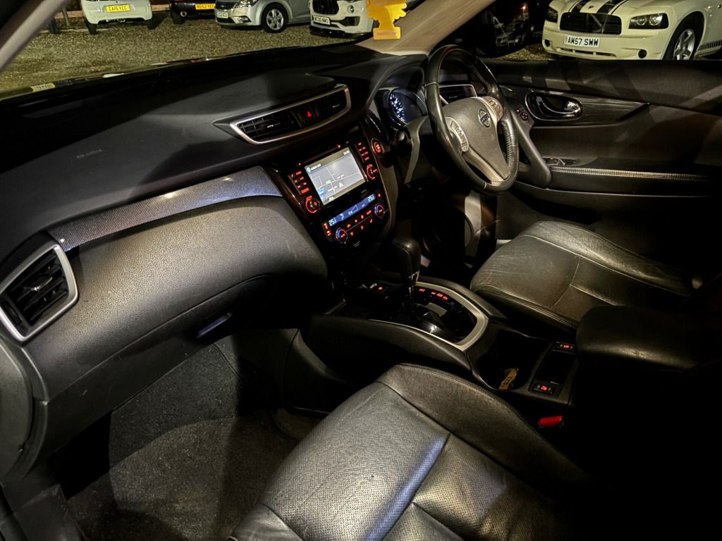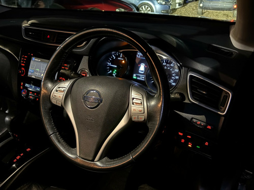 v socket, 6 speakers, bluetooth audio streaming compatibility, bluetooth with microphone, dab radio, display screen - colour tft 5in, radio - cd player, satellite navigation - nissan connect, touch screen 7in, usb - ipod connectivity, usb-aux socket input, 19in alloy wheels - machine cut, black honeycomb front grille, body coloured door mirrors, bumpers - body coloured, chrome fog light finishers, chrome window surrounds, door handles - chrome, door mirrors - integrated side turning lights, electric folding and heated door mirrors, electric tilt and slide panoramic sunroof, front and rear electric windows, rear privacy glass, roof rails - satin, space saver spare wheel, 60-40 split rear folding seats, armrest - rear, auto dimming rear view mirror, auto rain sensing wipers, climate control - dual zone, driver seat height adjustment, engine start button, front armrest, front dual cupholders, head restraints - 3 rear, head restraints - front, leather steering wheel, luggage board system, metallic grain interior inserts, one touch automatic opening power tailgate, pollen filter, seats - drivers electric adjustment, seats - drivers lumbar support, seats - heated front, seats - passengers electric adjustment, steering wheel mounted audio controls, tilt and telescopic adjustable steering wheel, abs - anti lock brakes, airbag - driver, airbag - front passenger, airbags - curtain, airbags - side, alarm, brake assist, ebd - electronic brakeforce distribution, esp - electronic stability programme, first aid kit, forward emergency braking, high visibility jackets, hill start assist, isofix child seat anchoring points for 2nd row, immobiliser, intelligent key, rear door child locks, remote central locking, reverse parking aid, safety kit, safety shield, smart vision pack, superlocking, traction control, warning triangle, e-pkb - electric parking brake, active engine brake, active ride control, active trace control, around view monitor - 360 bird-view, blind spot warning, cruise control with speed limiter, driver attention alert, intelligent park assist, lane departure warning, moving object detection, nissan chassis controls, parking sensor - front, power assisted steering, rear parking sensor, rear view camera, tpms - tyre pressure monitoring system, traffic sign recognition, trip computer, automatic headlights - dusk sensor, front fog lights, headlights - automatic levelling, headlights - bi-led, headlights - high beam assist, led daytime running lights