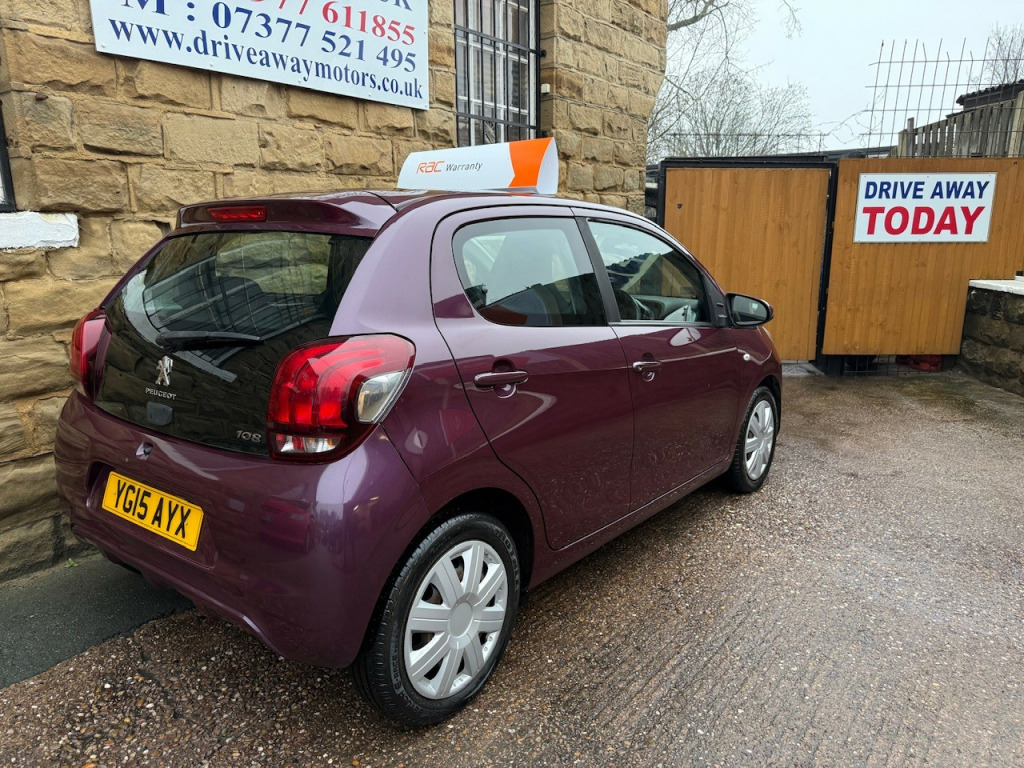 2015 PEUGEOT 108 1.0 PETROL 5 DOOR PURPLE, LONG MOT, RECENT SERVICE, £20 ROAD TAX, EXCELLENT CONDITION THROUGHOUT, 12 MONTHS FREE RAC ROADSIDE COVER, RAC PLATINUM WARRANTY, PROFESSIONALLY VALETED, CLEAR ON EXPERIAN, £100 DEPOSIT SECURES THIS VEHICLE, DRIVEAWAY TODAY! Driveaway Motors is centrally located in the village of Ackworth, West Yorkshire, WF7 7HY, close to Doncaster, Barnsley, Wakefield, Pontefract and Castleford, Excellent reviews, Established 2011, Over 20 vehicles in stock, Finance available with no deposit, Extended warranty available, Part exchange considered, New vehicles arriving daily please visit driveawaymotors.co.uk, If you require any further information then please do not hesitate to contact us, Next MOT due 24/10/2026, Last serviced on 15/10/2025 at 69,135 miles, Part service history, 4 seats, Purple, Any inspection, viewing or test drive welcome, £3,750. , This car comes with:, 12V Power Socket, 7in Multifunction Colour Touchscreen, ABS - Anti Lock Braking System, Air Conditioning - Manual, Bluetooth Connectivity - Audio, Bluetooth Telephone Facility, Child Safety Door Locking, DAB Digital Radio, Door Handles - Body Coloured, Door Mirrors - Body Coloured, Driver Seat Height Adjustment, EBFD - Electronic Brake Force Distribution, ESP - Electronic Stability Programme, Electric Front Windows, Electrically Assisted Power Steering, Head Restraints - Rear x2, Hill Assist, ISOFIX Location Points - Rear, LED Daytime Running Lights, Pollen Filter, Remote Control Central Locking, Steering Wheel - Height Adjustable, Steering Wheel - Multifunction, Tyre Pressure Sensors, Tyre Repair Kit, USB Input, Unfastened Seat Belt Warning - Front.