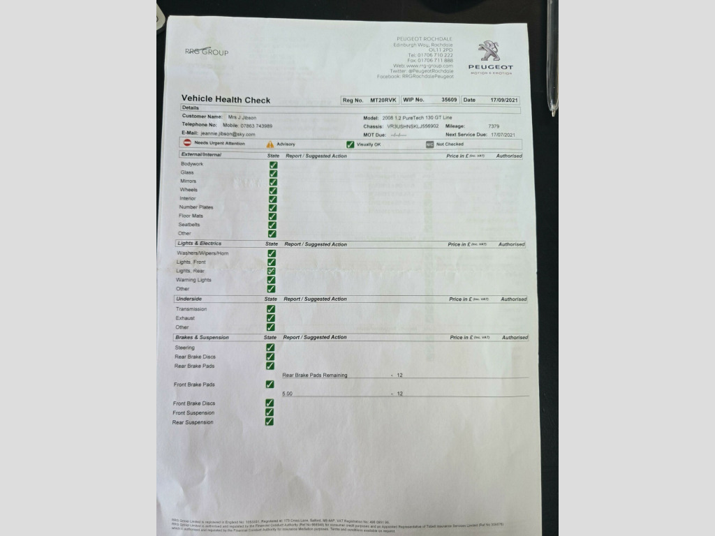 This 2020 Peugeot 2008 GT Line is a well maintained example, offering a blend of style and technology. Powered by a responsive 1.2 litre petrol engine, this Euro 6 compliant model delivers an impressive 0-62mph in just 8.9 seconds. Inside, you'll find the innovative PEUGEOT 3D i-Cockpit with a configurable 3D head up instrument panel, alongside heated front seats for added comfort. Stay connected with the Bluetooth telephone facility and enjoy the convenience of a wireless smartphone charging plate. The automatic dual zone air conditioning ensures a pleasant cabin environment for all occupants.With a remarkable fuel economy of 53 miles per gallon, this Peugeot 2008 GT Line is an economical choice for your daily journeys. Its low CO2 emissions further contribute to its efficiency. These highlights demonstrate how this vehicle offers a superior driving experience compared to other similar models, combining performance, advanced features, and cost effective motoring.. 1-3 - 2-3 Folding Rear Seat, 12V Power Socket, 18in Alloy Wheels - Storm - Diamond Cut - Two Tone, 6-Speaker Radio - MP3 Compatible, 8-Colour Customisable Ambient Lighting, ABS with Electronic Brake Force Distributor EBD and Emergency Brake Assist EBA, Active Safety Brake - Night Function - Cyclists - Pedestrians, Alarm, Aluminium Pedals, Automatic Door Locking When Moving Off, Automatic Dual Zone Air Conditioning, Automatic Hazard Light Activation Upon Heavy Brake Application, Bluetooth Telephone Facility, Child Locking Functionality on Rear Doors, DAB Digital Radio, Dark Tinted Rear Side and Tailgate Windows, Dashboard - Front and Rear Door Panel Finish - Carbon Effect, Deadlocking, Diamond Black Roof, Door Mirror Shells - Nera Black, Driver Attention Alert, Driver and Front Passenger Seat Mechanical Height Adjustment, Driver and Front Passenger Side Airbags, Driver and Front Passenger Sport Seats, Driver and Passenger Airbag with Passenger Airbag Deactivation Switch, ESP - Electronic Stability Program - with Hill Assist, Electric - Heated and Power Folding Door Mirrors, Electric Parking Brake, Electric Power Steering with Reach and Rake Adjustable Steering Column, Electric Windows - Front and Rear with One Touch, Electronic Code Immobiliser, Exhaust Pipe - Chrome, Exterior Door Handles - Body-Colour, Exterior Temperature Indicator with Ice Warning, Frameless Electrochrome Rear View Mirror, Front Central Armrest with Storage Compartment, Front Fog Lights, Front Optimised Safety Headrests and Rear Retractable Headrests - x3 - Height-Adjustable, Front USB Socket x2 including x1 USB-C, Front Windscreen Wiper, Front Wing Trim - Black with Gloss Black Detail and GT Line Badging, Front and Rear 3 Point Retractable Seatbelts - With Force Limiter, Front and Rear Carpet Mats in Black with Lime Green Stitch Detail, Front and Rear Curtain Airbags, Front and Rear Parking Sensors, Full LED Headlights with Smartbeam Assist, GT Line Model Designation Badging on Tailgate, Gear Lever - Manual in Satin Chrome, Gear Shift Indicator, Gloss Black B Pillar, Gloss Black Rear Cluster Connecting Strip, Gloss Black Window Surround, Headlights Left On Audible Warning, High Centre Console, ISOFIX Child Seat Fittings - x2 in the Outer Rear Seat, ISOFIX Location Points - Front Passenger, LED Daytime Running Lights - 3-Claw Headlight with Distinctive Tooth Design, LED Front Interior Light with Reading Spotlights -x2- and Rear Interior Light with Timer, LED Side Indicator Lights Integrated into Door Mirrors, Lane Keeping Assist, Lime Green Contrast Stitching to Front Centre Console - Door Panels - Dashboard Facia, Longitudinal Roof Bars - Gloss Black, Lower Front Bumper - Chrome, Map Pockets on Front Seat Backs, Mirror Screen - Apple CarPlay - Android Auto and MirrorLink, Mistral Full-Grain Perforated Leather Steering Wheel with Aikinite Stitch Detail and Satin Chrome GT Emblem, Model Designation Badges - Front and Rear, Modular Boot Floor - 2 Position, Multifunction Trip Computer, PEUGEOT 3D i-Cockpit - Configurable 3D Head-Up Instrument Panel, PEUGEOT i-Cockpit 10in Capacitive Colour Touchscreen with Connected 3D Navigation - includes TomTom Live Updates - 3 Year Subscription, Peugeot Connect SOS and Assistance, Peugeot i-Cockpit - Compact Multi-Function Steering Wheel, Piano Keys - Gloss Black Plated Toggle Switches to Access Main Functions of Vehicle, Piano Keys - Gloss Black Plated Toggle Switches to Access Touchscreen Functions, Programmable Cruise Control and Speed Limiter, Push Button Start, Radiator Grille - Dark Chrome Chequered and Gloss Black Edge Trim, Radiator Grille - Gloss Black Higher Part, Rear Full LED 3D Peugeot Signature Claw Effect Lights with Daylight Function, Rear Lower Bumper Gloss Black Diffuser Effect Trim, Rear Number Plate Lights x2, Rear Reversing Lights, Rear Spoiler - Diamond Black, Rear USB Socket x2, Rear Windscreen Wiper Triggered Automatically in Reverse Gear, Roof Lining - Mistral Black, Seatbelt not Fastened Audible W.