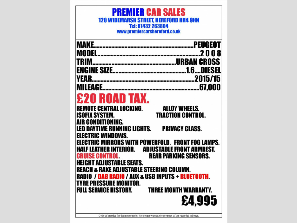 A striking Peugoet 2008 in dark metallic green with black alloy wheels. Low running costs, including road tax of only £20 per year. Excellent Service History. Two keys present. Features include :, Remote Central Locking. Electric Windows. Electric Mirrors with powerfold facility. Rear Parking Sensors. Half Leather Interior. ISOFIX. Air Conditioning. Cruise Control with speed limiter option. Front Fog Lamps. Radio & DAB Radio with AUX & USB plus Bluetooth. LED Daytime Running Lamps. Height Adjustable Front Seats. Reach & Rake Adjustable Steering Column. We are at 120 Widemarsh Street, Hereford, HR4 9HN. Our website with full details is : www.premiercarshereford.co.uk, All of our vehicles are supplied with a three month warranty and long MOT. Card payments are welcomed and part exchanges are gladly considered. Low rate finance arranged, subject to status. Please call us on 01432263804 or 07831564655 for more information.