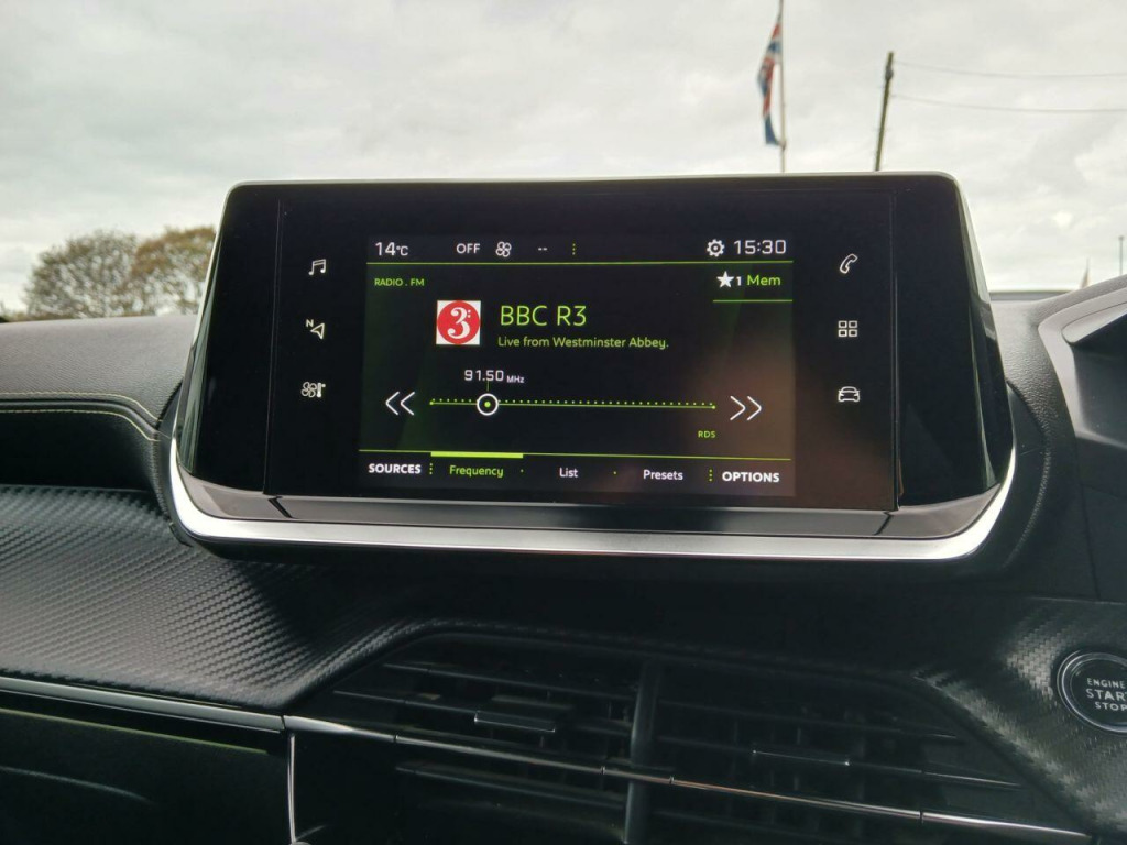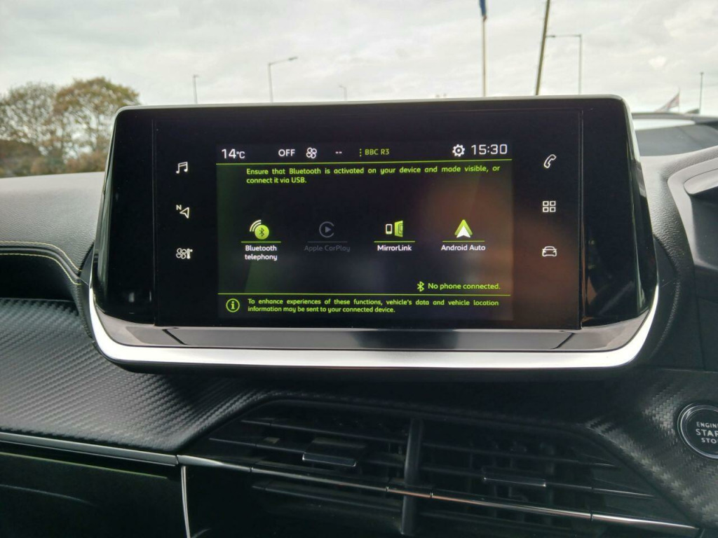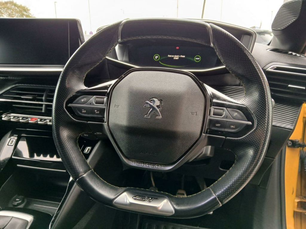 . 12V Power Socket, 17in Alloy Wheels - Camden - Diamond Cut Two-Tone, 6-Speaker Radio - MP3 Compatible, 8-Colour Customisable Ambient Lighting, ABS with Electronic Brake Force Distributor EBD and Emergency Brake Assist EBA, Active Lane Keeping Assistance - LKA and Road Edge Detection, Active Safety Brake - Night Function - Cyclists - Pedestrians, Airbags - Adaptive Driver and Front Passenger, Airbags - Curtain Front and Rear, Airbags - Driver and Front Passenger Side, Alarm - Thatcham Category 1, Aluminium Footrest and Pedals, Automatic Air Conditioning, Automatic Door Locking When Moving Off, Automatic Hazard Light Activation Upon Heavy Brake Application, Bluetooth Telephone Facility, Child Locking Functionality on Rear Doors, DAB Digital Radio, Dark Tinted Rear Side and Tailgate Windows, Dashboard - Front and Rear Door Panel Finish - Carbon Effect, Deadlocks, Diamond Black Roof, Distance Alert System, Door Mirror Shells - Nera Black, Driver Attention Alert, Driver and Front Passenger Seat Mechanical Height Adjustment, Driver and Front Passenger Sport Seats, ESP - Electronic Stability Program - with Hill Assist, Electric Parking Brake, Electric Power Steering with Reach and Rake Adjustable Steering Column, Electrically Operated and Heated Door Mirrors with Electric Folding Operation, Electronic Code Immobiliser, Exterior Door Handles - Body-Colour, Exterior Temperature Indicator with Ice Warning, Frameless Electrochrome Rear View Mirror, Front Central Armrest with Storage Compartment, Front Optimised Safety Headrests and Rear Retractable Headrests - x3 - Height-Adjustable, Front Three-Point Retractable Seatbelts with Force Limiters, Front USB Socket x2 including x1 USB-C, Front Windscreen Wiper, Front and Rear Carpet Mats in Black with Lime Green Stitch Detail, Front and Rear Parking Sensors, Full LED Headlights with Smartbeam Assist, GT Line Model Designation Badging on C Pillar, GT Line Model Designation Badging on Tailgate, Gear Lever - Manual in Satin Chrome, Gear Shift Indicator, Gloss Black B Pillar, Gloss Black Rear Cluster Connecting Strip, Gloss Black Wheel Arch Extensions, Gloss Black Window Surround, Headlights Left On Audible Warning, High Centre Console with 2 Cup Holders, ISOFIX Child Seat Fittings - Passenger Seat, ISOFIX Child Seat Fittings - x2 - Second Row, LED Daytime Running Lights - 3-Claw Headlight with Distinctive Tooth Design, LED Front Interior Light with Reading Spotlights -x2- and Rear Interior Light with Timer, LED Side Indicator Lights Integrated into Door Mirrors, Lane Keeping Assist, Lime Green Contrast Stitching to Armrest - Front Centre Console - Door Panels - Dashboard Fascia, Map Pockets on Front Seat Backs, Mirror Screen - Apple CarPlay and Android Auto, Mistral Full-Grain Perforated Leather Steering Wheel with Aikinite Stitch Detail and Satin Chrome GT Emblem, Model Designation Badges - Front and Rear, Multifunction Trip Computer, One-Touch Electric Front Windows with Pinch Protection, One-Touch Electric Rear Windows with Pinch Protection, PEUGEOT 3D i-Cockpit - Configurable 3D Head-Up Instrument Panel, PEUGEOT i-Cockpit 7in Capacitive Colour Touchscreen, PEUGEOT i-Cockpit Compact Steering Wheel, Peugeot Connect SOS and Assistance, Piano Keys - Gloss Black Plated Toggle Switches to Access Main Functions of Vehicle, Programmable Cruise Control and Speed Limiter, Push Button Start, Radiator Grille - Dark Chrome Chequered and Gloss Black Edge Trim, Rear Full LED 3D Peugeot Signature Claw Effect Lights with Daylight Function, Rear Lower Bumper Gloss Black Diffuser Effect Trim, Rear Number Plate Lights x2, Rear Reversing Lights, Rear Spoiler - Diamond Black, Rear USB Socket x2, Rear Windscreen Wiper Triggered Automatically in Reverse Gear, Road Sign Recognition and Recommendation, Roof Lining - Mistral Black, Seatbelt Unfastened on the Move Audible and Visual Alert for Front and Rear Seats, Seating - Driver and Front Passenger Seat Manual Adjustment - Longitudinal and Back Rest Angle, Seats - 2-.