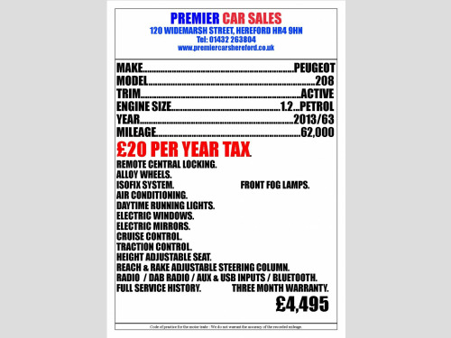 This 2013 Peugeot 208 1.2 VTi Active Hatchback is currently available for £4,495 in Hereford Herefordshire with Petrol engine and Manual gearbox. For more information or to arrange a viewing, click here to send us an email using form below.