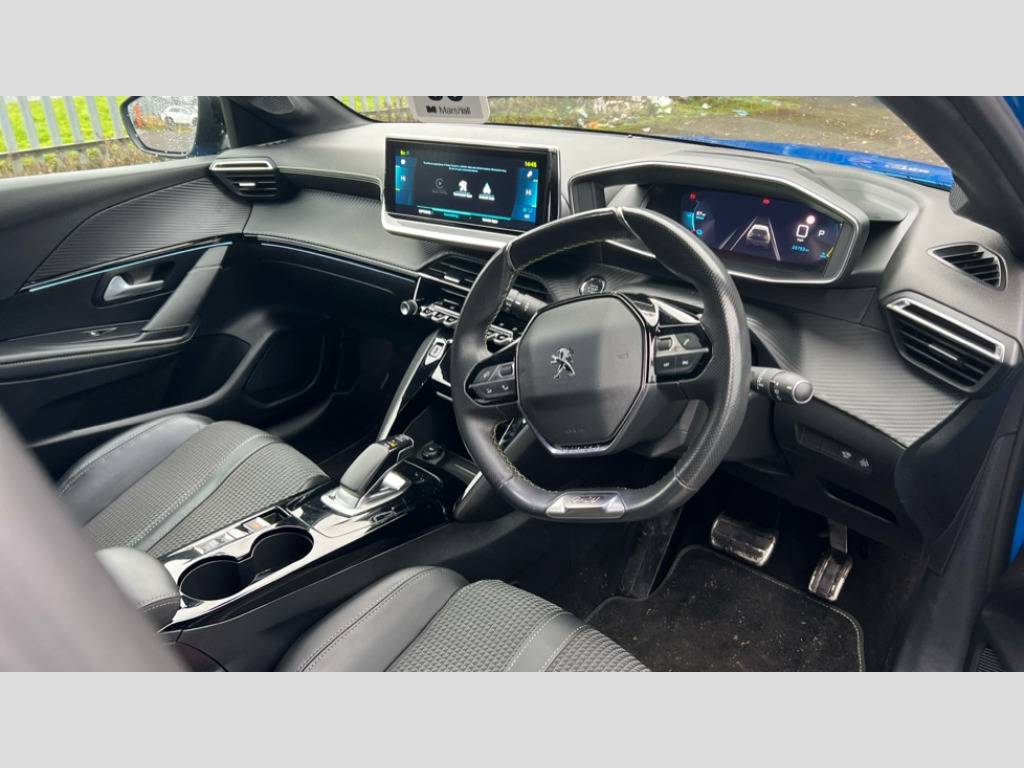 Peugeot 208 100kW GT 50kWh 5dr Auto 10" Capacitive colour touchscreen with connected 3D navigation, Blind spot monitoring, Bluetooth telephone facility, Driver attention warning, Exterior temperature indicator with ice warning, Mirror screen with mirror link, apple carplay and android auto, Multi function trip computer, PEUGEOT i-Cockpit with compact steering wheel, PEUGEOT i-Cockpit with configurable 3D headup instrument panel, PEUGEOT SOS and assistance, Push button start, Smart phone docking station, Speed limit recognition and recommendation, Visio park assist 180 with colour reversing camera + front and rear parking sensor, 7 kW monophase on board charger, Mode 3 type 2 cable for wallbox charging, 2 front USB socket with USB-C, 2x USB sockets in rear, 6 speakers radio with mp3 compatible, DAB Digital radio, Voice recognition for radio, navigation and telephony features, 2 X Rear number plate lights, Automatic hazard light activation upon heavy brake application, Automatic lights, Automatic windscreen wipers, Body coloured exterior door handles, Dark tinted rear side and tailgate windows, Diamond black rear spoiler (roof), Diamond Black roof, Dichroic badging in front lion with e monogram on C pillar and tailgate, Electric front windows + one touch + anti-pinch, Electric rear windows with one touch/anti-pinch, Electrically adjustable, heated and power folding door mirrors, Follow me home headlights, Frameless electrochrome interior rear view mirror, Full LED headlights with smartbeam assist, Gloss black finish on B pillar, Gloss black rear cluster connecting strip, Gloss black wheel arch extensions, Gloss black window surround, GT model designation badging on tailgate, Headlights left on audible warning, LED daytime running lights with 3 claw headlight with distinctive tooth design, LED side indicator lights integrated into door mirrors, Model designation badges front and rear, Nera black door mirror shells, Peugeot scuff plates, Radiator grille - body colour chequered and gloss black edge trim, Rear bumper with gloss black finish, Rear full LED 3D peugeot signature claw effect lights with daylight function, Rear lower bumper diffuser effect trim in gloss black, Rear reversing lights, Rear windscreen wiper triggered automatically in reverse gear, Roof mounted aerial with fin design, Tailgate with heated rear windscreen and wiper blade, 1/3 to 2/3 split folding rear seats, 12V socket, 8 Colour personalisable ambient lighting, Aluminium pedals and foot rest, Automatic air conditioning, Automatic gear lever in full grain leather and satin chrome, Driver and front passenger seat manual adjustment in longitudinal and back rest angle, Driver and front passenger seat mechanical height adjustment, Driver and front passenger sport seats, Electric power steering with reach and rake adjustable steering column, Front and rear carpet mats in black with specific detailing, Front centre armrest with storage compartment, Front LED interior light with 2 reading spotlights and rear interior light with timer, High centre console with 2 cup holders, ISOFIX child seat mounting points on passenger seat, Lime green contrast stitching to armrest, front centre console, door panels and dashboard facia, Map pockets on the backs of the front seats, Mistral full grain perforated leather steering wheel with aikinite stitch detail and satin chrome 'GT' emblem, Piano keys gloss black plated toggle switches to access main functions of the vehicle, Piano keys gloss black plated toggle switches to access touchscreen functions, Pre heating function, Roof lining - Mistral black, Seatbelt unfastened on the move audible and visual alert for front and rear seats, Tri material cloth/leather upholstery, 2x Isofix child seat fitting on outer rear seats, 3 rear 3 point seatbelts, ABS (Anti-lock Braking System) with EBD (Electronic Brakeforce Distribution) and EBA (Emergency Braking Assistance), Active safety brake with night function/cyclists/pedestrians, Adaptive driver and front passenger airbags with passenger airbag deactivation function, Child locking functionality on rear doors, Driver/front passenger side airbags, Electric parking brake, ESP with Hill Assist, Front and rear curtain airbags, Front and rear disc brakes, Front optimised safety headrests and 3 x rear retractable headrests with height adjustable, Front three point retractable seatbelts with force limiters, Tyre pressure sensor, Acoustic vehicle alert system (AVAS), Automatic door locking when moving off, Deadlock, Electronic code immobiliser, Thatcham cat. 1 alarm with anti lift sensor, Carbon effect Dashboard, front and rear door panel finish, 17" Shaw diamond cut two tone alloy wheels, Tyre puncture repair kit