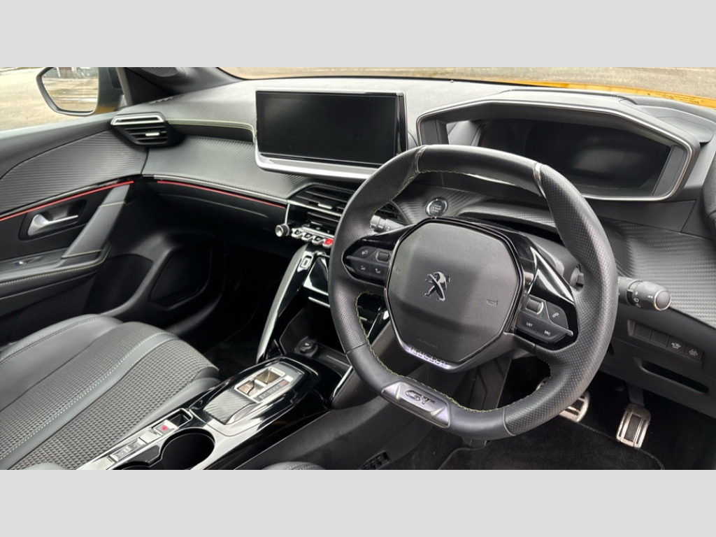 Peugeot 208 100kW GT 50kWh 5dr Auto 10" Capacitive colour touchscreen with connected 3D navigation, Bluetooth telephone facility, Driver attention warning, e-Toggle driving selector, Exterior temperature indicator with ice warning, Mirror screen with mirror link, apple carplay and android auto, Multi function trip computer, PEUGEOT i-Cockpit with compact steering wheel, PEUGEOT i-Cockpit with configurable 3D headup instrument panel, PEUGEOT SOS and assistance, Push button start, Smart phone docking station, Speed limit recognition and recommendation, Visio park assist 180 with colour reversing camera + front and rear parking sensor, 7.4 kW monophase on board charger, Mode 3 type 2 Tri-Phase charging cable, 2 front USB socket with USB-C, 2x USB sockets in rear, 6 speakers radio with mp3 compatible, DAB Digital radio, Voice recognition for radio, navigation and telephony features, 2 X Rear number plate lights, Automatic hazard light activation upon heavy brake application, Automatic lights, Automatic windscreen wipers, Body coloured exterior door handles, Dark tinted rear side and tailgate windows, Diamond black rear spoiler (roof), Diamond Black roof, Dichroic badging in front lion with e monogram on C pillar and tailgate, Electric front windows + one touch + anti-pinch, Electric rear windows with one touch/anti-pinch, Electrically adjustable, heated and power folding door mirrors, Follow me home headlights, Frameless electrochrome interior rear view mirror, Full LED headlights with smartbeam assist, Gloss black finish on B pillar, Gloss black rear cluster connecting strip, Gloss black wheel arch extensions, Gloss black window surround, GT model designation badging on tailgate, Headlights left on audible warning, LED daytime running lights with 3 claw headlight with distinctive tooth design, LED side indicator lights integrated into door mirrors, LED third brake light, Model designation badges front and rear, Nera black door mirror shells, Peugeot scuff plates, Radiator grille - body colour chequered and gloss black edge trim, Rear bumper with gloss black finish, Rear full LED 3D peugeot signature claw effect lights with daylight function, Rear lower bumper diffuser effect trim in gloss black, Rear reversing lights, Rear side wing doors, Rear windscreen wiper triggered automatically in reverse gear, Roof mounted aerial with fin design, Roof spoiler, Tailgate with heated rear windscreen and wiper blade, Variable front intermittent wipers, 1/3 to 2/3 split folding rear seats, 12V socket, 3 seat bench in 2nd row, 8 Colour personalisable ambient lighting, Aluminium pedals and foot rest, Automatic air conditioning, Automatic gear lever in full grain leather and satin chrome, Driver and front passenger seat manual adjustment in longitudinal and back rest angle, Driver and front passenger seat mechanical height adjustment, Driver and front passenger sport seats, E-CMP autonomy improvement - heat pump and new reducer, Electric power steering with reach and rake adjustable steering column, Front and rear carpet mats in black with specific detailing, Front centre armrest with storage compartment, Front LED interior light with 2 reading spotlights and rear interior light with timer, High centre console with 2 cup holders, ISOFIX child seat mounting points on passenger seat, Lime green contrast stitching to armrest, front centre console, door panels and dashboard facia, Map pockets on the backs of the front seats, Mistral full grain perforated leather steering wheel with aikinite stitch detail and satin chrome 'GT' emblem, Piano keys gloss black plated toggle switches to access main functions of the vehicle, Piano keys gloss black plated toggle switches to access touchscreen functions, Pre heating function, Rear centre headrest, Roof lining - Mistral black, Seatbelt unfastened on the move audible and visual alert for front and rear seats, Single front passenger seat, 3 rear 3 point seatbelts, ABS (Anti-lock Braking System) with EBD (Electronic Brakeforce Distribution) and EBA (Emergency Braking Assistance), Active safety brake with night function/cyclists/pedestrians, Adaptive driver and front passenger airbags with passenger airbag deactivation function, Child locking functionality on rear doors, Driver/front passenger side airbags, Electric parking brake, ESP with Hill Assist, Front and rear curtain airbags, Front and rear disc brakes, Front optimised safety headrests and 3 x rear retractable headrests with height adjustable, Front three point retractable seatbelts with force limiters, Tyre pressure sensor, Acoustic vehicle alert system (AVAS), Automatic door locking when moving off, Deadlock, Electronic code immobiliser, Remote central locking, Thatcham cat. 1 alarm with anti lift sensor, Carbon effect Dashboard, front and rear door panel finish, 17" Bronx two-tone alloy wheels, Tyre puncture repair kit