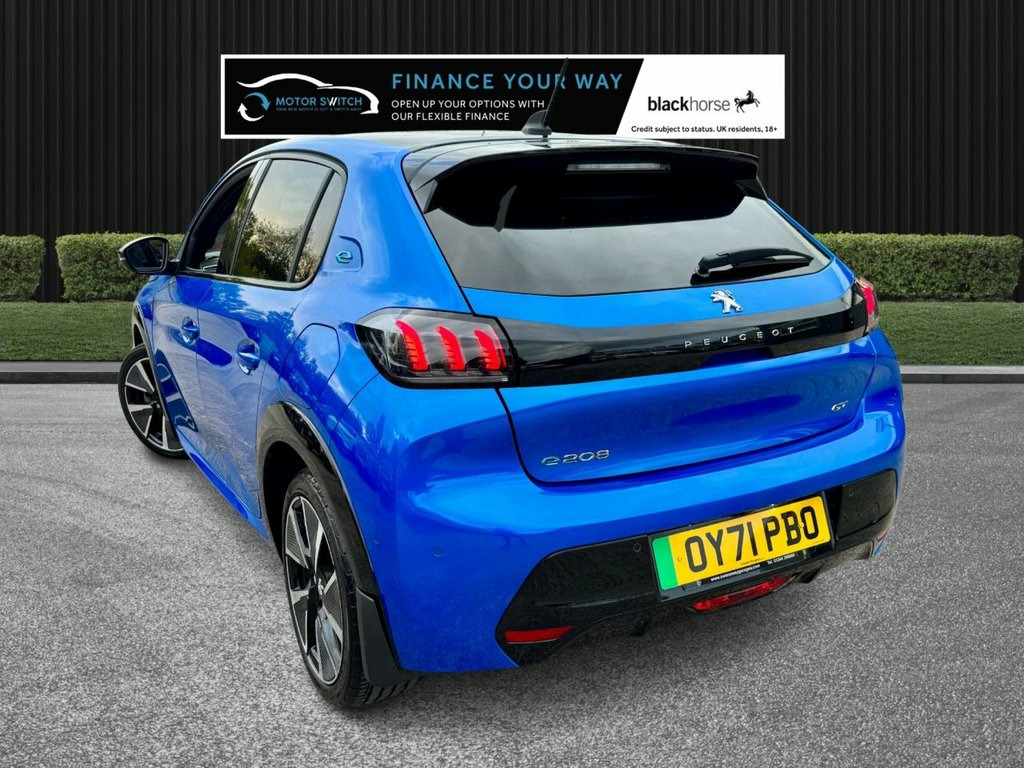 Title: Here at Motor Switch – Your New Motor Is Just a Switch Away Introducing the Peugeot e-208 50kWh GT Hatchback 5dr Electric Automatic Low mileage, 2 former keepers, HPI clear, mileage checked Freshly serviced and comes with a full 12-month nationwide warranty MOT valid until 01 August 2026 Key benefits Finance from 10.9% APR Delivery available; Part Exchange welcome Fully valeted with Auto Smart products What you get 7kW monophase onboard charger; 50 kWh battery for efficient daily runs 17" Shaw Diamond Cut Two-Tone alloy wheels 6-speaker MP3 stereo; DAB; Apple CarPlay & Android Auto Full LED headlights with Smartbeam Assist; automatic headlights Visio Park 1 180° reversing camera; 360° awareness with Blind Spot Monitoring Active Safety Brake, Hill Start Assist, ESP with EBD/EBA i-Cockpit with compact steering wheel; piano key switches Ambient lighting (8 colours); automatic climate control Electric heated & power-folding mirrors; electric parking brake Auto door locking when moving; auto hazard activation on heavy braking ISOFIX x2 with top tether; rear wiper in reverse; heated rear windscreen Rear full LED Peugeot signature claw lights; heated tailgate glass PEUGEOT i-Cockpit features; Voice Recognition for radio/navigation/phone Visually distinctive GT Line badging; E Monogram on C pillar & tailgate Safety and technology Mirror Screen (Apple CarPlay/Android Auto) DS/ADAS features for confident acceleration and b 12V Power Socket, 17in Alloy Wheels - Shaw - Diamond Cut T, 6-Speaker Radio - MP3 Compatible, 7KW Monophase On Board Charger, 8-Colour Customisable Ambient Lighting, ABS with Electronic Brake Force Distribu, AVAS - Acoustic Vehicle Alerting System, Active Safety Brake - Night Function - C, Air Conditioning - Automatic, Airbags - Adaptive Driver and Front Pass, Airbags - Curtain Front and Rear, Airbags - Driver and Front Passenger Sid, Alarm - Thatcham Category 1 Approved, Automatic Door Locking When Moving Off, Automatic Hazard Light Activation Upon H, Blind Spot Monitoring, Bluetooth Telephone Facility, Carpet Mats, Central Front Armrest with Storage Compa, Child Locking Functionality on Re