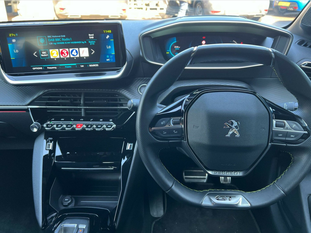 Call to arrange an appointment today! 12V Power Socket, 17in Alloy Wheels - Shaw - Diamond Cut Two-Tone, 6-Speaker Radio - MP3 Compatible, 7KW Monophase On Board Charger, 8-Colour Customisable Ambient Lighting, ABS with Electronic Brake Force Distributor EBD and Emergency Brake Assist EBA, AVAS - Acoustic Vehicle Alerting System, Active Safety Brake - Night Function - Cyclists - Pedestrians, Air Conditioning - Automatic, Airbags - Adaptive Driver and Front Passenger, Airbags - Curtain Front and Rear, Airbags - Driver and Front Passenger Side, Alarm - Thatcham Category 1 Approved, Automatic Door Locking When Moving Off, Automatic Hazard Light Activation Upon Heavy Brake Application, Blind Spot Monitoring, Bluetooth Telephone Facility, Carpet Mats, Central Front Armrest with Storage Compartment, Child Locking Functionality on Rear Doors, Compact Automatic e-Toggle Gearbox Impulse Selector, DAB - Digital Audio Broadcasting, Dark Tinted Rear Side and Tailgate Windows, Dashboard - Front and Rear Door Panel Finish - Carbon Effect, Deadlocking, Diamond Black Roof, Dichroic Badging including - Front Lion - E Monogram on C Pillar and Tailgate, Door Mirror Shells - Nera Black, Driver Attention Warning, Driver and Front Passenger Seat Mechanical Height Adjustment, Driver and Front Passenger Sport Seats, ESP - Electronic Stability Programme with Hill Start Assist, Electric - Heated and Power Folding Door Mirrors, Electric Parking Brake, Electric Power Steering with Reach and Rake Adjustable Steering Column, Electronic Code Immobiliser, Exterior Door Handles - Body-Colour, Exterior Temperature Indicator with Ice Warning, Frameless Electrochrome Rear View Mirror, Front Optimised Safety Headrests and Rear Retractable Headrests - x3 - Height-Adjustable, Front Three-Point Retractable Seatbelts with Force Limiters, Front USB Socket x2 including x1 USB-C, Full LED Headlights with Smartbeam Assist, GT Line Model Designation Badging on C Pillar, GT Model Designation Badging on Tailgate, Gloss Black B Pillar, Gloss Black Rear Cluster Connecting Strip, Gloss Black Wheel Arch Extensions, Gloss Black Window Surround, Headlights Left On Audible Warning, High Centre Console with 2 Cup Holders, ISOFIX Child Seat Fittings - x2 - Second Row, ISOFIX with Top Tether on Passenger Seat, LED Daytime Running Lights - 3-Claw Headlight with Distinctive Tooth Design, LED Front Interior Light with Reading Spotlights -x2- and Rear Interior Light with Timer, LED Side Indicator Lights Integrated into Door Mirrors, Lane Keeping Assist, Lime Green Contrast Stitching to Armrest - Front Centre Console - Door Panels - Dashboard Fascia, Map Pockets on Front Seat Backs, Mirror Screen - Apple CarPlay and Android Auto, Mistral Full-Grain Perforated Leather Steering Wheel with Aikinite Stitch Detail and Satin Chrome GT Emblem, Mode 3 Type 2 Cable for Wallbox Charging, Model Designation Badges - Front and Rear, Multifunction Trip Computer, One-Touch Electric Front Windows with Pinch Protection, One-Touch Electric Rear Windows with Pinch Protection, PEUGEOT 3D i-Cockpit - Configurable 3D Head-Up Instrument Panel, PEUGEOT Scuff Plates, PEUGEOT i-Cockpit 10in Capacitive Colour Touchscreen with Connected 3D Navigation includes TomTom Live Updates (3 Year Subscription From New), PEUGEOT i-Cockpit Compact Steering Wheel, Peugeot Connect SOS and Assistance, Peugeot Door Sills, Piano Keys - Gloss Black Plated Toggle Switches to Access Main Functions of Vehicle, Pre-Heating Functionality, Programmable Cruise Control and Speed Limiter, Puncture Kit, Push Button Start, Radiator Grille - Dark Chrome Chequered and Gloss Black Edge Trim, Rear Bumper - Gloss Black Finish, Rear Full LED 3D Peugeot Signature Claw Effect Lights with Daylight Function, Rear Lower Bumper Gloss Black Diffuser Effect Trim, Rear Number Plate Lights x2, Rear Reversing Lights, Rear Spoiler - Diamond Black, Rear USB Socket x2, Rear Windscreen Wiper Triggered Automatically in Reverse Gear, Roof Lining - Mistral Black, Roof Mounted Aerial with Fin Design, Seatbelt Unfastened on the Move Audible and Visual Alert for Front and Rear Seats, Seating - Driver and Front Passenger Seat Manual Adjustment - Longitudinal and Back Rest Angle, Seating- 1-3 - 2-3 Folding Rear Seat, Smartphone Docking Station, Speed Limit Recognition and Recommendation, Tailgate with Heated Rear Windscreen and Wiper Blade, TomTom Live Services (3 Year Subscription from New), Tyre Pressure Sensors, Visibility Pack, Visio Park 1 - 180 Degree Colour Reversing Camera, Voice Recognition - Radio-Navigation-Telephony Features, e-Toggle Driving Selector