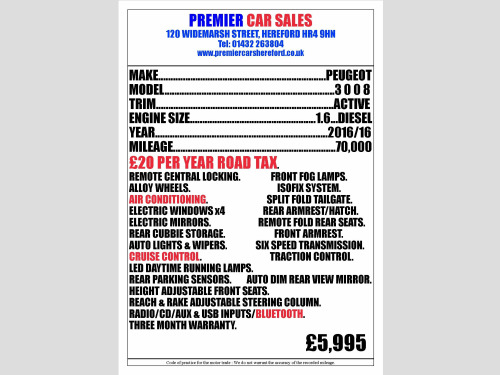 A good sized car for family use; £20 road tax. Remote Central Locking. Alloy Wheels. Air Conditioning. Electric Windows all round. Electric Mirrors. Rear Cubbie Storage. Auto Lights. Auto Wipers. Cruise Control, with speed limiter option. LED Daytime Running Lamps. Rear Parking Sensors. Auto Dim Rear View Mirror. Height Adjustable Front Seats. Radio/CD with AUX & USB Inputs + Bluetooth Connection. Front Fog Lamps. ISOFIX system. Split Fold Tailgate. Rear Armrest with load-thru ski hatch. Remote Fold Release Rear Seats. Front Armrest with storage compartment. Six Speed Manual Transmission. Traction Control. We are at 120 Widemarsh Street, Hereford, HR4 9HN. Our website with full details is : www.premiercarshereford.co.uk, All of our vehicles are supplied with a three month warranty and long MOT. Card payments are welcomed and part exchanges are gladly considered. Low rate finance arranged, subject to status. Please call us on 01432263804 or 07831564655 for more information.