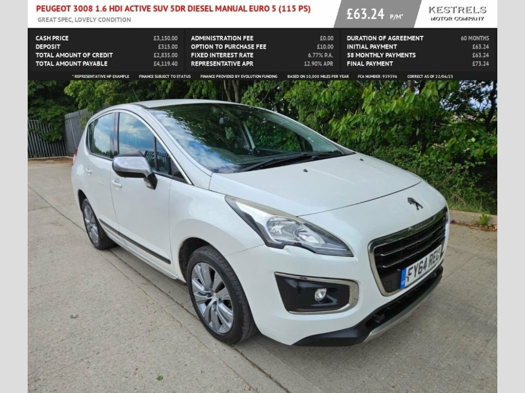Very popular 2014 Peugeot 3008 1.6 HDi Diesel, Manual, 98,523 miles, serviced, MOT until April 2026. Comes with alloy wheels & good tyres, large load space, Parking sensors, nice media system, auto lights, AC etc Part exchange welcome, finance arranged, 3 months Autoguard warranty with roadside assistance included. 12V Power Socket, 17in Alloy Wheels - Aregia, ABS - Anti Lock Braking System, Air Conditioning - Manual, Airbags - Curtain SMART Front and Rear, Armrest - Rear with Storage, ASR - Anti Slip Regulation, Automatic Door Locking When Moving Off, Cruise Control and Speed Limiter, Deadlocks, Door Handles - Body Coloured, Door Mirrors - Body Coloured, Door Mirrors - Electric Folding, Dynamic Roll Control, EBA - Emergency Brake Assist, EBFD - Electronic Brake Force Distributi, Electric Parking Brake, Electric Windows - Front and Rear, Electrochrome Rear View Mirror, ESP - Electronic Stability Programme, Exterior Courtesy Light, Flat Folding 60-40 Split Rear Seats, Front Fog Lights, Headlights - Auto