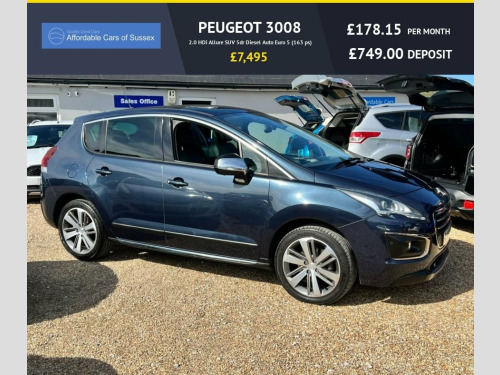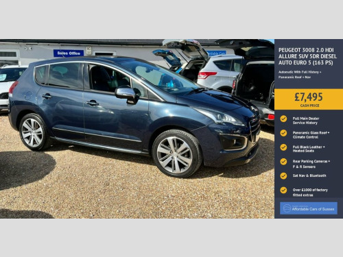 This 2015 Peugeot 3008 Crossover 2.0 HDi Allure SUV 5dr Diesel Auto Euro 5 (163 ps) is currently available for £7,495 in Peacehaven East Sussex with Diesel engine and Automatic gearbox. For more information or to arrange a viewing, click here to send us an email using form below.