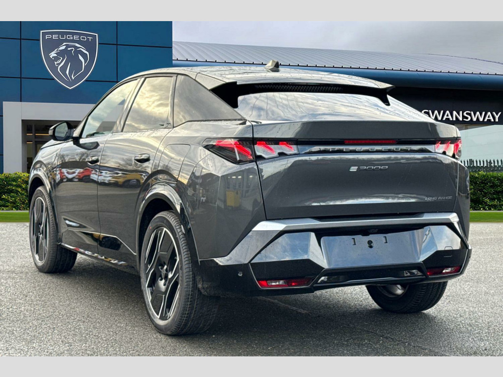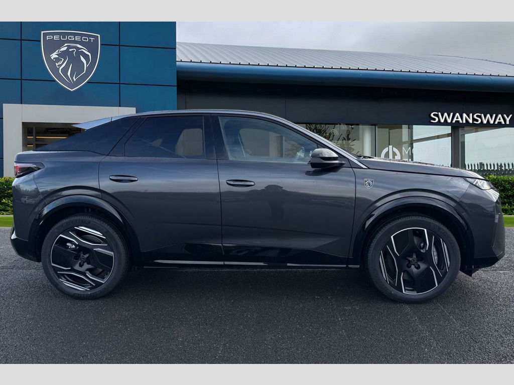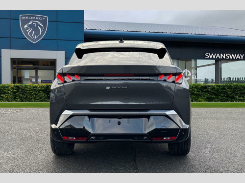 Sensation Pack, 11kW Triphase On Board Charger, 20in Alloy Wheels - SOFIA - Diamond Cut with Matte Onyx Black and Gloss Onyx Black Inserts and Star Centre Cap - Orbital Black, 40-20-40 Folding Rear Seats, 8-Colour Extended Ambient Lighting, AVAS - Acoustic Vehicle Alerting System, Acoustic Windscreen, Adaptive Cruise Control with Stop and Go Function, Advanced Emergency Braking System, Air Conditioning - Automatic Dual Zone Climate Control, Airbags - Adaptive Driver and Front Passenger, Airbags - Driver and Front Passenger Side, Airbags - Front and Rear Curtain, Alarm - Thatcham Category 1, Aluminium Pedals, Aluminium Printed Dashboard and Front Door Panel Alcove Decor, Anti-Lock Braking - ABS - Electronic Brake Force Distribution - EBFD - Emergency Braking Assistance - EBA, Arch Design Central Console with Storage, Automatic Door Locking When Moving Off, Automatic Hazard Light Activation Upon Heavy Brake Application, Automatic Windscreen Wipers, Cabin HE High Efficiency Filter, Cabin Thermal Pre-Conditioning, Central Front Armrest with Ventilated Storage Compartment and LED Lighting, Child Locking Functionality on Rear Doors, Compact Heated Multifunction Steering Wheel - Full Grain Leather with Iced Clay Stitching with Gloss Black-Satin Chrome Detailing and GT Badge, Compact e-Toggle Gear Selector, Customisable Virtual i-Toggle Display, DSC - Dynamic Stability Control and ASR - Anti Slip Regulation, Dark Tinted Rear Side and Tailgate Windows, Deadlocking, Door Mirrors - Orbital Gloss Black, Drivers Footrest, Driving Mode Selector with Configurable Ambient Lighting, E-Remote Control, Electric Parking Brake, Electric Power Steering with Reach and Rake Manually Adjustable Steering Column, Electric Windows - Front and Rear with One Touch, Electrically Adjustable - Heated - Power Folding Door Mirrors, Electrochromic Rearview Mirror, Electronic Code Immobiliser, Enhanced 3 Stage Regenerative Braking via Steering Wheel Mounted Paddles, Exterior Door Handles - Body-Colour, Exterior Door Lock - Passenger Door, Exterior Temperature Indicator with Ice Warning, Front Central Console with Two Cup-Holders, Front Grille with Body-Coloured Accents, Front Optimised Safety Headrests and Rear Retractable Headrests - x3 - Height-Adjustable, Front Parking Sensors, Front Passenger Seat Detection, Full 3D LED Rear Lights with PEUGEOT Claw Effect Daytime Running Light Signature, Glasses Storage Box - Roof Mounted, Gloss Black B Pillar, Gloss Black Rear Cluster Connecting Strip, Glovebox with LED Lighting, Grab Handles x4 - Retractable - Damped, Hands Free Smart Electric Tailgate - Foot Operated, Headlights - Automatic, Heated Front Seats, Hill Assist, ISOFIX Child Seat Fittings -x2- in the Outer Rear Seats, Illuminated Footwell - LED, Interior Door Handles - Chrome, Keys x2, LED Boot Lighting, LED Exterior Lighting, LED Interior Lighting - Roof, Laminated Windscreen, Lane Keeping Assist, Locking Wheel Nuts, Lower Door Claddings and Widened Wheel Arches Protection - Orbital Gloss Black, Lower Front Bumper - Meteor Grey, Luggage Cover, Luxury Front and Rear Carpet Mats with Iced Clay Stitching and GT Logo, Mode 3 Type 2 Cable for Wallbox Charging, Model Designation Badges - Front and Rear in Basalt Grey, Multifunction Trip Computer, PEUGEOT Open and Go System, PEUGEOT Shield on Front Wings, PEUGEOT i-Connect Advanced, Peugeot Connect SOS and Assistance, Peugeot i-Cockpit, Pixel LED Technology Headlights with Adaptive High Beam Assist, Post Collision Safety Brake - PCSB, Quick Launch Cabin Heating-Cooling Function, Rear Bumper - Meteor Grey, Rear Central Armrest with Two Cupholders and Smartphone Holder, Rear Parking Sensors, Rear Spoiler - Nera Black Metallic, Remote Charge Management via My PEUGEOT App, Reversing Camera with Camera Washing Function, Roof - Black Diamond, Roofline - Meteor Grey, Seatbelt Unfastened on the Move Audible and Visual Alert for Front and Rear Seats, Seatbelts - Front and Rear Outer Seats with Pyrotechnic Pretensioners and Force Limiters, Seatbelts - Rear Central Seat with 3 Point Seatbelt, Seatbelts - Reminder and Unfastened Warning Indicator, Seating - Driver Manual Adjustment for Lumbar, Seating - Driver and Front Passenger Seat Height Adjustment, Seating - Dynamic Front Seats, Smartphone Wireless Charger, Speed Limit and Road Sign Recognition and Recommendation, Stainless Steel PEUGEOT Door Sill Trims, Sunvisors with Concealable Mirrors and LED Lighting, Tailgate with Heated Rear Window, Textile Decor for Dashboard - Door Panels and Central Console Arch, Two-Position Boot Floor, Tyre Under-Inflation Monitoring and Detection - Indirect