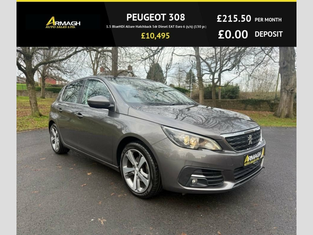 PEUGEOT 308 1.5 BLUE HDI 130 ALLURE EAT8 5DR ??2020??78,068MILES??£10,495 ????MOT EXPIRES 22/07/2026 ????FULL SERVICE HISTORY ????VISIBILITY PACK ????9.7" I-COCKPIT TOUCHSCREEN ????3D CONNECTED SAT NAVIGATION ????BLUETOOTH TELEPHONE FACILITY ????FRONT/REAR PARKING SENSORS ????MIRROR LINK/APPLE CAR PLAY ????DAYTIME RUNNING LIGHTS ????PANORAMIC ROOF ….AND MUCH MORE ? EXTENDED WARRANTY OPTIONS AVAILABLE ? FINANCE AVAILABLE ?? CLICK AND DELIVER AVAILABLE ON REQUEST ???? ALL CREDIT/DEBIT CARDS ACCEPTED ???? ALL TRADE INS WELCOME ????Check out our 5 star google reviews ??OFFICE:02837528557 ????SHANE:07470186374 OR CALL IN AND SEE US???? 57 LISANALLY LANE ARMAGH BT617HF ????ALL FINANCE PACKAGES CAN BE ADJUSTED TO SUIT YOUR BUDGET???? ???????? ???????? https://www.armaghautosalesltd.co.uk/finance-application/7519714/apply?deposit=0&reference=a8a37d94-afdf-4dd6-b36a-8405b7be17a0&term=60&mileage=0&facility_type=HP&credit_rating=excellent 1-3 - 2-3 Folding Rear Seat, 12V Power Socket, 17in Alloy Wheels - Rubis Diamond Cut, 3D Connected Navigation, 6-Speaker Radio - MP3 Compatible, Airbags - Adaptive Driver and Front Pass, Airbags - Driver and Front Passenger Sid, Airbags - Front and Rear Curtain, Alarm - Thatcham Category 1, Anti-Lock Braking - ABS - Electronic Bra, Automatic Door Locking When Moving Off, Automatic Dual Zone Climate Control, Automatic Hazard Light Activation Upon H, Bluetooth Telephone Facility, Central Front Armrest with Height and Lo, Child Locking Functionality on Rear Door, Cielo Panoramic Glass Roof with Electric, DAB Digital Radio, Dark Tinted Rear Side and Tailgate Windo, Dashboard Trim - Satin Chrome,