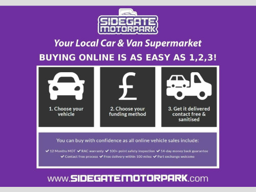 NEW ARRIVAL, THIS CAR IS CURRENTLY AWAITING FULL PHOTOGRAPHY! BUT DONT MISS OUT, RESERVE THIS CAR TODAY FOR ONLY £99!! Sidegate Motors are pleased to offer you this stunning vehicle that is in stock and available. WE DELIVER NATIONWIDE and this vehicle comes with either the balance of the manufacturers warranty or a minimum of 3 months Platinum Warranty which can be used NATIONWIDE and 12 months MOT included in the sale price. It has undergone 100+ safety and condition check, carried out by our expert workshop team. We have also completed a full HPI check on this vehicle, so you can buy in confidence knowing you are getting a great deal and a great car! We always welcome part exchanges and will always pay top prices for them. Please feel free to ask for a PERSONALISED VIDEO WALK AROUND which we can send straight to you! We are Sidegate Motors Ltd and Sidegate Motorpark with over 50 years experience selling quality used cars and vans, we have also won numerous awards for excellent customer satisfaction and the quality of our service. This includes the prestigious HIGHLY RATED AWARD FOR THE LAST FOUR YEARS 2021, 2022, 2023 and 2024 from Autotrader, in 2022 we were also named as a finalist in the AUTOTRADER CUSTOMER CHOICE AWARD. In 2023 we were honoured to WIN an award at the 2023 MOTOR TRADER INDEPENDENT DEALER AWARDS and be HIGHLY COMMENDED at the CAR DEALER AWARDS. This is a testament to the pride we take in the quality of our vehicles and also the outstanding customer service we provide all of our customers. We prepare all vehicles to a high standard and every vehicle includes a comprehensive warranty. This vehicle can also be bought using our flexible finance packages and no deposit options are available if required. Our finance packages are flexible for any budget and we can normally find a solution for all credit types. We would love to talk to you about this vehicle in more detail, please give us a call or email so we can answer any questions you may have!