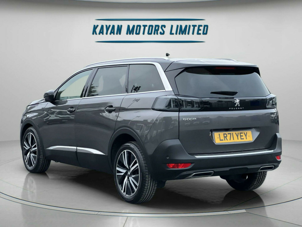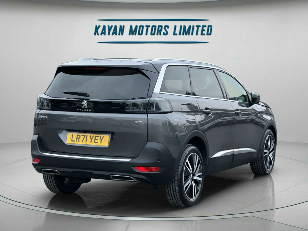 ------PART/EXCHANGE WELCOME. NATIONWIDE WIDE DELIVERY. -----,HPI CLEAR, ULEZ COMPLIANCE, FULL-SERVICE HISTORY, 2 KEYS AND 1 YEAR FREE WARRANTY FOR YOUR PEACE OF MIND.=================This 2021 Peugeot 5008 PureTech GT Premium boasts an MOT valid until July 2026, offering excellent peace of mind for its next owner. This Euro 6 compliant 1.2 litre petrol model, registered in 2021, has been well maintained with its last service completed on 31st July 2025 at 52,220 miles. The GT Premium trim level includes a host of desirable features such as a Driver and Passenger Seat Pack with heated and memory seats, power folding door mirrors with LED courtesy lights and blind spot assistance, and an automatic dual zone diffusion air conditioning system for ultimate comfort.Experience superior sound with the FOCAL Premium HIFI speaker system and seamless connectivity through Mirror Screen, supporting both Apple CarPlay and Android Auto. The Peugeot 5008 is renowned for its practicality, offering seven seats and a generous boot space, making it ideal for families or those needing versatile cargo capacity. With an impressive highlight fuel economy of 47 mpg, this vehicle offers a compelling blend of performance, comfort, and efficiency, setting it apart from other vehicles in its class. v sockets x3 - dashboard - rear cabin and load area, 19in alloy wheels - san francisco - matt onyx black - diamond cut, 3d connected navigation, 6-speaker radio - mp3 compatible, abs - anti-lock braking system with ref - electronic braking distribution and afu - emergency braking assistance, aikinite contrast stitching to armrest - gear lever gaiter and dashboard facia, airbags - adaptive driver and front passenger, airbags - driver and front passenger side, airbags - front and rear curtain, alarm, aluminium longitudinal roof bars, aluminium pedals, automatic door locking when moving off, automatic hazard light activation upon heavy brake application, automatic and dual-zone diffusion air-conditioning system, bi-tuner radio including dab - digital radio, blue ambient lighting for central connecting zone, blue ambient lighting to front door panels and cupholders, bluetooth telephone facility, body protectors in black, brumeo fabric trimmed door armrests, central front armrest with butterfly-wing opening and illuminated storage compartment, childrens pack, chrome grille, chrome rear bumper scuff plate, chrome window line trim, dsc - dynamic stability control and asr - electronic anti-skid system, dark tinted rear side and tailgate windows, dashboard trim - satin chrome, digital instrument panel trim - satin chrome, door mirror shells - nera black, door mirrors with blind spot detection indicator and auto dipping function in reverse gear, drive assist plus pack, driver attention alert system 1 - daa1, driver sport pack, driver and front passenger seat mechanical height adjustment, driver and passenger seat pack, electric child locking functionality on rear windows and doors, electric parking brake includes hill assist, electric power steering with reach and rake adjustable steering column, electronic code immobiliser, extended traffic sign recognition, exterior door handles - body-colour, exterior temperature indicator with ice warning, focal premium hifi speaker system, focal tweeter speaker grilles in belem bronze metal effect finish, flocked front door pocket interior, flocked glove box interior, fog mode - led headlights switch on low beam headlights with reduced intensity when rear fog lights are activated, footwell lighting, front ambient lighting, front central console with two cup-holders, front door panel recess trim - satin chrome, front door sills with stainless steel insert featuring peugeot lettering, front interior light with reading spotlights x2 - row 2 interior light with reading spotlights x2 - row 3 reading spotlights x2 with timer, front optimised safety headrests and rear retractable headrests - x3 - height-adjustable, front three-point retractable seatbelts - height-adjustable with pre-tensioners and force limiters, front windscreen wiper with magic wash cleaning system, front wing trim - chrome, full led headlights with static cornering lighting and daytime running light extension, gt emblems - front wings and tailgate, gear shift indicator, gloss black b and c pillar and aerodynamic deflector trim, gloss black front bumper air scoops, gloss black rear cluster connecting strip, grab handles x4 - retractable - damped, hands free start system - keyless start, headlights left on audible warning, heated rear windscreen with integrated antenna, horn - two tone, isofix child seat fittings - x3 - second row rear seats, illuminated glove box, illuminated vanity mirrors, interior door handles - satin chrome, led daytime running lights - saber style with integrated led indicators, led interior lighting, led rear lights including reversing lights - scrolling indicators and peugeot 3 claw effect light signature with daylight function, led rear number plate lighting, led side indicator lights integrated into door mirrors, lane departure warning system, map pockets on front seat backs, mirror screen - apple carplay and android auto, mistral black floor mats with aikinite contrast stitching, mistral full-grain perforated leather steering wheel with aikinite stitch detail and satin chrome gt line emblem, multifunction trip computer, one-touch electric front and rear windows with pinch protection, peugeot open and go system, parking sensors - front, peugeot connect sos and assistance, peugeot i-cockpit, power folding door mirrors - includes led courtesy approach lights, programmable cruise control and speed limiter with intelligent speed adaption, puncture repair kit including compressor - sealant cartridge and towing eye, rear coat hooks x2, rear parking aid, rear passenger usb charging sockets x2 - type a, rear spoiler - body colour, rear three-point retractable seatbelts x3 - with pre-tensioners and force limiters i