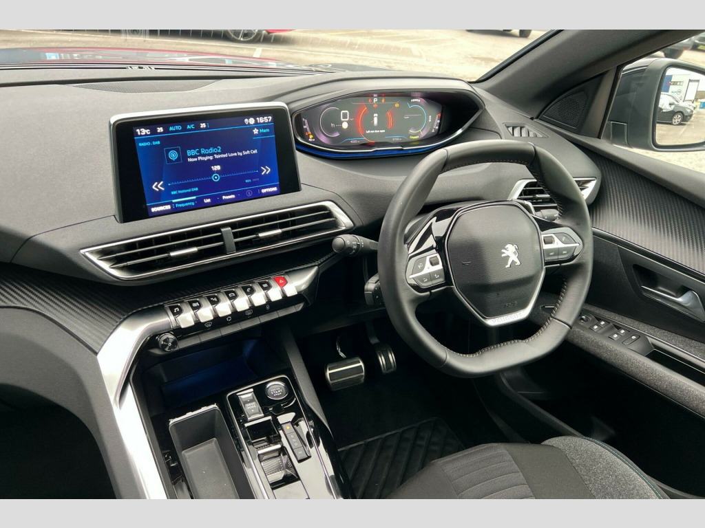 This 2024 Peugeot 5008 Active is a standout choice, boasting exceptionally low mileage for its year at just 4550 miles and having had only one owner. This seven seat SUV is powered by an efficient 1.2 litre petrol hybrid engine, meeting Euro 6 emission standards. Inside, you'll find a sophisticated cabin featuring blue ambient lighting that enhances the head up instrument panel and display. Comfort is assured with the automatic dual zone diffusion air conditioning system, providing climate control for all occupants.