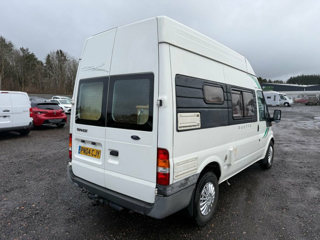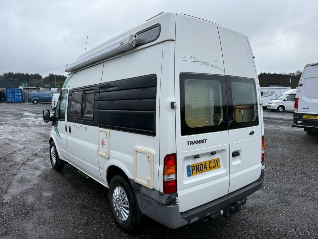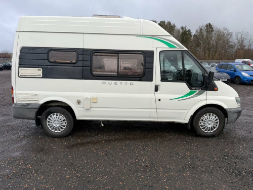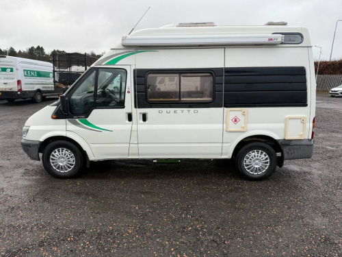 his is a great example of the really desirable Autosleeper Duetto built on the Ford Transit cab with a 2.4 turbodiesel engine. This 2 berth camper has either 2 singles or a large double plus a very well equipped kitchen and shower. Camper van is in tremendous condition for its age and will come with a full fresh service and mot . Air Bag Driver, Armrest, Bumpers, Central Door Locking, Cigar Lighter, Clock, Computer (Driver Information System), Cup Holder, Doors - Rear Hinged, Doors - Sliding (Left), Exterior Lighting, Head Restraints, Immobiliser, In Car Entertainment (Radio/Cassette), Left Hand Sliding Load Door, Mirrors External, Power Socket, Power-Assisted Steering, Rear Centre Step, Rear Spring Ride Height Pack, Seat Height Adjustment, Speakers, Steel Wheels, Sun Visor, Towing Equipment (Preparation), Upholstery Cloth, Windscreen Wiper