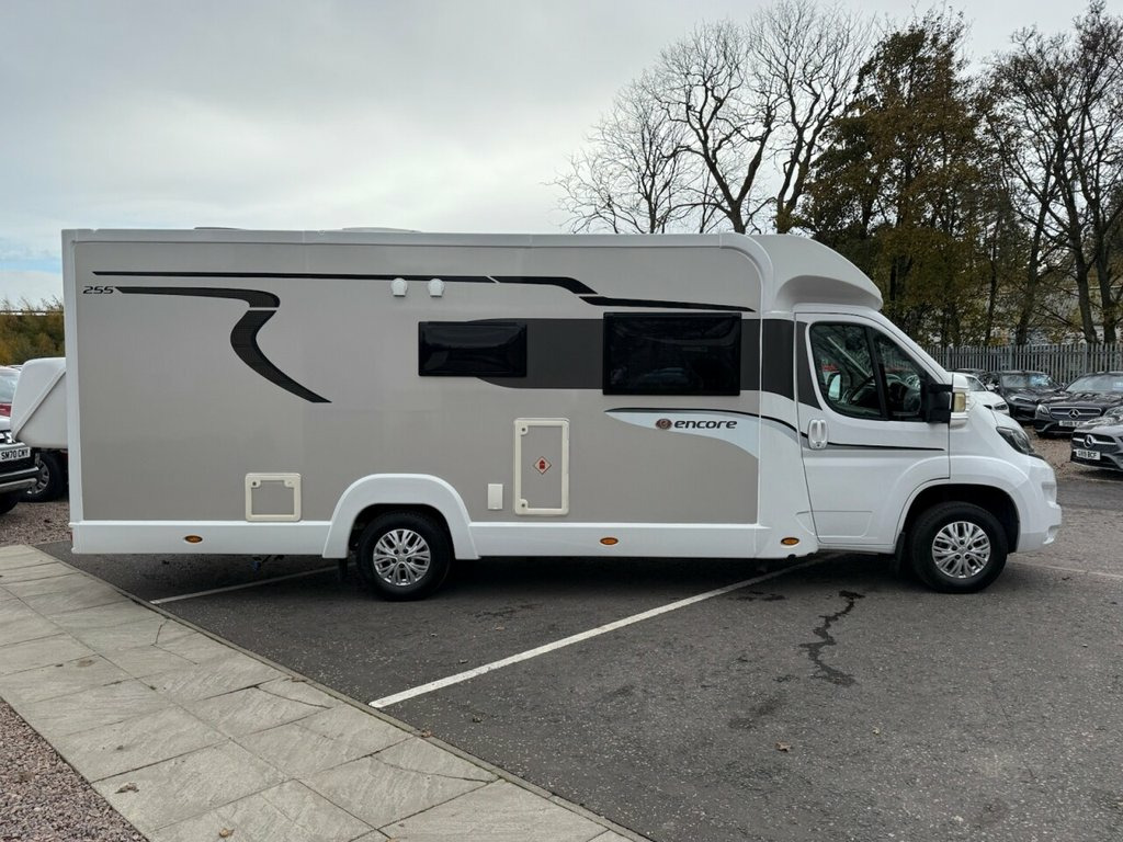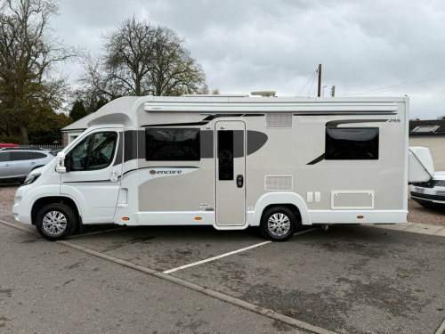 PEUGEOT ELDDIS ENCORE 255 2.0 DIESEL MANUAL 130 BHP 4 BERTH ( FRONT LOUNGE CONVERSION THAT FOLDS INTO LARGE DOUBLE BED, REAR BEDROOM WITH FIXED DOUBLE BED, CENTRAL KITCHEN, REAR ADJECENT SHOWER / WASHROOM, 4 BERTH, 4 SEATBELTS, ) Motorhome comes in a Peugeot white cab and grey body with Elddis encore 255 body decals,16 inch Elddis gloss silver alloy wheels, Elddis encore 255 body stylings, Upgrade Fiamma rear storage box, Dometic side wind out awning, Side awning door light, Roof solar panel, Large front roof window, Reversing camera, Upgrade external BBQ point, Upgrade external TV Ariel point, External storage lockers, Electric windows, Electric adjustable wing mirrors, Daytime lights, 6 speed manual gearbox, Central locking, LED trip computer speedometer display, Front cab blinds, 4 spoke steering wheel, Multi function steering wheel, Cruise control, Speed limiter, Climate control, Air conditioning, Peugeot Bluetooth stereo unit, Aux/Usb port, DAB radio, Bluetooth, Stunning plush half beige suede and cloth Elddis encore 255 front swivel captain chairs, Elddis encore 255 plush half beige suede and cloth seats through out, Front lounge that folds into bed area, Under bench fold out passenger seats with seatbelts, End bedroom with fixed double bed with adjacent bed screen, Huge under bed storage area, Upgrade ALDE hydronic heating system, Large waste and fresh water tanks, On board blinds and fly screen, Skylights throughout, Central kitchen with Tford 3 burner gas hob with 1 12V Power Socket, 12V Power Socket - Cargo Area, 2-Button Plip Remote Control Central Loc, 220A Alternator, ABS - Anti Lock Braking System, Central Dash Folding Clipboard, Conversion Interface Box, Deadlocks, Digital Clock, Door Mirrors - Electrically Adjustable a, Door Open Warning for Cab Doors, Drivers Airbag, Drivers Seat Rake - Reach Height and Lum, Dual Cab Passenger Seat, EBFD - Electronic Brake Force Distributi, ESP - Electronic Stability Programme, Electric Front Windows, FM - DAB Radio, Filtering Tinted Glass, Floor - Non Slip Hardwearing Front Cab C, Four Speed Heater Blower - Four Face Lev, Front Door Armrests, Gear Shift Indicator, Halogen Headlamps with Clear Polycarbona, High