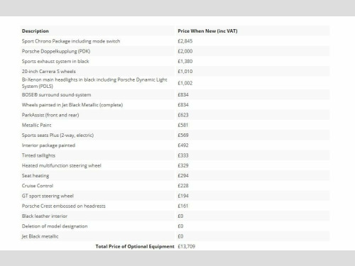 2018 (18) Porsche 718 Cayman S 2.5T PDK Coupe finished in an excellent specification and offering outstanding performance with everyday usability. Powered by the 2.5-litre turbocharged petrol engine producing 350 ps, paired with the highly regarded PDK automatic gearbox and Euro 6 compliance. The car is supplied with MOT and warranty included and comes with 2 keys. It has had 3 previous owners and benefits from a mixture of Porsche main dealer and specialist service history. Significant recent maintenance has been carried out, including replacement of the water pump and timing chain tensioner at 64,000 miles, thermostat replacement at 64,000 miles, and Porsche bank 1 inlet replacement with cam adjuster at 66,000 miles. The drive belt was replaced at 40,000 miles, demonstrating careful ownership and preventative maintenance. Specification highlights include heated seats, heated steering wheel, switchable sports exhaust with exhaust valve, Sport Plus and Comfort driving modes, electric folding rear spoiler, BOSE sound, satellite navigation and media system. The car drives superbly and delivers the sharp handling and performance expected from a Cayman S. A well-maintained and highly engaging sports coupe that represents excellent value. Viewing and test drives are welcome, and part exchange may be considered. This car also comes with a ghost immobiliser Heated Multifunction Sports Steering Whe, PDK Gear Selector in Brushed Aluminium, Sports Exhaust System in Black, 20in Alloy Wheels - Carrera S, Sports Tailpipes - Black, Wheels Painted in Satin Black, 12-Volt Socket in Passenger Footwell, 19in Alloy Wheels - Cayman S, 64 Litre Fuel Tank, Adjustable Fan with Air Recirculation an, Air Conditioning with Integrated Active , Alarm System, Anti-Theft Wheel Bolts, Automatic Headlight Activation including, Automatically Extending Rear Spoiler, Bi-Xenon Headlights with Integrated LED , Brake Calipers - Red, Clothes Hooks on Seat Backrests, Connect Plus, Digital Displays for Vehicle Speed - Cho, Digital Radio, Door Sill Guards - Model Designation Log