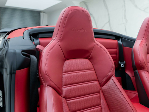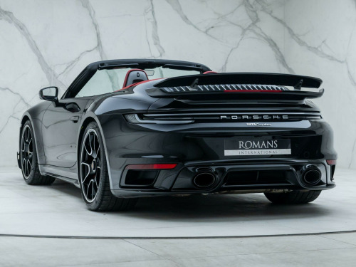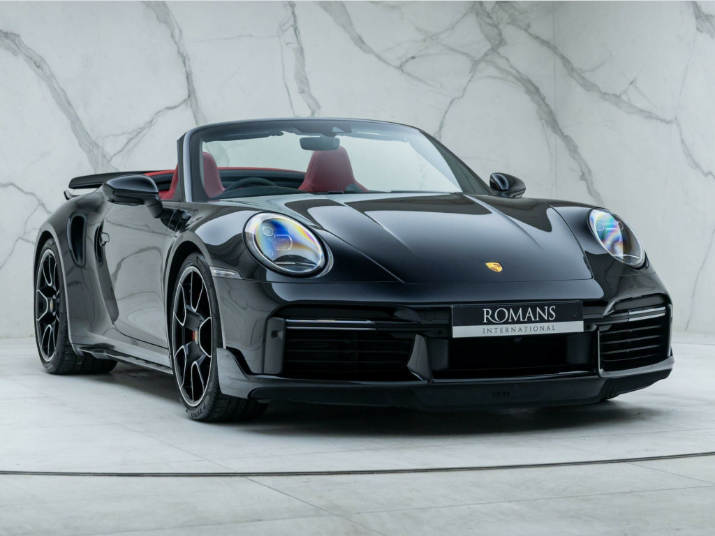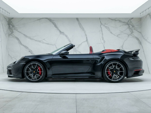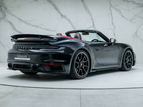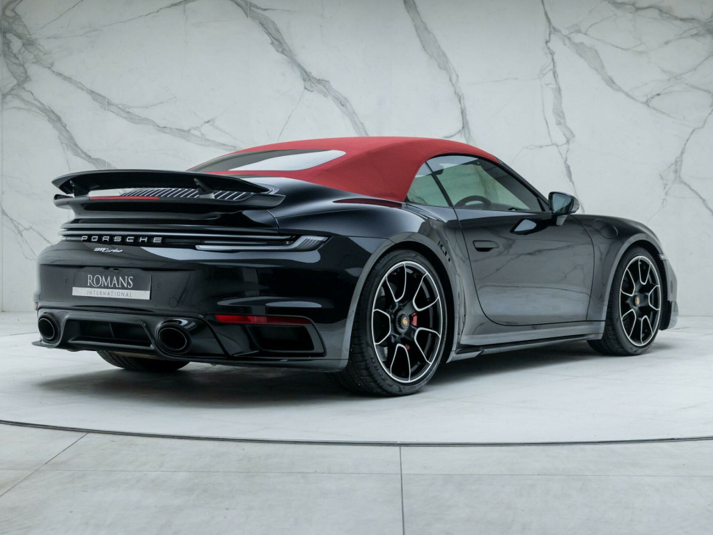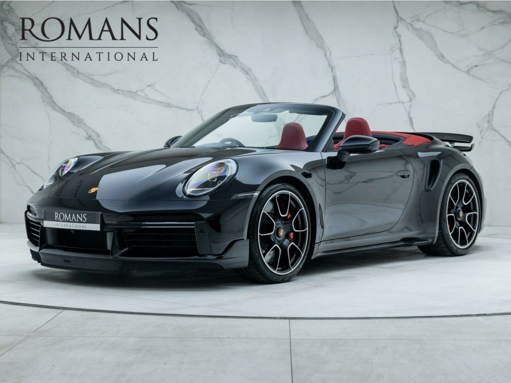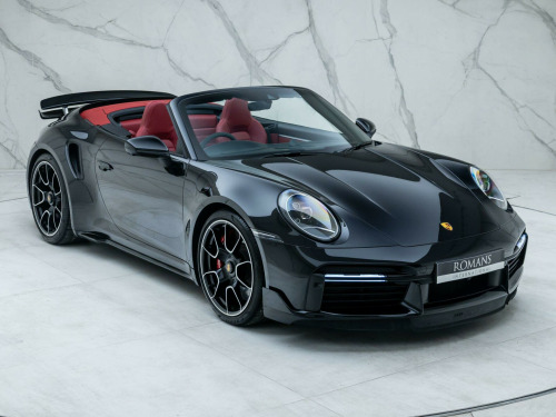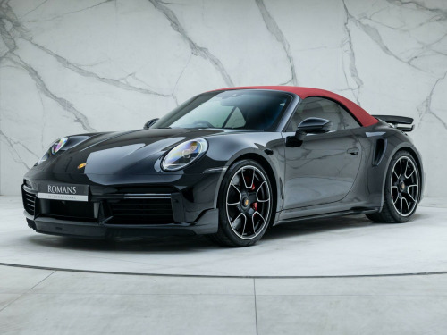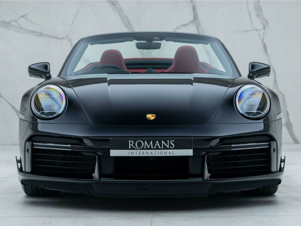 Finished in Jet Black Metallic Paint with Black & Bordeaux Red Leather - Desirably Equipped with SportDesign Package 911 Turbo & Front Axle Lift System - Supplied with Romans International Platinum Warranty - Paint Protection Film (PPF) Applied to Front End - UK SuppliedOptional Extras:20/21-Inch 911 Turbo S Exclusive Design Wheels Painted in High-Gloss BlackJet Black Metallic PaintSportDesign Package 911 Turbo Painted in High-Gloss BlackBlack & Bordeaux Red Two-Tone LeatherFront Axle Lift SystemBOSE Surround Sound SystemSports Exhaust System with Black TailpipesPASM Sport Suspension (-10 mm)18-Way Electric Adaptive Sports Seats Plus with Memory PackageParkAssist including Surround ViewElectric Folding Exterior MirrorsPower Steering PlusHeated Multifunction GT Sports Steering Wheel in Race-TexLight Design Package'PORSCHE' Logo LED Door Courtesy LightsExclusive Design TaillightsPorsche Crest on Storage Compartment LidSport Chrono Stopwatch Instrument Dial in Guards RedRev Counter in Guards RedConvertible Top in RedPaint Protection Film (PPF) Applied to Front EndStandard Features:Cruise ControlHeated Front SeatsKeyless GoPorsche Communication Management (PCM)Rear-Axle SteeringSmartphone Integration including Apple CarPlay & Android AutoTwo-Zone Automatic Climate ControlTyre Pressure Monitoring System. 20/21-Inch 911 Turbo S Exclusive Design Wheels Painted in High-Gloss Black, Jet Black Metallic Paint, SportDesign Package 911 Turbo Painted in High-Gloss Black, Black & Bordeaux Red Two-Tone Leather, Front Axle Lift System, BOSE Surround Sound System, Sports Exhaust System with Black Tailpipes, PASM Sport Suspension (-10 mm), 18-Way Electric Adaptive Sports Seats Plus with Memory Package, ParkAssist including Surround View, Electric Folding Exterior Mirrors, Power Steering Plus, Heated Multifunction GT Sports Steering Wheel in Race-Tex, Light Design Package, 'PORSCHE' Logo LED Door Courtesy Lights, Exclusive Design Taillights, Porsche Crest on Storage Compartment Lid, Sport Chrono Stopwatch Instrument Dial in Guards Red, Rev Counter in Guards Red, Convertible Top in Red, Paint Protection Film (PPF) Applied to Front End.