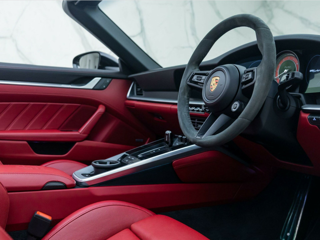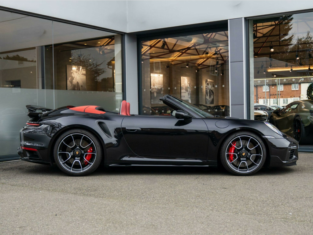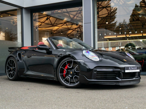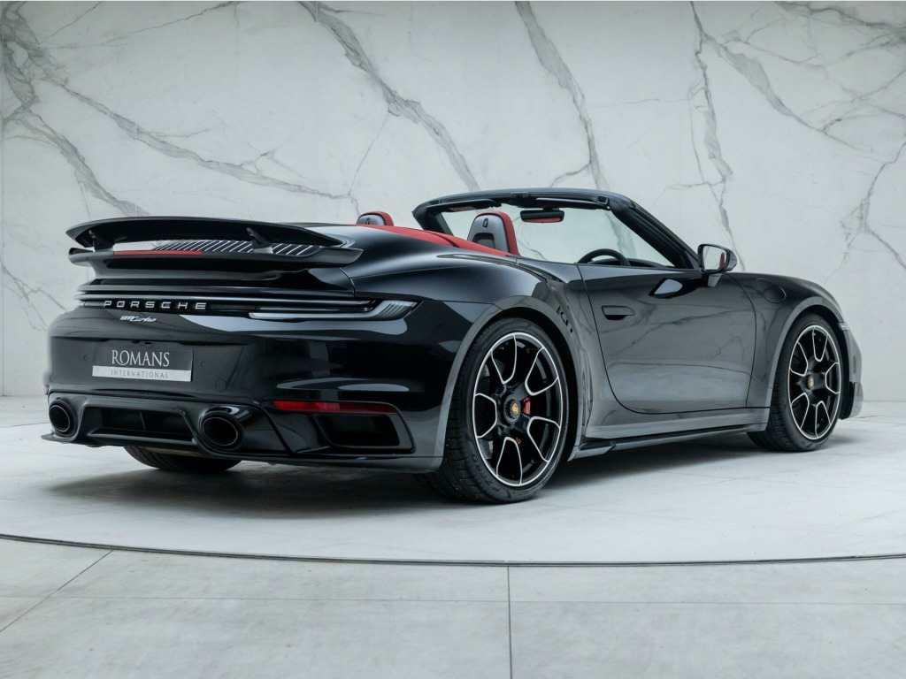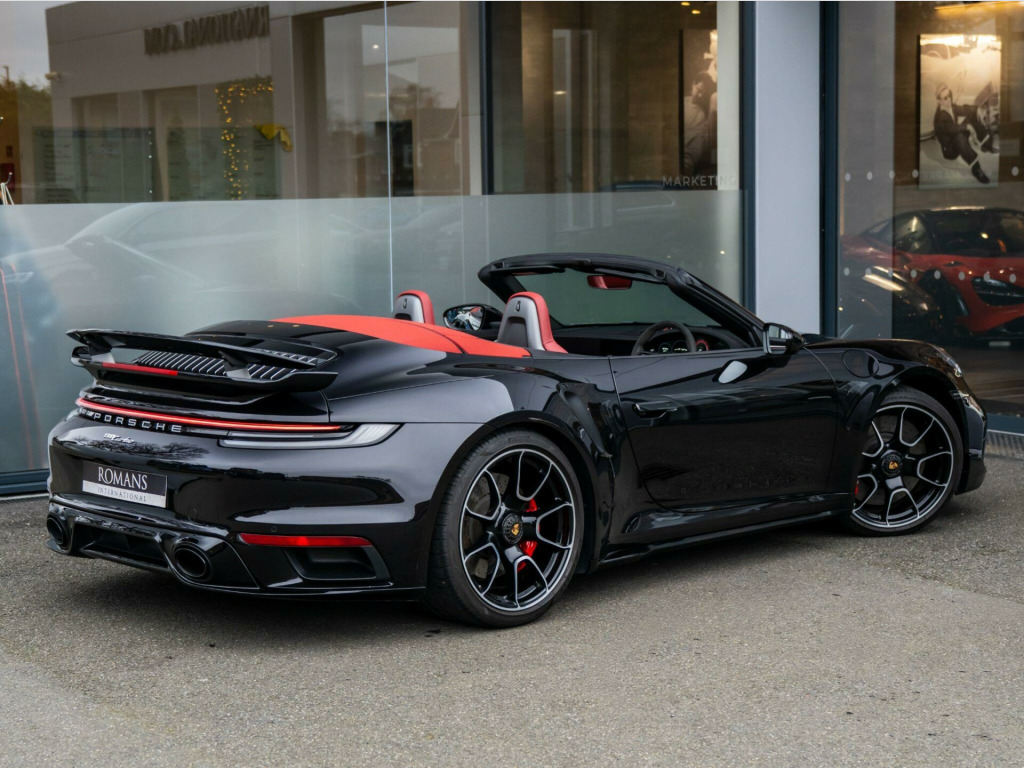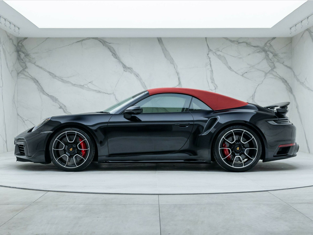 Finished in Jet Black Metallic Paint with Black & Bordeaux Red Leather - Desirably Equipped with SportDesign Package 911 Turbo & Front Axle Lift System - Supplied with Romans International Platinum Warranty - Paint Protection Film (PPF) Applied to Front End - UK SuppliedOptional Extras:20/21-Inch 911 Turbo S Exclusive Design Wheels Painted in High-Gloss BlackJet Black Metallic PaintSportDesign Package 911 Turbo Painted in High-Gloss BlackBlack & Bordeaux Red Two-Tone LeatherFront Axle Lift SystemBOSE Surround Sound SystemSports Exhaust System with Black TailpipesPASM Sport Suspension (-10 mm)18-Way Electric Adaptive Sports Seats Plus with Memory PackageParkAssist including Surround ViewElectric Folding Exterior MirrorsPower Steering PlusHeated Multifunction GT Sports Steering Wheel in Race-TexLight Design Package'PORSCHE' Logo LED Door Courtesy LightsExclusive Design TaillightsPorsche Crest on Storage Compartment LidSport Chrono Stopwatch Instrument Dial in Guards RedRev Counter in Guards RedConvertible Top in RedPaint Protection Film (PPF) Applied to Front EndStandard Features:Cruise ControlHeated Front SeatsKeyless GoPorsche Communication Management (PCM)Rear-Axle SteeringSmartphone Integration including Apple CarPlay & Android AutoTwo-Zone Automatic Climate ControlTyre Pressure Monitoring System. 20/21-Inch 911 Turbo S Exclusive Design Wheels Painted in High-Gloss Black, Jet Black Metallic Paint, SportDesign Package 911 Turbo Painted in High-Gloss Black, Black & Bordeaux Red Two-Tone Leather, Front Axle Lift System, BOSE Surround Sound System, Sports Exhaust System with Black Tailpipes, PASM Sport Suspension (-10 mm), 18-Way Electric Adaptive Sports Seats Plus with Memory Package, ParkAssist including Surround View, Electric Folding Exterior Mirrors, Power Steering Plus, Heated Multifunction GT Sports Steering Wheel in Race-Tex, Light Design Package, 'PORSCHE' Logo LED Door Courtesy Lights, Exclusive Design Taillights, Porsche Crest on Storage Compartment Lid, Sport Chrono Stopwatch Instrument Dial in Guards Red, Rev Counter in Guards Red, Convertible Top in Red, Paint Protection Film (PPF) Applied to Front End.