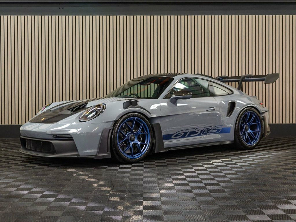 Introducing our stunning 2023 Article Grey with Indigo Blue Accent Package Porsche 911 992 GT3 RS with Weissach Package. This is a 1 owner from new, 1,850 mile from new vehicle benefiting from Porsche Manufacturer Warranty until December 2026 and has been protected from new by Full Body PPF (Paint Protection Film) (Decals Removed & Re Applied). Host to a fantastic factory specification including the all important Weissach Package with carbon fibre roll cage, Lightweight Magnesium Forged Wheels in Indigo Blue, Porsche Carbon Ceramic Brakes with optional black callipers, Tinted Matrix LED Headlights, Exclusive design tail lights, Front Axle Lift system, Additional Passenger 6 point harness, Reversing Camera and much more BOSE Surround Sound System, Tinted LED Main Headlights with Matrix B, Arctic Grey, PCCB - Porsche Ceramic Composite Brakes , Reversing Camera, Six-Point Racing Harness Seat Belt for P, Club Sports Package with Additional Road, Seat Belts - Silver Grey, Brake Calipers - Black High-Gloss, Wheels Painted in Indigo Blue, Weissach Package, Exclusive Design TailLights, 20in Front 21in Rear Alloy Wheels - GT3 , Accent Package Logos Indigo Blue, 20in Front 21in Rear Alloy Wheels - GT3 , 64 Litre Fuel Tank, 7-Speed Porsche Doppelkupplung - PDK, Airbags, Alarm System with Interior Surveillance, Apple CarPlay, Brake System - Brake Calipers in Red, Carbon Interior Package - Satin Finish, Chrono Package
