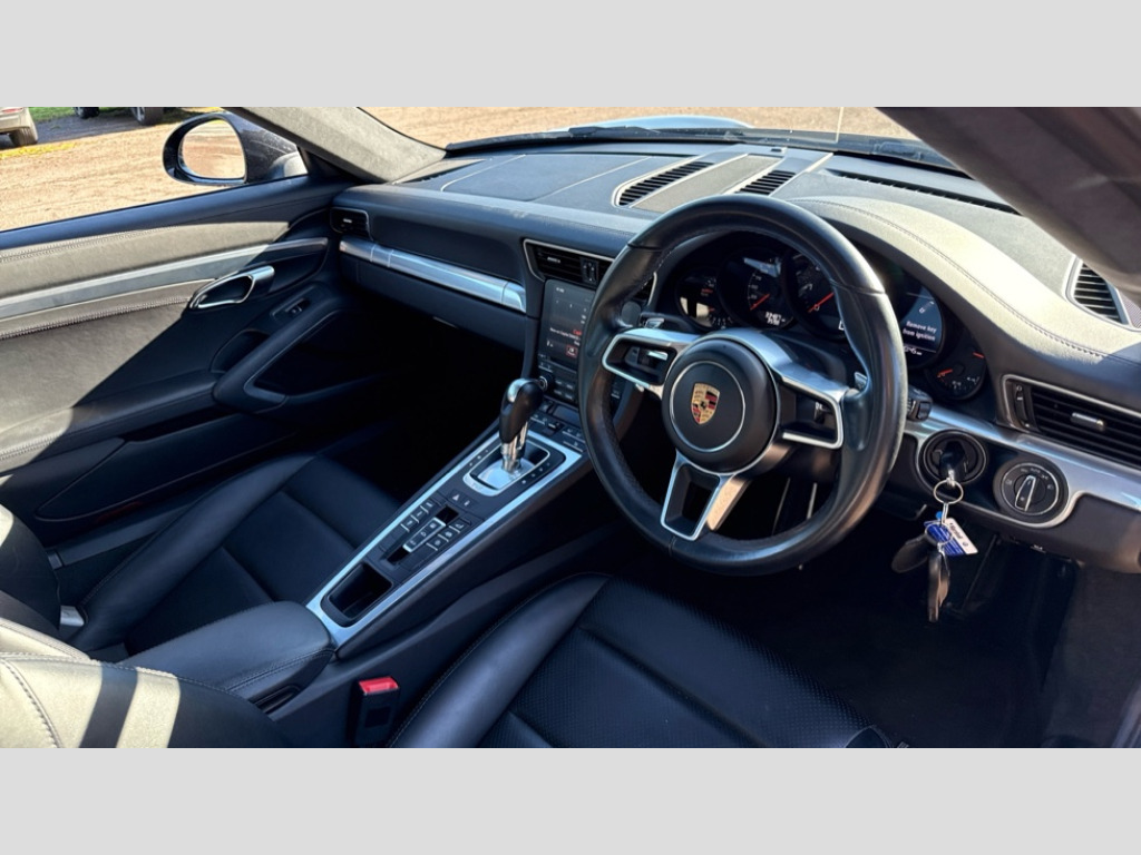 Porsche 911 2dr PDK Black rev counter, Mobile telephone preparation, On board computer, PCM voice control, Porsche communication management including navigation, Telephone module for PCM, Porsche Active Suspension Management (PASM), Porsche stability management (PSM), 2 USB ports, Auxiliary input socket, Connect Plus with Apple CarPlay, wireless internet access, Carfinder, Remote Vehicle Status and Remote Services, DAB Digital radio, SD card slot, Automatic headlamp levelling, Automatic headlights, Automatically extending rear boot spoiler, Body coloured bumpers, Electric front windows, Electrically adjustable and heated door mirrors, Green tinted heat insulating glass, Headlight washers, Heated rear window, Heated windscreen washers, Outer door sill guards in chrome-plated stainless, Welcome home function, Windscreen with grey top tint, 2 in-dash cupholders above glove compartment, 3 x 12V power sockets, Alcantara roof lining, Centre console storage, Clothes hooks on front seat backrests, Continuously variable dimming interior light, Dual zone automatic climate control, Extended headrests intergrated in front seats, Footwell illumination, Front centre armrest, Ignition Lock illumination, Interior orientation lighting, LED reading lights, Lockable glovebox, Manual height/reach adjust steering wheel, Pollen/active carbon filters, Rear centre armrest, Split folding rear seats, Storage compartments in doors, ABS, ASR + ABD, Driver/Front Passenger airbags, Electronic parking brake, Front head airbags, Front passenger airbag deactivation, Front seat thorax airbags, Front seatbelt pretensioners with force limiters, Height adjustable front seatbelts, Isofix location points on rear seats, Tyre pressure monitoring system, Alarm system with interior radar surveillance, Anti-theft wheel bolts, Porsche vehicle tracking system (VTS), Remote control central locking, Transponder engine immobiliser, Two stage locking, Sealing compound and compressor kit