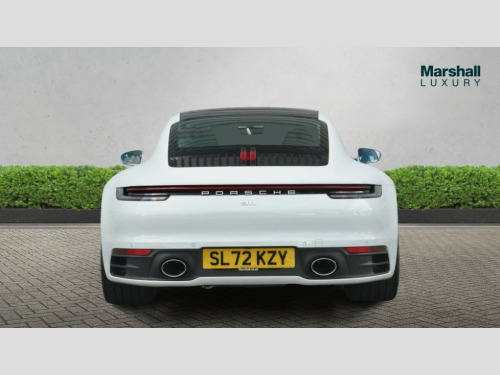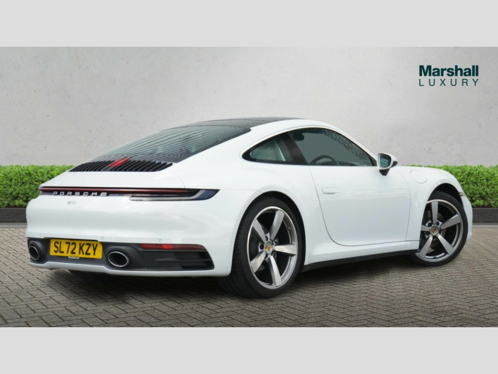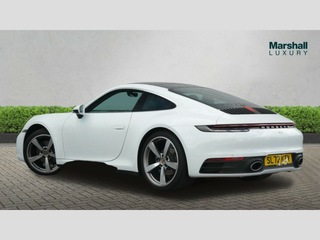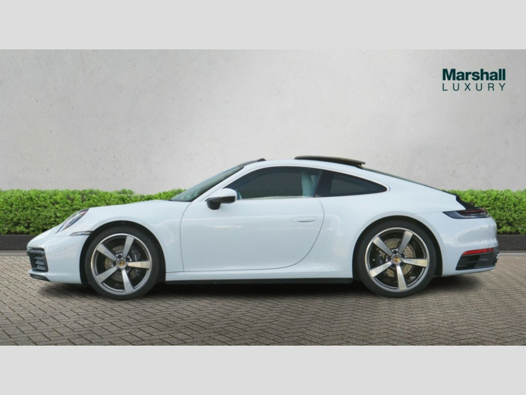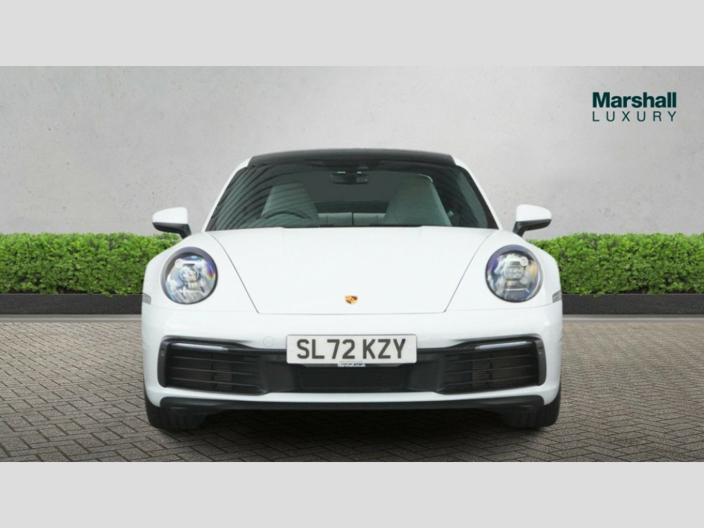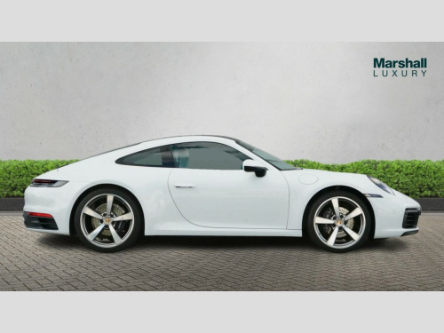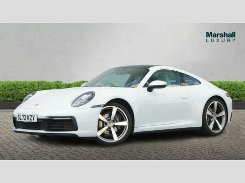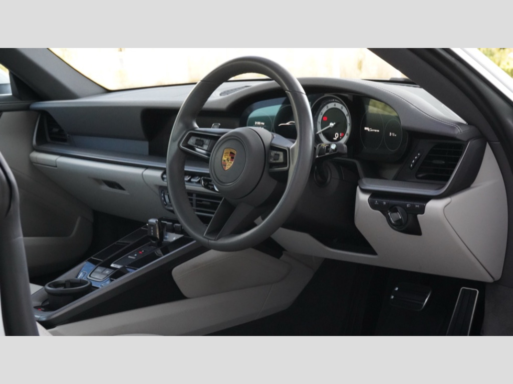 Porsche 911 2dr PDK 10.9 inch centre display, Automatic start/stop system, eCall emergency system, Gear indicator in rev counter, Instrument cluster with central analogue rev counter and two 7-inch TFT displays, Porsche Communication Management (PCM) including online navigation module, mobile phone preparation, audio interfaces and voice control system, Porsche WET Mode, Service indicator, Smartphone integration with Apple CarPlay and Android auto, Stationary management with HOLD function, Trip computer, Warn and brake assist including pedestrian protection, 8 Speed Porsche Doppelkupplung (PDK), Aluminium block and cylinder heads, Direct fuel injection (DFI), Expansion intake manifold, Four valve per cylinder, Integrated dry-sump lubrication with an on-demand oil pump, McPherson-strut suspension with anti-roll bar at front, Multi-link suspension with anti-roll bar at rear, Porsche Active Suspension Management (PASM), Porsche Stability Management (PSM), ABS with extended brake functions, Rear wheel drive, Twin turbocharger intercooled, Two gasoline particulate filter, Two three-way catalytic converters and on-board diagnostics for monitoring emission control system, VarioCam Plus variable valve timing and switchable valve lift, Water cooled with thermal management, 2 USB-C connectivity and charge ports in the centre console storage compartment, DAB Digital radio, "PORSCHE" lettering integrated in taillight strip, Auto deploying rear spoiler, Automatic headlight activation including welcome home lighting, Automatically dimming interior and exterior mirrors with integrated rain sensor, Black trim strips, Body coloured bumpers, Electrically adjustable heated exterior mirrors on door waist rails, aspherical on driver's side, Green tinted heat insulating glass, Heated rear windscreen, Intelligent lightweight body in Aluminium/Steel composite construction, LED auxiliary light units in the front end with position lights, direction indicators and side indicators, Power windows with one touch operation and door seal protection, Rear boot, Rear lid grille with vertical slats in high gloss black, Retractable door handles, Side air intakes at front with active cooling flaps and air blades, Side skirts trim in black, Side window trim strips in black, Taillight strip including integral parking lights and rear fog light, Trims on sideskirts in black, Windscreen washer system with aero wiper blades and washer jets, 12V socket in front passenger footwell, 2 individual seats in 2nd row, 2+2 seater with rear engine, 2-zone automatic climate control with separate temperature settings for driver and front passenger, Ascending centre console with storage compartment, Clothes hooks on seat backrests, Driver and front passenger illuminated vanity mirrors, Embossed leather on front center seat, side bolsters and front seat headrests, Front and rear head restraints, Heated front seats, ISOFIX child seat mounting points on passenger seat, LED door lights, LED footwell lights, LED glove compartment lighting, LED ignition light, LED luggage compartment lighting, LED orientation light, LED reading lights, Lockable glove compartment, Luggage compartment at front, Luggage compartment lid release, Particle/pollen filter with active carbon filter, PDK gear selector with automatic mode, manual gear selection via shift paddles on the steering wheel, Single front passenger seat, Smooth finish leather on steering wheel rim, door handles, door panel armrests and centre console storage compartment lid, Split folding rear seats, Storage compartments in each doors, Two individual cupholders 1x as inlet in centre console and 1x passenger side, 4 piston aluminium monobloc fixed + brake calipers at front and rear + brake calipers with black finish, Brake discs with 330mm diameter at front and rear, internally vented and cross-drilled, Electric parking brake, Electromechanical power brake, Full size two stage airbags for driver and front passenger, Pedestrian protection, Porsche side impact protection system includes side impact protection in doors, curtain, head/thorax airbags for driver/front passenger in each door, Tyre pressure monitoring system, Dashcam prep, Engine immobiliser with remote central locking and alarm system with ultrasonic sound based interior surveillance, Porsche vehicle tracking system (PVTS Plus), Tyre sealing compound and electric air compressor kit