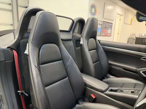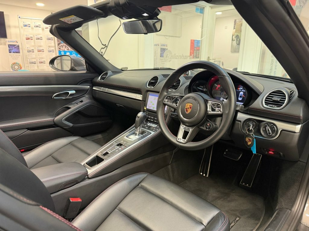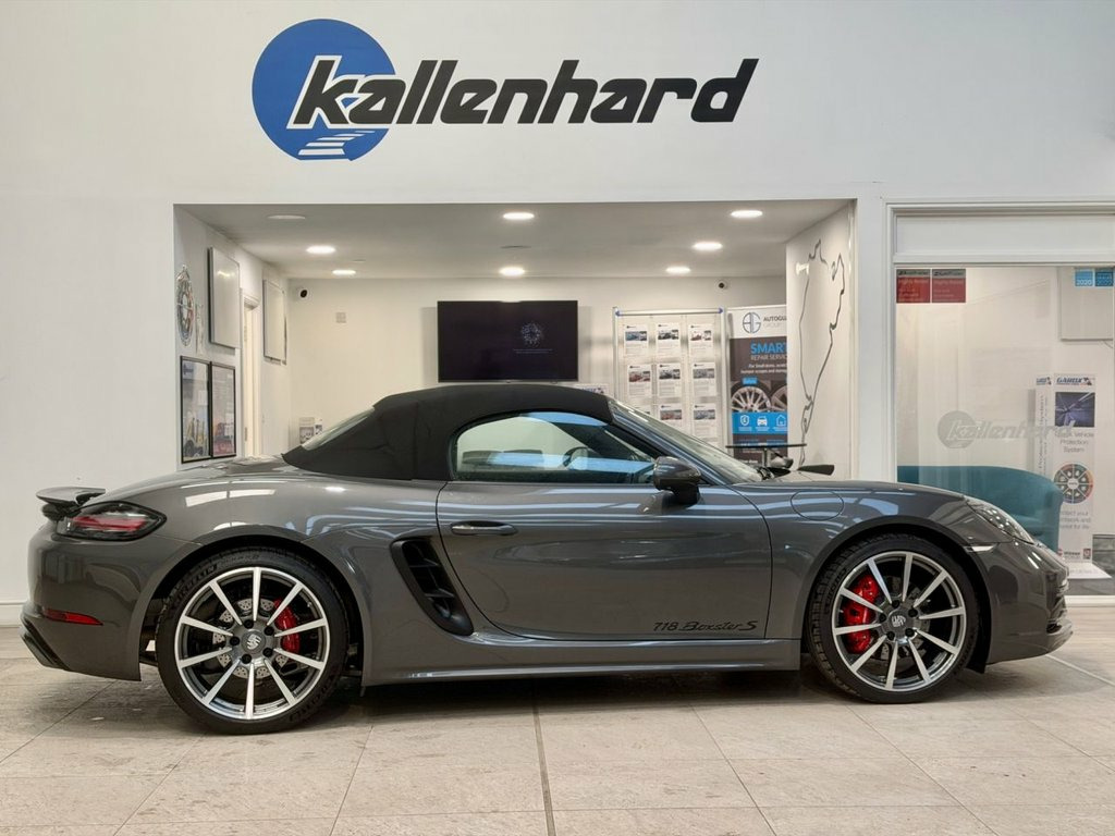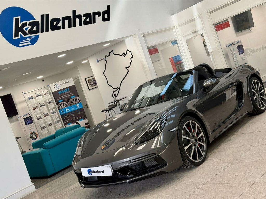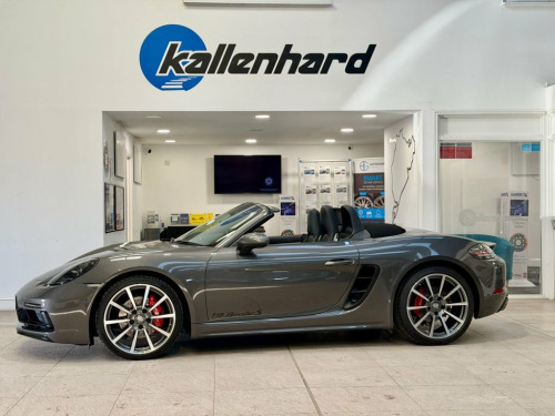 Experience pure open-top exhilaration with this stunning Porsche 718 Boxster 2.5T S, a beautifully balanced mid-engined sports convertible showing just over 6,000 miles from new. Presented in exceptional condition, it embodies everything that makes the Boxster S such an icon: precision engineering, razor-sharp handling and a driving experience that feels alive in your hands. Its 2.5-litre turbocharged flat-four delivers a thrilling 350 PS, channelling power through Porsche's lightning-fast PDK transmission. The result is immediate response, effortless acceleration and a soundtrack that grows richer as the revs climb. On twisting B-roads it feels agile and composed, and on longer journeys it settles into a comfortable, confidence-inspiring rhythm. Despite its performance pedigree, the 718 Boxster S remains surprisingly efficient thanks to its modern turbocharged engine and Euro 6 compliant GPF system. It offers impressive fuel economy for a car of this capability, making spirited weekend drives and relaxed everyday use equally rewarding. With mileage this low, performance this strong and condition this good, this 718 Boxster S brings together the thrill of a true sports car with the refinement and efficiency expected from Porsche's latest generation of engineering. Service History 24/01/2024 @3421 miles Porsche centre Tewkesbury 10//12/2025 @ 6150 miles Porsche Silverstone At Kallenhard Engineering we specialise in Performance, Prestige, and 4×4s. Because GT Sports Steering Wheel, Agate Grey, Electrically Folding Exterior Mirrors, Sports Tailpipes - Black, Sport Chrono Package including Mode Swit, SportDesign Package Painted in Black - H, Seat Belts - Bordeaux Red