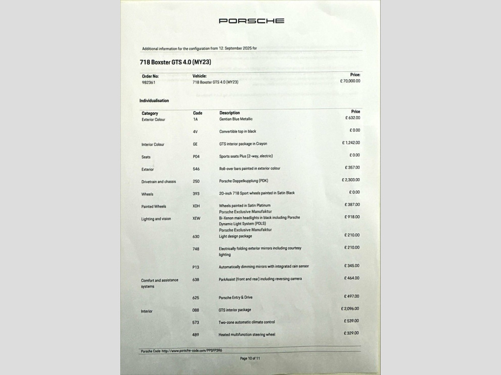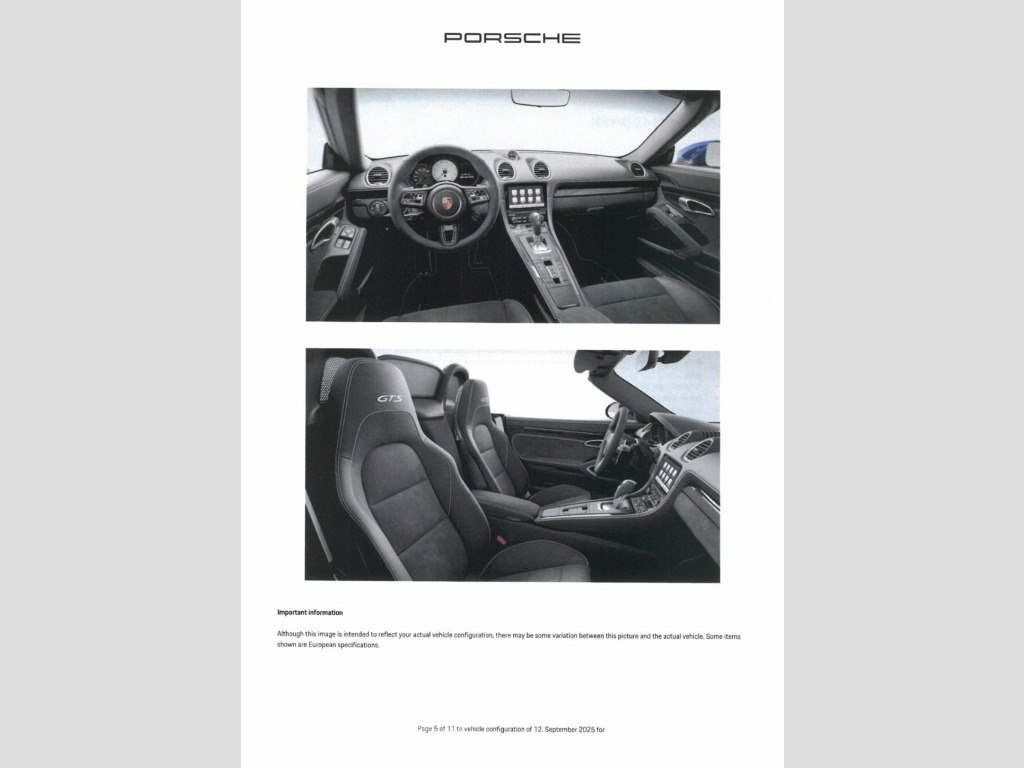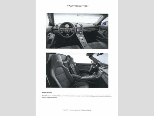 This 2023 Porsche 718 Boxster GTS boasts a clear vehicle history, offering peace of mind alongside its exhilarating performance. Powered by a potent 4.0 litre Euro 6 petrol engine, this model delivers an exceptional driving experience. Inside, you'll find a host of desirable features designed for comfort and convenience, including seat heating, front and rear park assist, and the advanced Porsche Communication Management system which includes navigation and Apple CarPlay. The car is also equipped with Bi-Xenon headlights featuring integrated LED daytime running lights, and air conditioning with an active carbon filter to ensure a pleasant cabin environment. The performance of this 718 Boxster GTS is truly remarkable, with an impressive 0-60mph acceleration time of just 4.0 seconds. This swift acceleration demonstrates the superior engineering and power delivery that sets this Porsche apart from other vehicles in its class. Combined with its sophisticated features and pristine provenance, this 2023 GTS represents a compelling choice for those seeking a high performance sports car. 12-Volt Sockets in Passenger Footwell an, 20in Alloy Wheels - 718 Sport - Satin Bl, 718 Logo on Gear lever, Adjustable Fan with Air Recirculation an, Air Conditioning with Integrated Active , Alarm System, Anti-Theft Wheel Bolts, Ascending Centre Console with an Uncover, Automatic Deploying Rear Wing, Automatic Headlight Activation including, Bi-Xenon Headlights with Integrated LED , Black Model Designation GTS 4.0 on Doors, Brake Calipers - Red, Clothes Hooks on Seat Backrests, Convertible Top Colour - Black, Cruise Control, Dashboard Trim Strips and Centre Console, Digital Displays for Vehicle Speed - Cho, Digital Radio, Door Panel Armrest and Centre Console Ma, Door Sill Guards - Model De