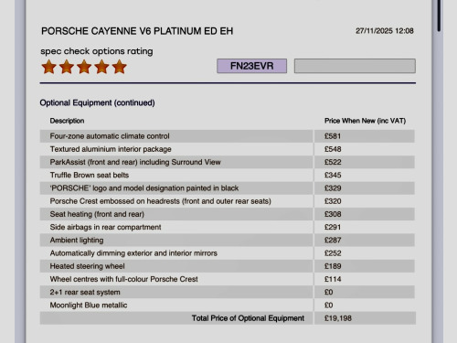 This 2023 Porsche Cayenne 3.0 V6 E-Hybrid 17.9kWh Platinum SPECIAL Edition Coupe is currently available for £88,230 with P/ElecPlug engine and Auto Clutch Manual gearbox. For more information or to arrange a viewing, click here to send us an email using form below.