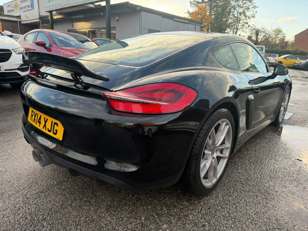 Full Service History, Porsche History until 2022, Genuine TechArt Front Valance, Genuine GT4 Side Intakes, Front and Rear Parking Sensors, DAB Radio, Navigation, PCM, LED Headlights, Refurbished alloys with very good Tyres all round, This 2014 Porsche Cayman 981 offers a compelling driving experience with its efficient 2.7 litre petrol engine. This model benefits from Bi Xenon headlights that feature integral turn signal indicators, and the convenience of automatic headlight activation. Inside, you will find air conditioning to ensure comfort during every journey.The Cayman 981 stands out with its inclusion of Xenon headlights and a helpful headlight assistance system, demonstrating a thoughtful approach to driver convenience. Furthermore, its placement in a low insurance group makes it an attractive proposition for many drivers, indicating excellent value compared to similar vehicles. v socket - centre console, 18in alloy wheels - cayman, 2 x 25 watt output, 7in colour display, abd - automatic brake differential, abs - anti-lock brake system, asr - anti slip regulation, active carbon filter, air conditioning, airbag - driver, airbag - head, airbag - passenger, airbag - thorax in seat side bolsters, analogue gauges for engine speed - vehicle speed - fuel level, anti-theft wheel protection, auto-deployed rear spoiler, automatically extending rear spoiler, auxiliary led light modules in front apron containing daytime running lights and position lights, bar in front of front end air intake in black, bi-xenon headlights with integral turn-signal indicators, brake assistant, brake calipers - black, brake calipers with black paint finish, cdr audio system, clear glass h7 halogen projection headlights with integral turn signal indicators, clothes hooks on seat backrests, cupholders, daytime running lights - led, door brakes with three rest positions, door entry guards with model designation, door mirrors - electrically adjustable and heated, doors and hood front and rear made of aluminium, edtc - engine drag torque control, electric parking brake, electric windows - lifts with one touch operation, electronic immobiliser - transponder system, enhanced porsche stability management - psm, front lip spoiler in black-unpainted, gear indicator in rev counter, glove compartment - lockable, glove compartment illumination, green tinted heat-insulating glass, headlight assistance, headlight cleaning system, heated glass rear screen, instrument cluster with central rev counter and 4.6in tft vga display, integral head restraints on seats, integrated cluster of three round instruments, interior orientation lighting and reading light, led reading lights orientation ignition lock and vanity mirror lighting, led rear lights and third brake light, lightweight bodyshell in steel-aluminium design, lightweight spring-strut suspension, manual seat height adjustment, on-board computer, on-board diagnostics for monitoring of the emission control system, operated hood with heated glass rear screen, porsche logotype and model designation on tailgate in high-gloss chrome look, pad-wear sensors on each brake pad, permanent digital displays for odometer - trip odometer - clock - external temperature and speed, porsche side impact protection - posip, power assisted steering with variable steering ratio, power release buttons for luggage compartment, pre-tensioners and force limiters at front, remote central locking, rooflining in chosen interior colour in black platinum grey or luxor beige, seats - adjustable backrests - electric, seats - sports, shell hot-dip galvanised on both sides, single cd drive supporting mp3 audio playback, speakers x4, sport mode button, sport steering wheel with manual height and reach adjustment, steering wheel - manual height and fore-aft adjustment, steering wheel - rim - gear lever and door handles covered in leather in interior colour, steplessly adjustable fan with air recirculation and defroster functions, storage compartment in each door, tyre sealing compound and electric air compressor, underbody panelling, universal audio interface - aux, vanity mirrors in both sun visors, water-repellent coating on side windows, welcome home lighting, windscreen washer system with two wiper speeds and heated washer jets