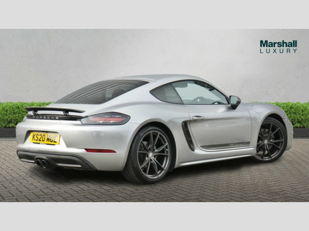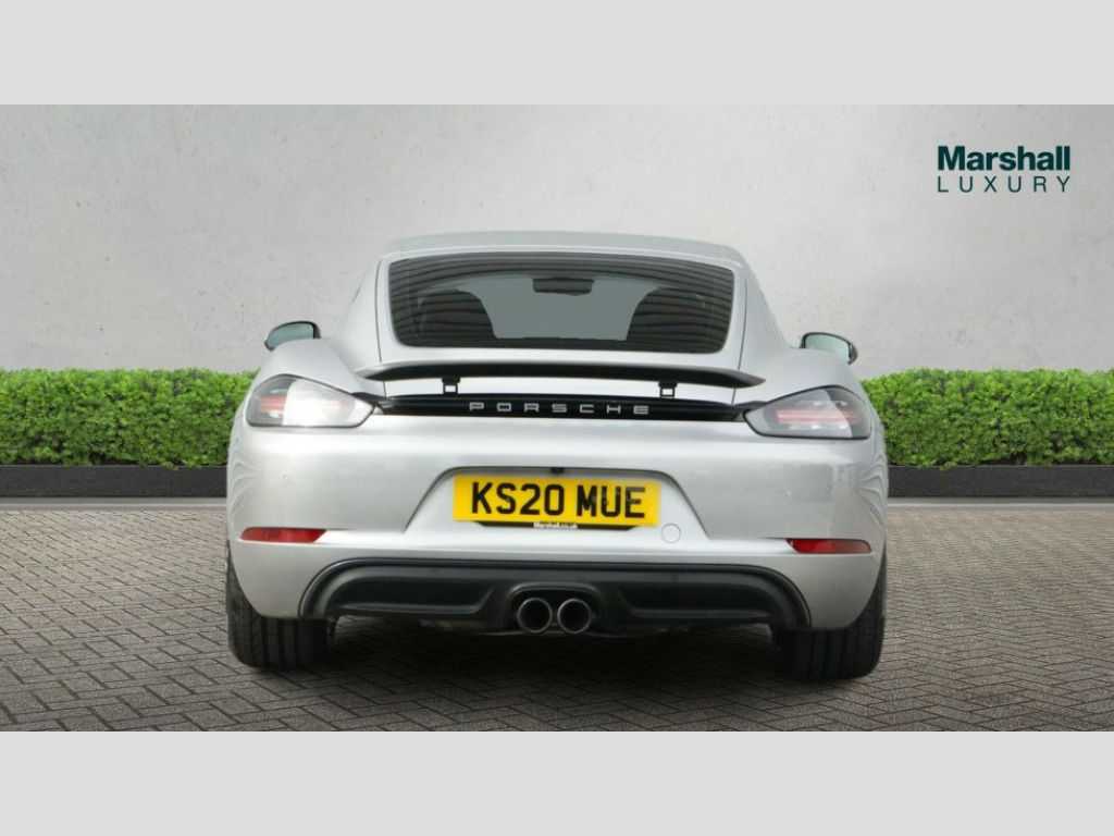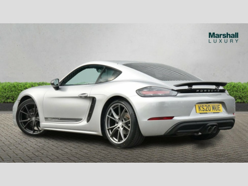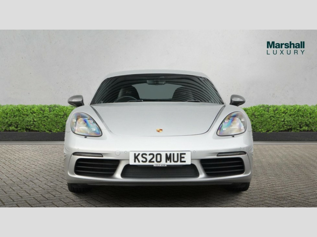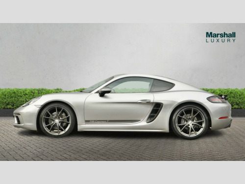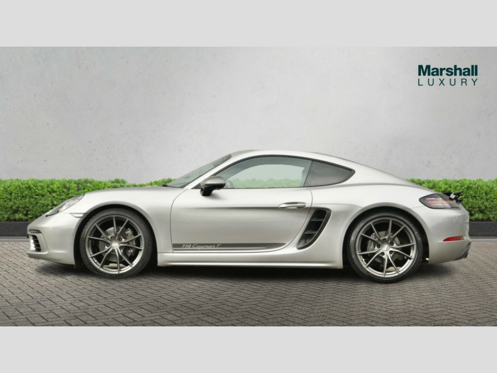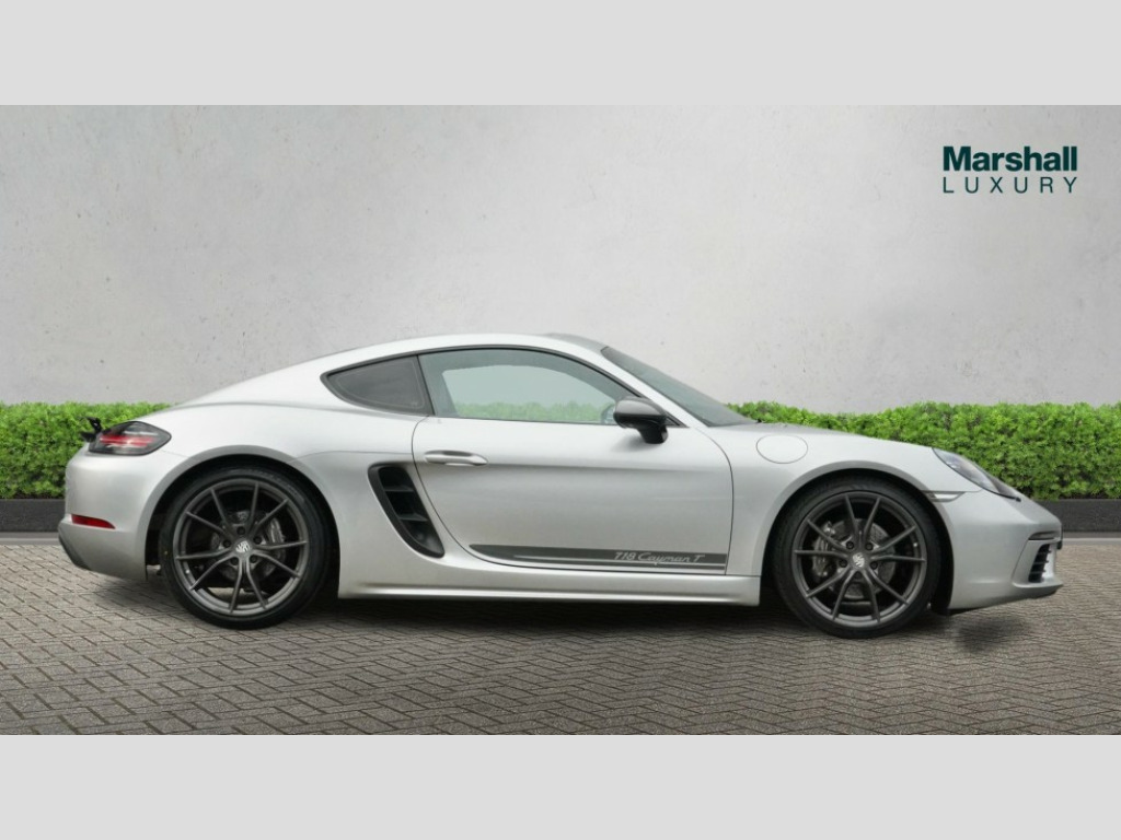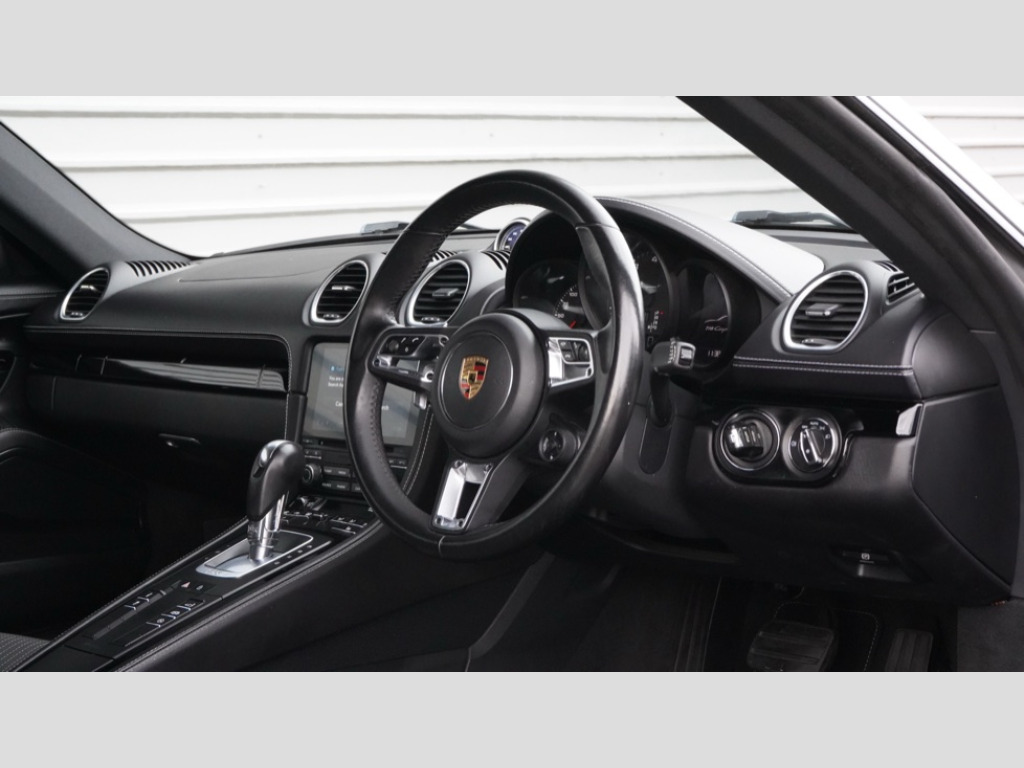 Porsche Cayman 2.0 T 2dr PDK Digital displays for vehicle speed, chosen gear, odometer, trip odometer and clock, Instrument cluster with central rev counter and high-resolution 4.6 inch colour display, 4 valves per cylinder, Aluminium block and cylinder heads, Direct fuel injection (DFI), Gasoline particulate filter, Integrated dry-sump lubrication with an on-demand oil pump, Porsche Active Suspension Management (PASM) sport suspension with lowered 20mm ride height, Porsche Doppelkupplung (PDK), Porsche Stability Management (PSM) with ABS, advanced brake functions, Porsche TORQUE Vectoring (PTV) with mechanical rear differential lock, Rear wheel drive, Turbocharger with intercooler, Two seater vehicle with mid mounted engine, Two three-way catalytic converters and on-board diagnostics for monitoring emission control system, VarioCam Plus variable valve timing and switchable valve lift, Water cooled with thermal management, Integrated 4G/LTE compatible SIM including data for the Porsche Connect Services, Integrated compatible SIM including Porsche Connect Services, Wifi and music streaming, 718 Cayman T stripes in agate grey, Automatic headlight activation including welcome home lighting, Automatically extending rear boot spoiler, Body colour bumpers, Body colour door handles, Door pull loops in black, Electrically adjustable heated exterior mirrors on door waist rails, aspherical on driver's side, Green tinted heat insulating glass, Heated rear windscreen, Intelligent lightweight body in Aluminium/Steel composite construction, Mirror upper trims painted in agate grey, Power windows with one touch operation and door seal protection, Separate auxiliary lights in the front end with LED indicators and position lights, Top tinted windscreen, Twin tract sports exhaust system with black central twin tailpipe in stainless steel, Wide opening rear hatch with heated screen, Windscreen washer system with two wiper speeds and washer jets, 12V sockets in passenger footwell, Adjustable fan with air recirculation and defroster functions, Clothes hooks on front seat backrests, Elevated centre console with uncovered storage compartment and closed storage compartment, Footwell illumination, Front and rear luggage compartments, Front headrests, Gloss black interior door handles, Heated seats, LED reading lights, orientation, ignition lock, additionally luggage compartment and glove compartment lighting, Lockable glovebox, Porsche logo in high gloss silver colour, Seat centres in sport tex, side bolsters and headrests in leather, SPORT button to activate dynamic driving settings for engine, transmission (with PDK), Storage compartments in each doors, Two individual cup holders (integral to dashboard trim strip), Sport chrono pack - Cayman, 3 point automatic seatbelts, ASR, Electrically controlled parking brake, Front and rear lightweight spring strut axle, Front seatbelt pretensioners + load limiters, Full size driver and passenger airbags, Passenger airbag deactivate switch, Porsche side impact protection doors with thorax airbag in outer backrest side bolster and head airbag for driver/passenger in door panel, Tyre pressure monitoring system, Alarm system with interior surveillance, Auto start/stop function including coasting (in connection with PDK), Engine immobiliser with in key transponder, central locking and remote control, High gloss black interior trim, Tyre sealing compound and electric air compressor kit