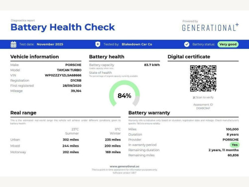 2020 70 Porsche Taycan Performance Plus 93.4kWh Turbo Auto 4WD finished in a beautiful combination of Dolomite Silver Metallic with Two-Tone Black/Chalk Beige Smooth Finish Leather Interior. 39200 miles covered and supported with Porsche main dealer service history (Minor 2022, Major 2024) with next not due until 2026. Supplied with all correct documentation, handbooks etc and subjected to our usual strict pre delivery inspection and preparation process ensuring all cosmetic and mechanical elements are in good order. Battery health check completed and copy provided (see final photo) and battery warranty in place until 2028 or 100,000 miles. Presented excellently with unmarked alloys/bodywork and lightly used, well kept interior. This example is boasting the most incredible factory specification weve seen on any Taycan to date with an extensive list of options fitted from new. This impressive list includes: Burmester High-End 3D Surround Sound System, Rear Axle Steering including Power Steering Plus, Passenger Display, Fixed Glass Panoramic Roof, LED Matrix Main Headlights in Glacier Ice Blue Including Porsche Dynamic Light System Plus, Seat Massage Function - Front Including Seat Ventilation, Interior Package - Carbon, Night View Assist, Sport Chrono Package, Mobile Charger Connect, Porsche InnoDrive including Adaptive Cruise Assist, Heated Multifunction GT Sports Steering Wheel Leather with Matt Carbon Panel, Powered Charging Port Cover, 21in Alloy Wheels - Taycan Exclusive Design with Aeroblades in Carbon, Electrically Folding Exterior Mirrors, Lane Change Assist, Seat Belts - Slate Grey, Porsche Electric Sport Sound, ParkAssist Including Reversing Camera, 150kW DC On-Board Booster, Mobile Charger Connect, Side Window Trims - Black High Gloss and Privacy Glass. , DELIVERY: Nationwide delivery available. The first 100 miles are free of charge (driven delivery). Thereafter, delivery is charged at £1.99+vat per mile. Please contact us for further details or a personalised quotation including trailered delivery options. , PAYMENT: We accept debit card payments for amounts up to £500. For payments exceeding this amount, we accept BACS (bank transfer) only. Please ensure that funds have cleared prior to vehicle collection as we are unable to release vehicles without cleared funds.If you intend to pay via online banking on the day of collection, please bring any necessary devices or security tools (e.g. secure keys, card readers, etc.) required to complete your transfer. We also accept cash payments up to £9,000, subject to a 2% banking fee. Please note that a £250 administration fee applies to all purchases funded through third-party finance providers. , NOTICE: Every effort is made to ensure the accuracy of our advertisements and vehicle specifications. However, occasional human or system errors may occur. We therefore recommend verifying all details prior to purchase.