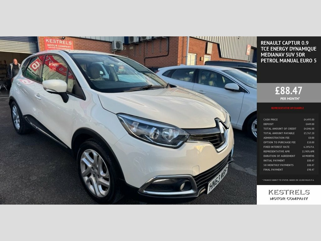 This 2013 Renault Captur TCe ENERGY Dynamique MediaNav stands out with its remarkably low mileage for its age, having covered just 72,429 miles. This petrol 0.9L model, registered in 2013, comes with a 3 month warranty for your peace of mind. It also benefits from a 12 month MOT provided on purchase, ensuring its roadworthiness. The last service was completed on 05 January 2026 at 72,425 miles, indicating a well maintained vehicle. The Dynamique MediaNav trim offers a host of convenient features, including a Handsfree Keycard with Push Button Start-Stop Function and Keyless Entry, allowing for effortless access and ignition. Stay connected on the go with Bluetooth Connectivity, while the Climate Control with Air Quality Regulator and One Touch Demist Function ensures a comfortable cabin environment. Automatic headlights add to the ease of driving. This Captur also boasts impressive fuel economy, achieving 58 mpg, and is in a low insurance group with low CO2 emissions, making it a more economical choice compared to similar vehicles. Part exchange welcome, finance arranged. 12V Power Socket, 17in Alloy Wheels - Explore in Silver, 2x Storage Spaces for 2 Cups and Miscell, 4x20w Radio with Handsfree Technology an, 7in Touch Screen, ABS - Anti Lock Brakes, Air Vent Surrounds - Chrome Gloss, Airbags - Driver, Airbags - Front Lateral, Airbags - Front Passenger, Airbags - Front Passenger Deactivation, Airbags - Side, Airbags - Thorax, Automatic Windscreen Wipers with Rain Se, AUX Input, Bluetooth Connectivity, Bumpers - Body Coloured, Centre Console Surrounds - Chrome Gloss, Climate Control with Air Quality Regulat, Closeable Storage - Dashboard - 1.6L, Cornering Lights, Cruise Control with Speed Limiter, Daytime Running Lights - LED, Deadlocking, Door Handles - Body
