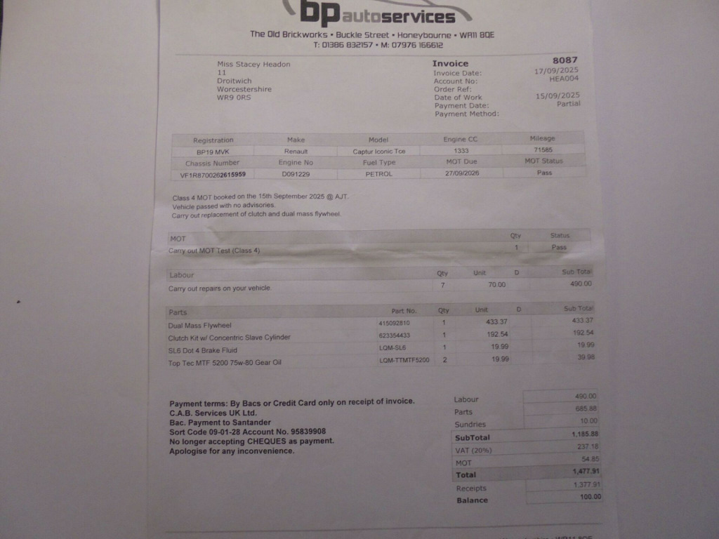 This 2019 Renault Captur TCe ENERGY Iconic offers a superb blend of style and practicality, making it an excellent choice for those seeking a reliable and feature packed compact SUV. Powered by an efficient 1.3 litre petrol engine and meeting Euro 6 emissions standards, this Iconic trim level provides a comfortable driving experience. Keyless entry with a key card and start button allows for effortless access and ignition, while the automatic climate control with a one touch demist function ensures a pleasant cabin environment in all conditions. Manoeuvring is made simpler with rear parking sensors, and the MediaNav multimedia system, complete with Bluetooth connectivity, keeps you entertained and connected on every journey.This Renault Captur stands out with its impressive fuel economy, achieving a highlight of 44 miles per gallon, which indicates it is more economical than many similar vehicles. Furthermore, its low insurance group rating suggests that running costs will be kept to a minimum, offering further savings. The low CO2 emissions also highlight its environmental consideration compared to other cars in its class. 6 Services. 2 Keys. ULEZ FREE !!!!!!!!!. Out Of Hours Enquires Please Ring 07850 504619 tomatic folding door mirrors, 12v power socket, 17in alloy wheels - explore - black inserts, 3x - rear headrests, abs with eba - emergency brake assist, airbag - de-activation for front passenger, automatic climate control with one touch demist function, automatic headlights and rain sensitive front wipers, chrome exterior touch pack, closable storage on top of dashboard, cruise control with speed limiter, dark harmony - dashboard and side panels, deadlocking, door handles - body coloured - front, door mirrors - heated and electrically adjustable - manual folding, driver and passenger front - side airbags, driver and passenger lateral head-thorax airbag, ebd - electronic brake distribution, eco mode function, esc - electronic stability control, electric windows - front and rear, extra tinted windows - rear and tailgate, front door storage compartment, front and rear daytime running lights - led, front and rear seatbelt unfastened warning sound, hsa - hill start assist, hands free access with key card and start button, heating system with pollen filter, isofix child seat fixing points on front passenger and rear outermost seats, interior touch pack - chrome, led front fog lights, lightly tinted windows, medianav multimedia system, new generation height adjustable srp front headrests, raid - renault anti intruder device - automatic door locking, rear door storage compartment, rear parking sensors, rear seats - 40-60 split folding rear bench, remote central locking with thatcham approved immobiliser - thatcham cat 2, reversible boot floor, safety lock - rear doors, seats - drivers height adjustment, skid plates - front and rear, split-level boot floor, steering wheel - height and reach adjustable, steering wheel - synthetic leather, storage - front glovebox, storage between front seats, storage space near handbrake, trip computer, tyre inflation kit, tyre pressure warning light, usb socket and jack, variable power assisted steering - electrical