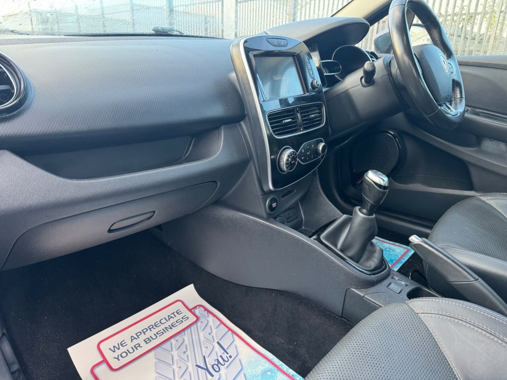 This 2017 Renault Clio 0.9 TCe Signature Nav Hatchback with a manual transmission is a sleek and efficient vehicle with just 72127 miles on the clock. Powered by a petrol engine, this Euro 6 compliant car boasts ULEZ compliance . With 5 seats and 5 doors, it provides ample space for passengers and cargo. The interior is equipped with luxurious features including titanium trim, a 1.2L storage shelf above the glovebox, 2 storage spaces for cups and miscellaneous items near the handbrake, a 4L front glovebox, and a front centre armrest with a storage compartment. Ideal for city driving, this hatchback is also a practical choice for everyday use. Don't miss the opportunity to own this stylish and reliable Clio. 2l storage shelf above glovebox, 2 storage spaces for 1 cup and miscellaneous items near handbrake, 4l front glovebox, armrest - front centre with storage compartment, automatic climate control with one touch demist function and air quality regulator, dashboard - soft touch dark carbon, headrests - rear x3, heated front seats, heating system with pollen filter, passenger height adjustment seat, rear seats - 60-40 split and fixed base, seats - drivers height adjustment, single rear fog light, steering wheel - full leather, steering wheel - height and reach adjustable, windscreen wipers - variable speed, 12v power socket, techno pack, techno pack premium, usb socket and jack, 17in alloy wheels - black, bumpers - body coloured, chrome window surrounds, clio inscribed under renault diamond badge, electric windows - front and rear, exterior chrome touches - front grille strips - boot lid strip and side door, exterior door handles - body coloured, exterior door mirrors - body coloured - heated and electrically adjustable and folding, exterior rear hidden door handles, lower door protector - black gloss with chrome insert, rear spoiler - body coloured, tyre inflation kit, abs with eba - emergency brake assist, airbags - deactivation - front and side - driver and passenger, anti drill door locks and locking fuel cap, anti-pinch function on front electric driver window, deadlocking, driver seat belt height adjustable, driver and passenger front - side - head and thorax airbags, ebd - electronic brake distribution, esc - electronic stability control, etc - electronic traction control, front and rear no seatbelt warning sound, hsa - hill start assist, handsfree keycard with push button start-stop function, isofix child seat fixing points on rear outermost seats, raid - renault anti intruder device - automatic door locking, rear door and window child locking function for rear doors, rear wiper, remote central locking with thatcham approved immobiliser - thatcham cat 2, automatic headlights and front wipers, daytime running lights - led, front fog lights, headlights - full led, cruise control with speed limiter, eco mode, front dash warning indicator in case of heavy braking, gear change indicator, power assisted steering - electric variable, rear parking camera, rear parking sensors, trip computer, tyre pressure warning light